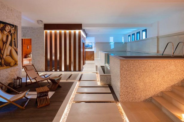 The property boasts unparalleled smart home technology, including high-security alarm systems, intelligent surveillance systems, and a drone defense system. It offers various amenities such as a massage room, steam room, sauna, jacuzzi, gym with Precor equipment, indoor and outdoor pools, and a magnificent cognac bar. Additionally, there is a cellar with a lounge bar for wine enthusiasts. The estate also features a media room, library, study, and a "safe" room.