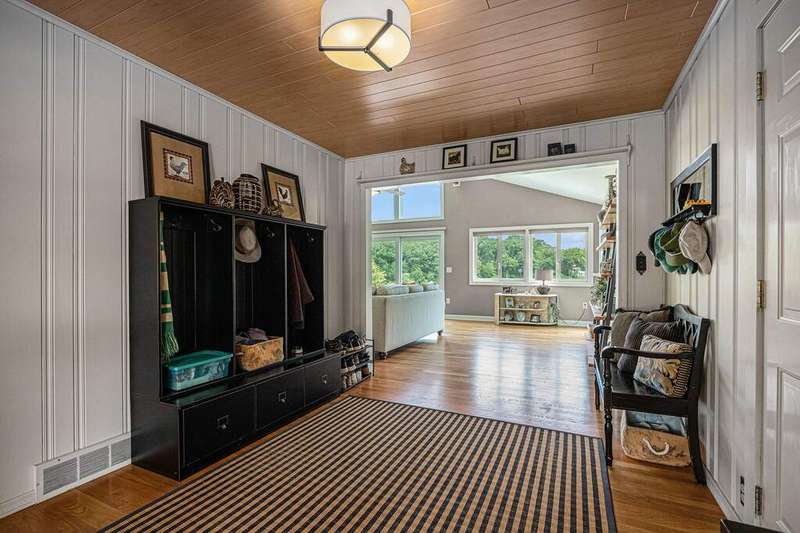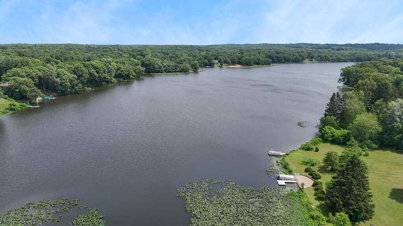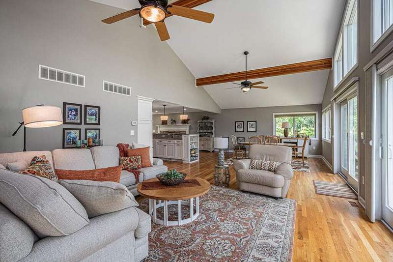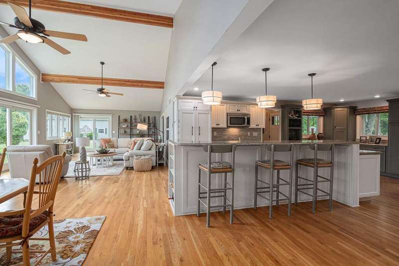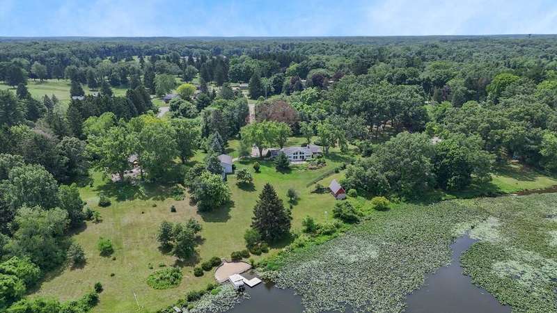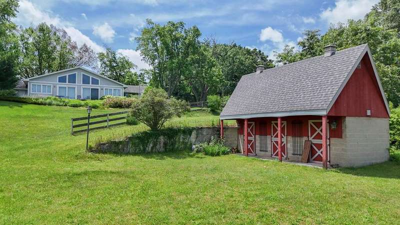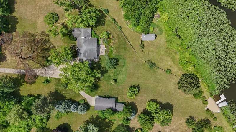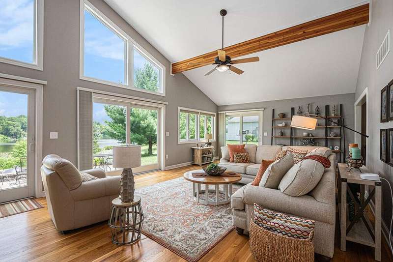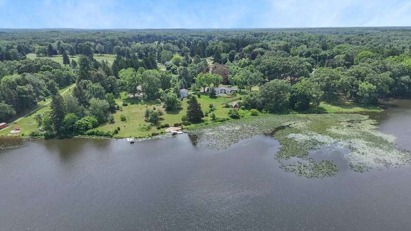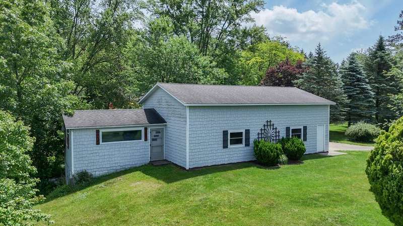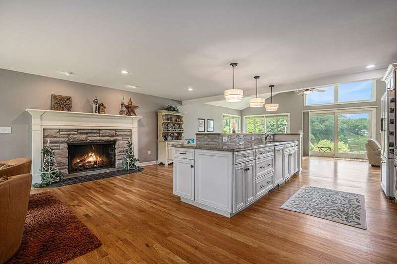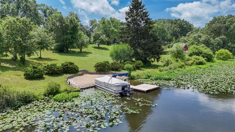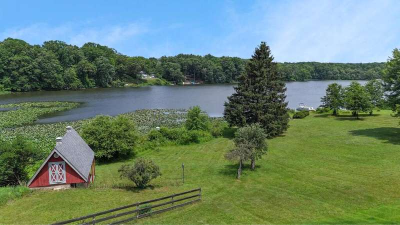 Nestled on the tranquil shores of Mill Pond, this beautifully updated 4-bedroom, 2.5-bath ranch offers peaceful views and thoughtfully designed spaces inside and out. The main level features 3 bedrooms and 2 full baths, while the finished basement (2016) adds a cozy family room, 1 additional bedroom, half bath, and laundry area. An expansive 2013 addition showcases stunning hardwood floors throughout and vaulted ceilings in the living room, framing breathtaking views of the yard and water. The kitchen is a true standout with custom Hannapel cabinetry, sleek Cambria countertops, and a gas-burning fireplace-ideal for entertaining. The entryway just off the attached garage is the perfect drop zone for busy households. Enjoy modern comforts including replacement windows throughout, fiber internet (Frontier), a newer septic system, water heater, water softener (2013), and a well installed around 2001. Outside, the owners have created a peaceful, private beach area perfect for relaxing or playing by the water. A 1200+ sqft barn provides ample storage or workspace, plus an additional shed with a newer roof (2013). Whether you're looking for a year-round residence or a peaceful getaway, this Mill Pond retreat is ready to welcome you home!