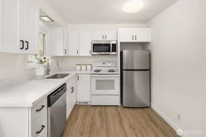 Well-maintained & updated duplex in loyal heights neighborhood. A perfect opportunity to live in upper unit & generate rental income from lower, or rent both for strong income potential. Newly remodeled upper unit has 2b/1b w/new kitchen featuring white cabinets, quartz countertops & new appliances. New bathroom w/new vanity, modern fixtures & new tub. New LVP flooring & fresh interior paint, hardwood flooring, wood-burning fireplace, in-unit W/D, gas forced air heating & double pane windows. Lower-level unit offers 1b/1b w/private entrance, full kitchen, in-unit W/D & new carpet. Enjoy fully fenced front yard & one assigned carport parking off alley. Unbeatable location, steps from transit, shops, dining, & all that Ballard has to offer.