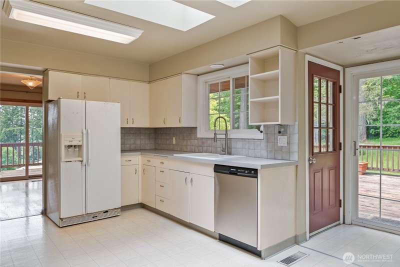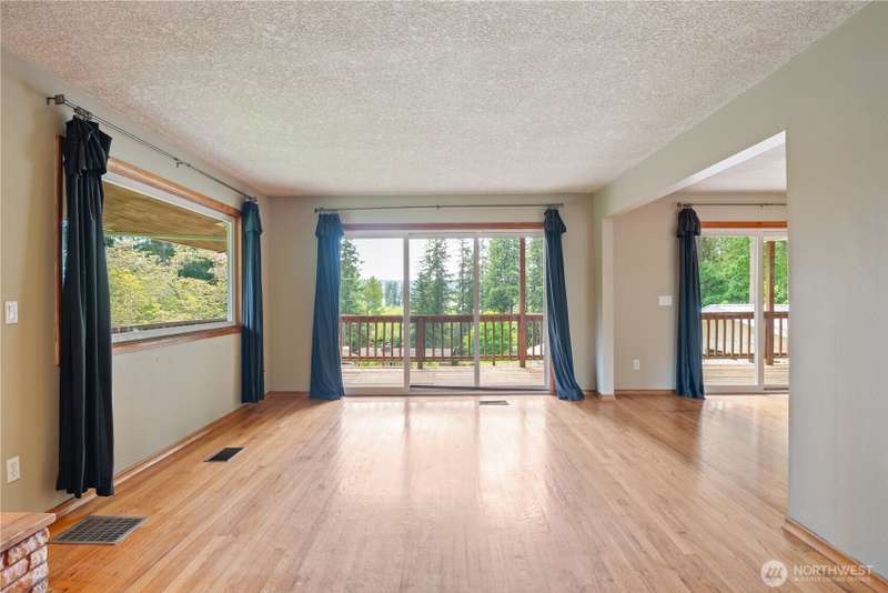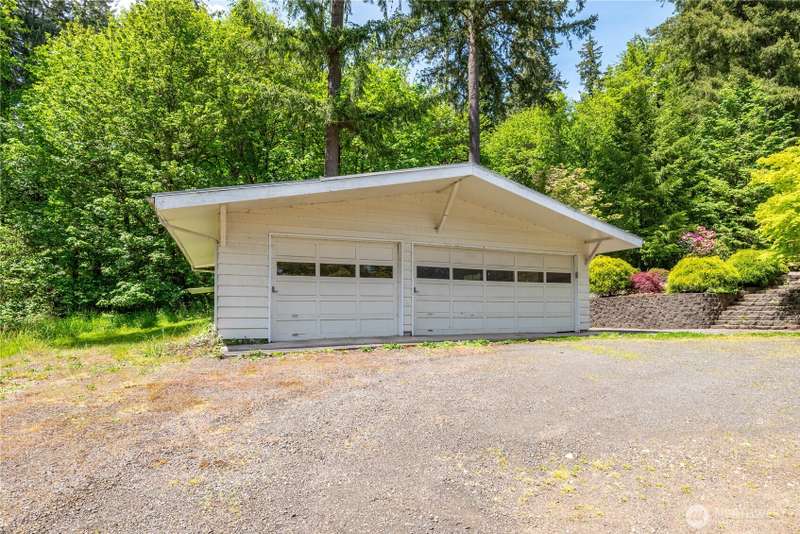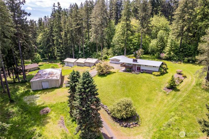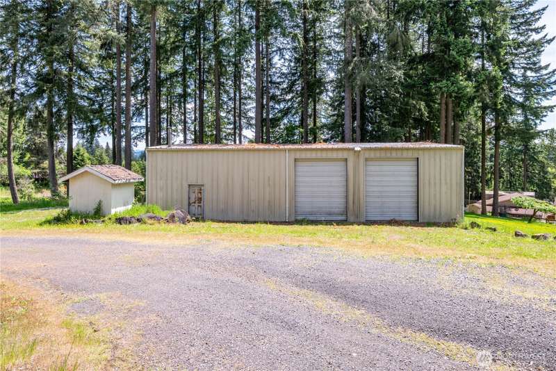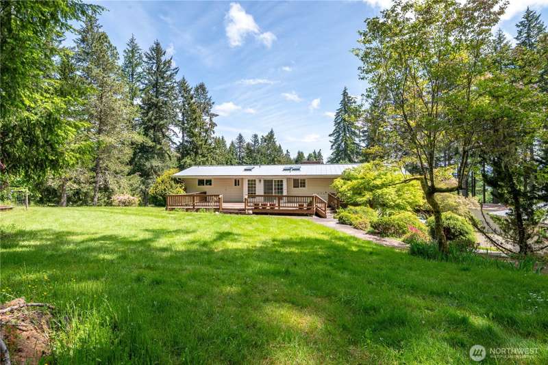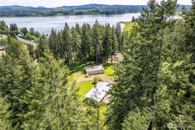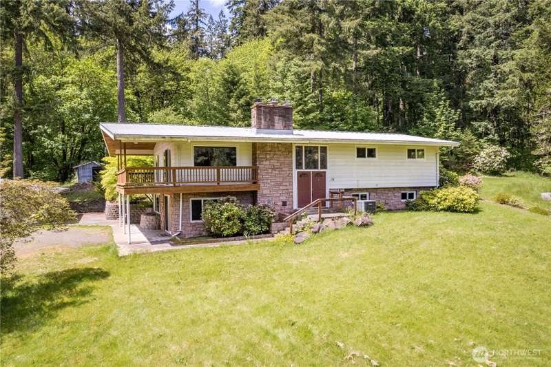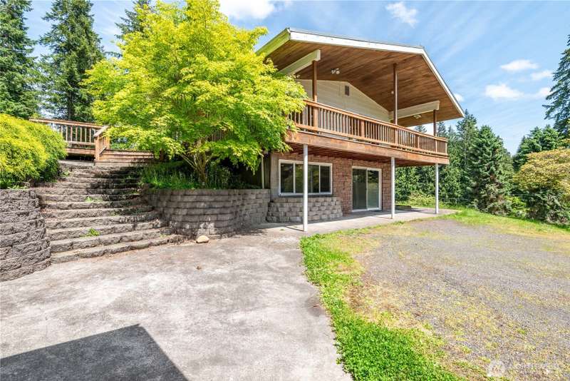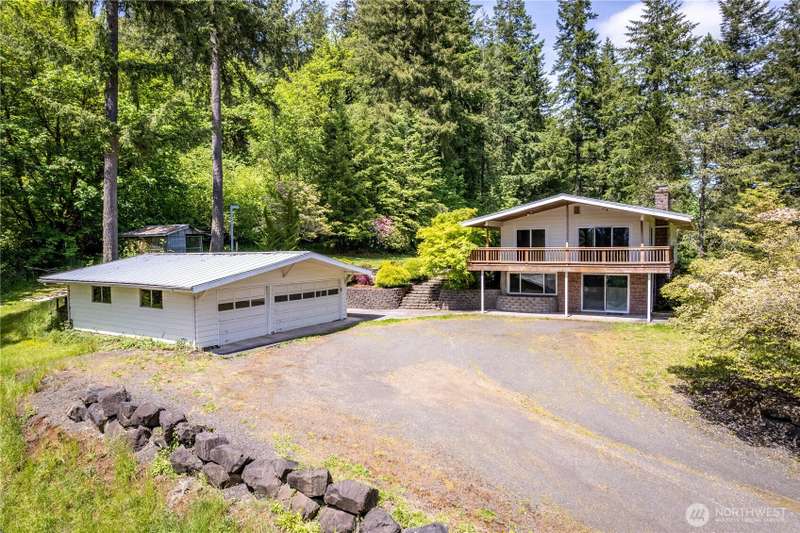 4 Bedroom, 2 bath home on 3.72 acres. Brand new septic tank. Living room w/wood burning fireplace, Hardwood flooring and upper deck overlooking Silverlake. 3 Beds upstairs, 1 bed lower level plus bonus room. Heat pump is 8 years old. Roof was replaced in September 2024. Spacious kitchen with access to back deck for entertaining. Adjacent to formal dining room with built in buffet drawers. Downstairs family room w/a second wood burning fireplace, Rec room and wet bar. 3 car garage, Large shop/barn with stalls and RV parking with septic behind shop. 2nd driveway leads to older manufactured home used for storage. Large kennel, Tool sheds, fenced garden and walking trails behind the house. Property backs up to Seaquest State Park.