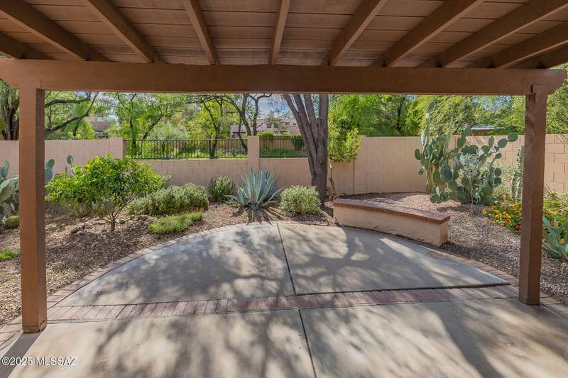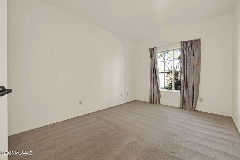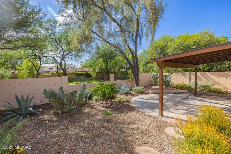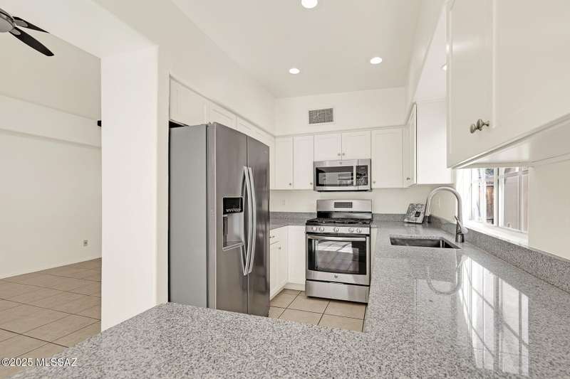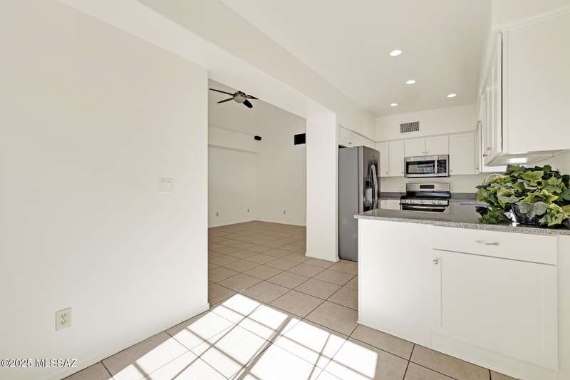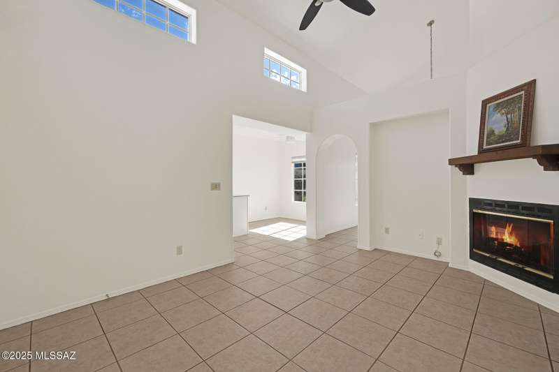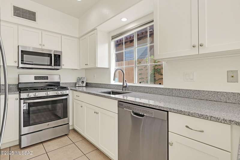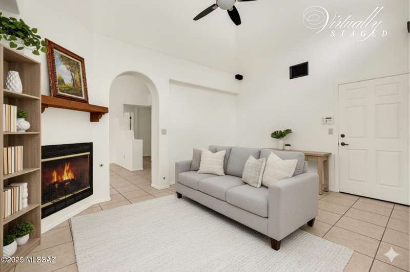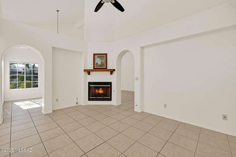 Homes in this neighborhood of Rancho Morado are rarely on the market, Quality A. F. Sterling home in enclave of pristine north central neighborhood steps away from the community pool, Riverwalk, UA, UMC, shopping and restaurants. Updated Kitchen w/ white cabinets granite counter tops, & stainless appliances. Cathedral ceilings, lots of windows for natural light, cozy gas/wood fireplace in family rm/den area, generous living room and formal dinning rm all on one level.Large primary with 2 closets. 1 closet is a walk-in, separate garden tub and walk-in shower. Private covered patio backs to lush common area, Freshly painted interior and garage. Newer Roof, Move in ready. Great location!Copper Pipes and Mountain View from 2nd bedroom/office.