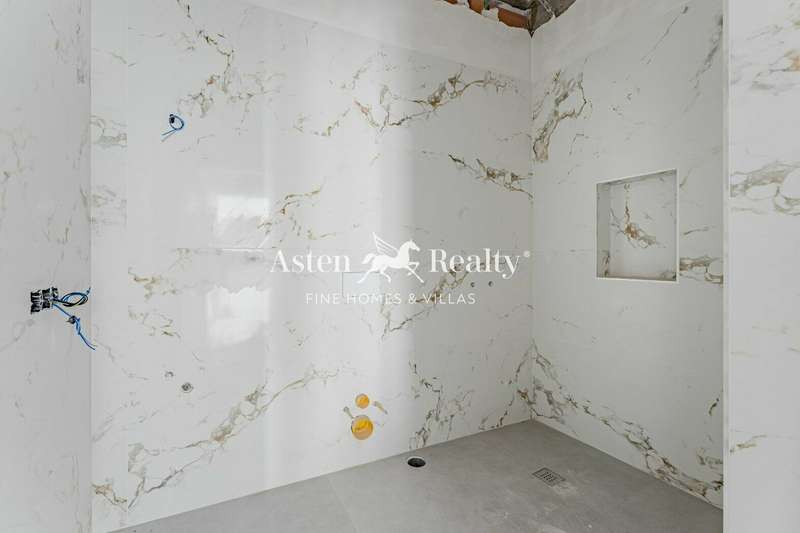 On the first floor, the master bedroom offers sea views and an en-suite bathroom. In the hallway, there is another spacious full bathroom, a walk-in closet, and two more bedrooms — one double and one single.