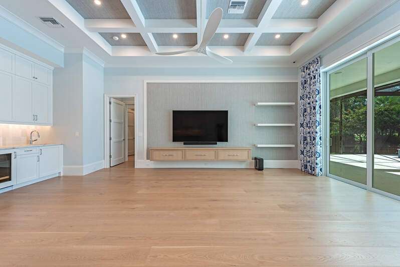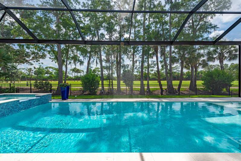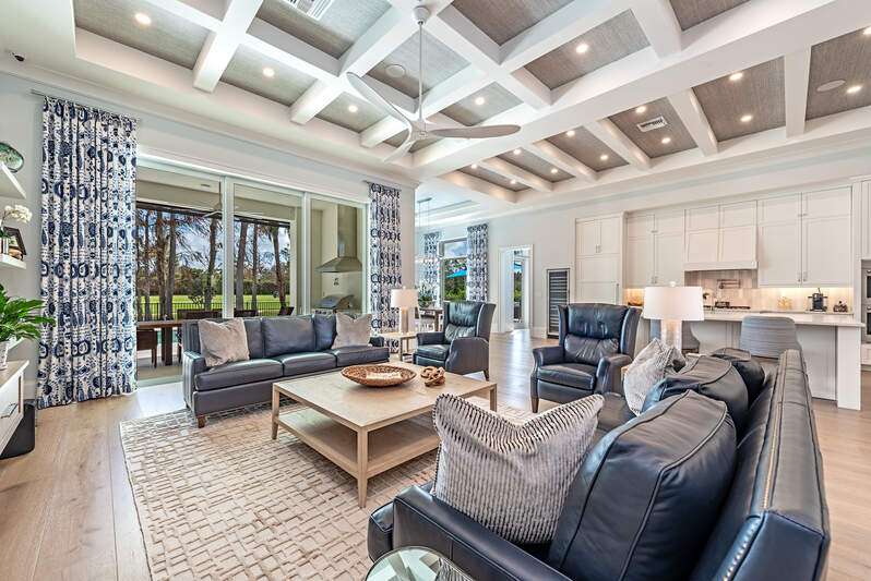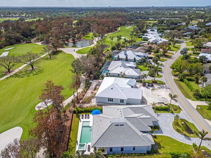 This hidden gem is centered in the heart of Naples within the coveted community of Big Cypress. It's rare to find newer construction just one mile from The Waterside Shops. Impressive ceiling heights and panoramic golf course views welcome you into this recently completed luxury home crafted by Borelli Construction. Inside you'll find the high-end finishes you expect from Borelli including custom closets, extensive trim work, detailed ceilings, as well as beautiful French white oak wood flooring and Anderson impact windows. Exquisite style abounds in this professionally decorated home that has been meticulously designed, painted and enhanced with custom window treatments and tasteful feature walls. The great-room floor plan showcases a living and dining area with beautifully coffered ceilings and luxurious window panels that frame the views onto the expansive lanai. The adjacent and well-designed kitchen is centered around a large island of natural stone. Shaker-style solid wood cabinetry and a separate pantry provide plenty of storage. Premium appliances include SubZero and Wolf, and a dual-zone wine cooler. The master suite features a spacious bedroom with sliding doors to the peaceful outdoor space. Closets are ample and the spa-like bathroom serene. The two guest bedrooms are generously sized with walk in closets and en-suite bathrooms. An additional office space, or bedroom, is located at the front of the home. The lanai is equipped with a full outdoor kitchen and plenty of room for entertaining. The heated salt-water pool and spa with sun-shelf complete the Florida lifestyle. A high-end pool enclosure with picture frame was just installed, framing the unobstructed golf course views. Custom exterior lighting, landscape improvements, a Sonos sound system, improved audio-visual equipment and garage enhancements that include built-in cabinetry, additional refrigerator and specialized flooring round out this stunning home. The community is perfectly situated in the heart of Naples with quick access to all the best in Naples beaches, shopping and dining. Social Awaiting Golf membership is available and allows for access to social activities and limited golf.