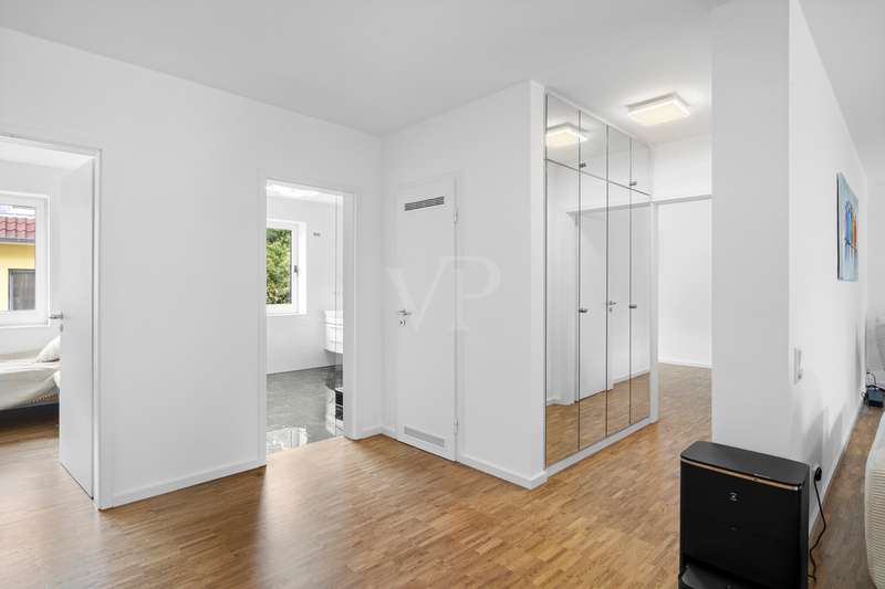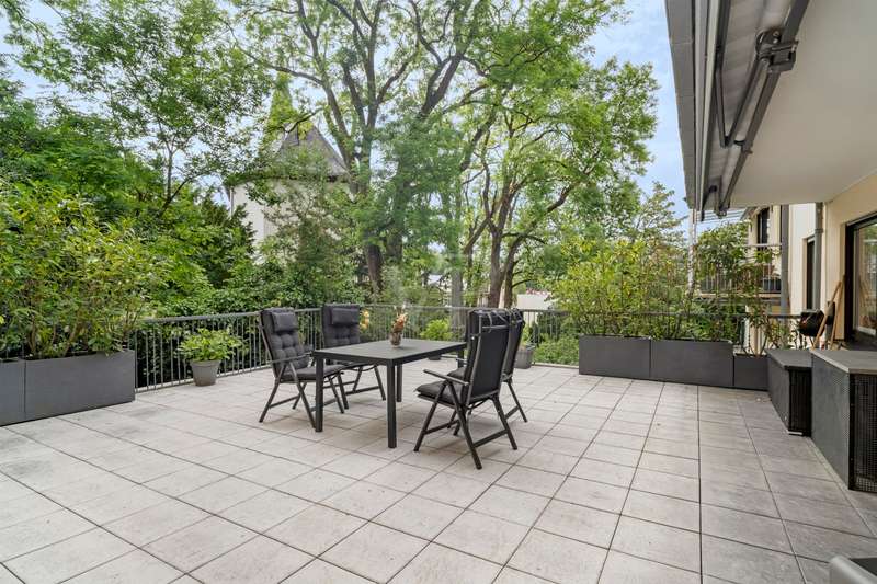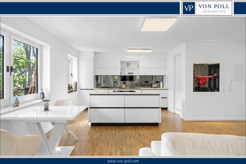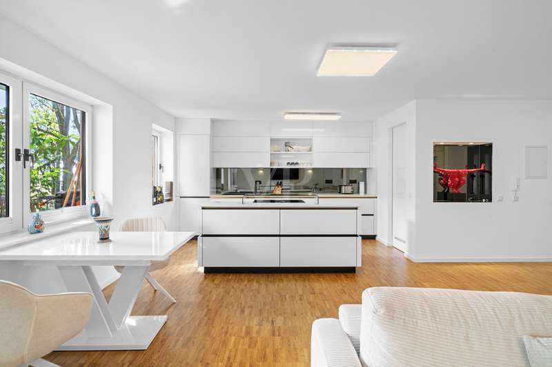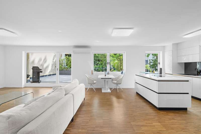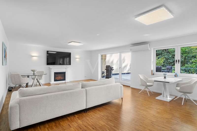 Bright, elegant three-room city apartment with large terrace and garage - centrally located, high-quality furnishings, extensively modernized and very low service charges! Are you looking for a stylish, modern city apartment in a central yet very quiet location? - with generous living comfort, high-quality furnishings and direct access to all shopping facilities? Then this special offer could be just right for you. In the heart of the city center, an exceptional condominium awaits you on the second floor of a well-kept apartment building with only eight units. The apartment offers around 114 m² of living space, an open, light-flooded room concept with a stylish ambience and numerous high-quality modernizations in recent years. A particular highlight is the large living/dining area, which is open to the hallway and impresses with its large windows and direct access to the 63 m² sun terrace with a view of the greenery. The new awning (2023) provides pleasant shade on hot days, while the water connection on the terrace makes garden maintenance easier. The high-quality fitted kitchen (2023) with Quooker blends harmoniously into the open-plan living concept and is equipped with modern electrical appliances. The newly laid parquet flooring throughout (2023) underlines the elegant living style of the entire apartment. Pleasant warmth is provided by the underfloor heating, operated by a gas-fired floor heating system (renewed in 2016), the temperature of which can be conveniently regulated in each room by radio control. The spacious bedroom offers room for a large closet and a TV connection. A new, triple-glazed window (43 dB) was installed here in 2016 - ideal for a peaceful night's sleep in the city. The daylight bathroom, which was completely modernized in 2023, impresses with its elegant marble look, new sanitary facilities and connections for washing machine and dryer on a comfortable 9 m² - so there is no need to go to the basement. There is also a practical guest WC. A further room is ideal as a children's room, guest room or study. All furniture is included in the price and can be taken over. Further features: Air conditioning in the living room (2023) Electric shutters (retrofitted in 2017) Window lamination (inside) for a modern, white appearance (2023) Class WK2 security door (2015) Renovation of the terrace and floor-to-ceiling windows/doors to the terrace (2007) Roof renovation of the building (2016) Garage with new electric door opener Dry cellar room as additional storage space This apartment combines sophisticated living comfort with stylish furnishings and a central location - perfect for anyone who wants to combine urban living with generous open space and peace and quiet in the countryside.