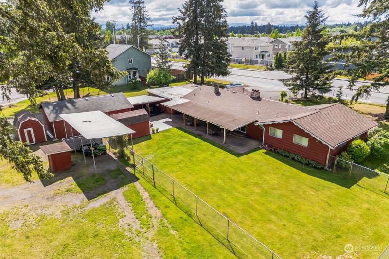 Development opportunity on 1.33 acre parcel zoned NCOR (Neigh Corridor) density class allows 8-33 connected townhomes,6 lot short plat,25 unit apt complex. See PC Codes PCC 18A.15.020. Currently a 4 bed/1.75 ba SFR w 4 yr old roof, 2 yr old appliances, Magnatite extra insulated windows throughout, connected office,30x30 work space w commercial sinks, new roll up door, and potential completion for ADU, separate 20x30 storeroom w/LED and commercial power. Home and all buildings are well insulated for commercial use and quiet-no street noise! 40 ft wide sweeping driveway for easy ingress/egress. Gated vehicle access on front + 26th side. Fully fenced rear yard w huge covered stamped concrete patio. 2 septic systems, 40 ft well AND city water.