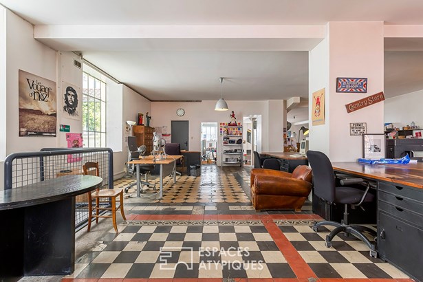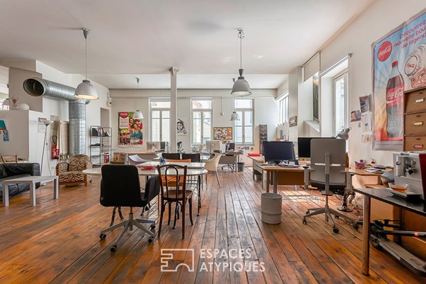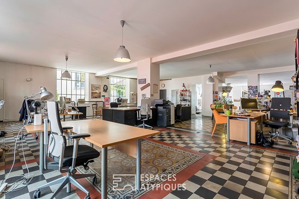 The private staircase leads to a superb open space bathed in light thanks to some industrial glass roofs and numerous windows overlooking the calm of the courtyard. Period tiles and floors, half-landings, niches, pillars and other fittings bring all the character of the old. The main floor consists of a large, bright living room with high ceilings, an archive room, a meeting room with two large windows, and an executive office with a view of the rooftops. Separate toilets with a washbasin and a small window.