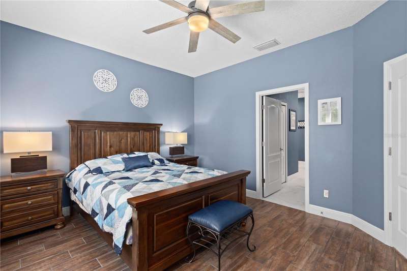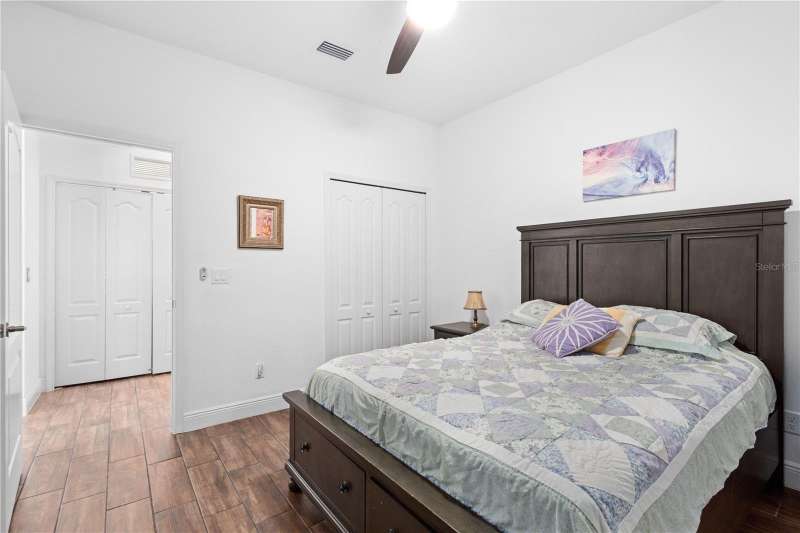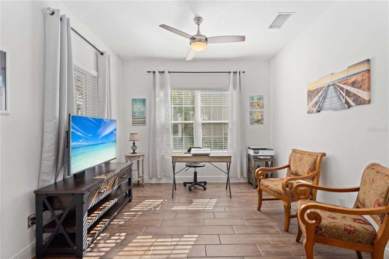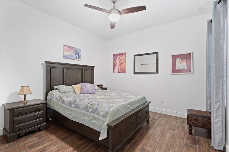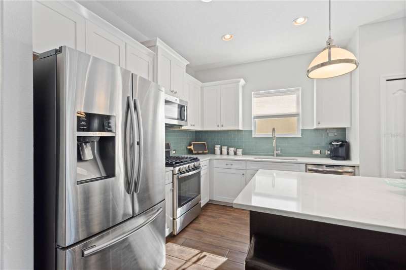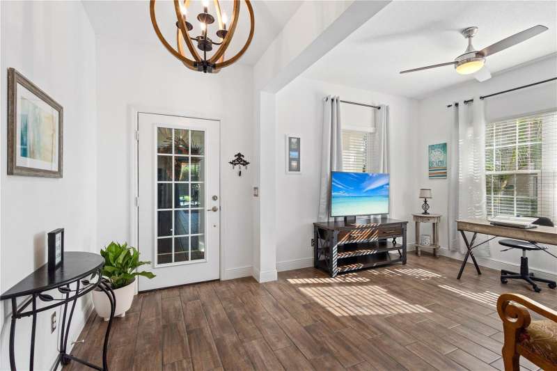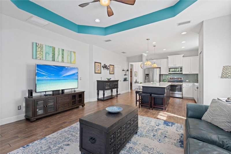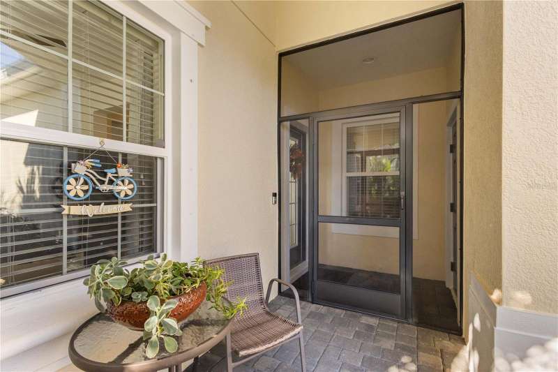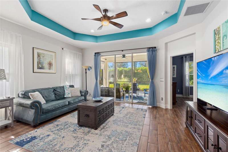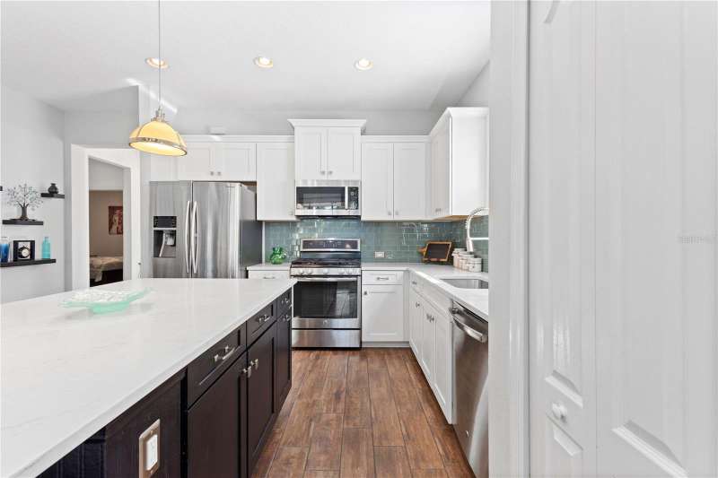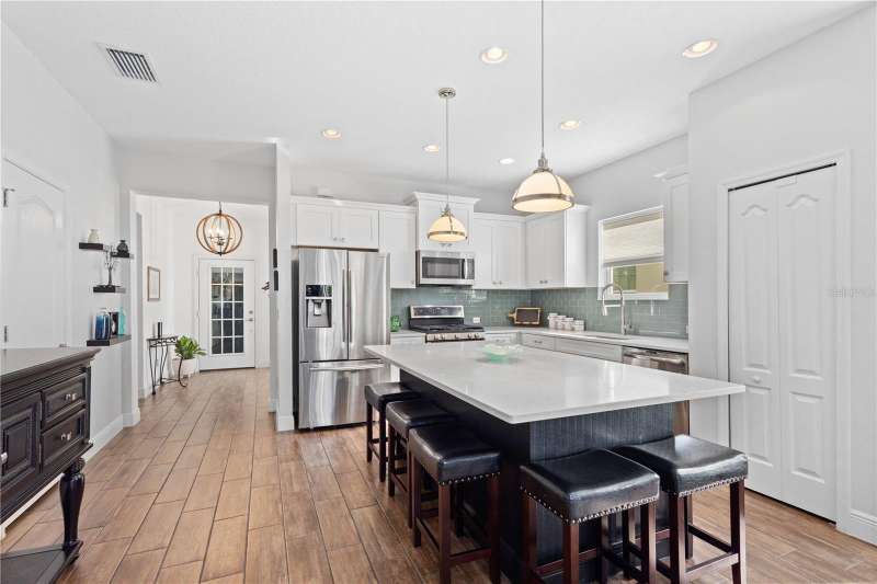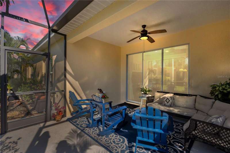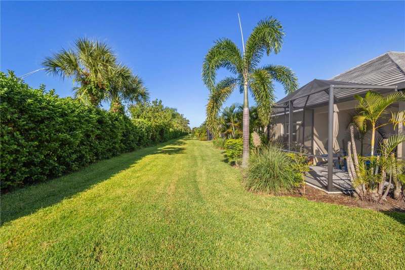 Under contract-accepting backup offers. Nestled in the gated community of Eagle Trace, this 2 bedroom, 2 bath villa invites you in with its bright and seamless design. A screened-in entryway with a glass front door welcomes you inside, where you’re greeted by a versatile area that can serve as a formal dining room, home office or den. The kitchen then takes center stage with its large island offering plenty of storage, gleaming quartz countertops, a stylish glass tile backsplash, and a gas range that makes cooking a joy. From here, the layout flows effortlessly into the living area, where natural light pours in through the windows and highlights the wood-look flooring that extends throughout the home, creating a warm and cohesive feel with a seamless connection to the outdoors. Step outside to the extended lanai, where you’ll enjoy beautifully landscaped surroundings and plenty of room to relax or entertain. The split floor plan provides privacy with the primary suite tucked away as a true retreat, complete with a modern walk-in shower. Towards the front of the home, a second bedroom and full bath offer flexibility for guests or additional flex space. With its thoughtful updates, welcoming layout, and low-maintenance lifestyle, this is the perfect place to call home, whether for everyday living or a seasonal escape. Eagle Trace offers resort-style amenities including a community pool, spa, tennis courts, dog park, and gathering spaces, all in a prime location near shopping, dining, and everything Lakewood Ranch has to offer. And, no CDD fees!