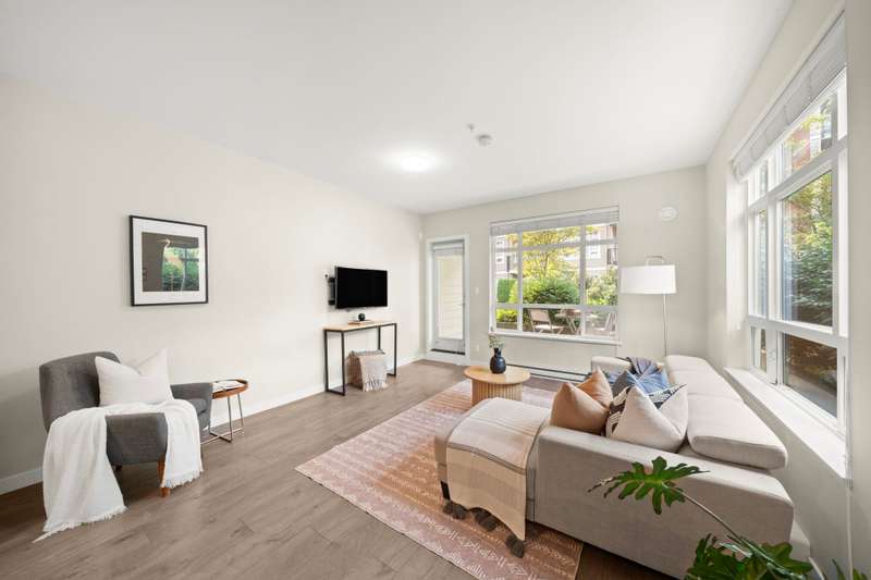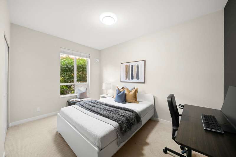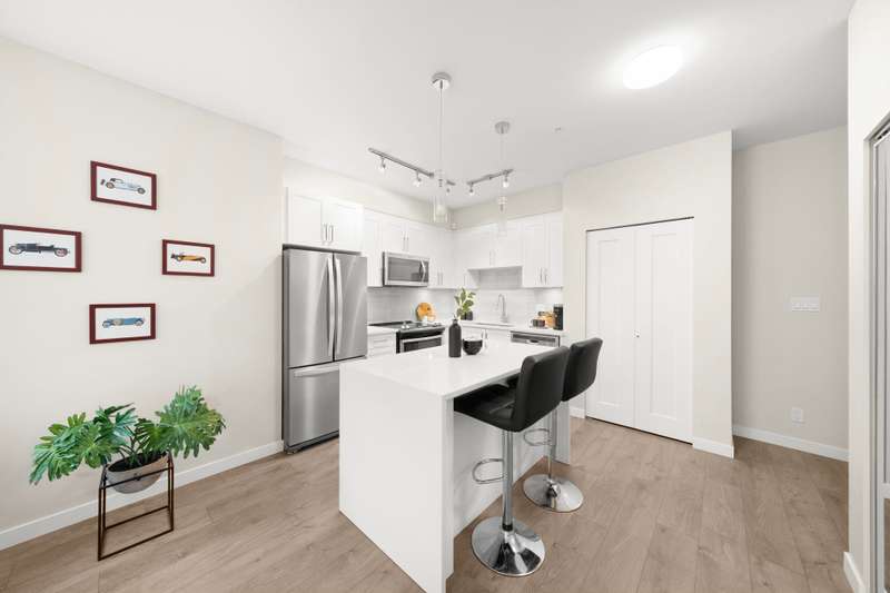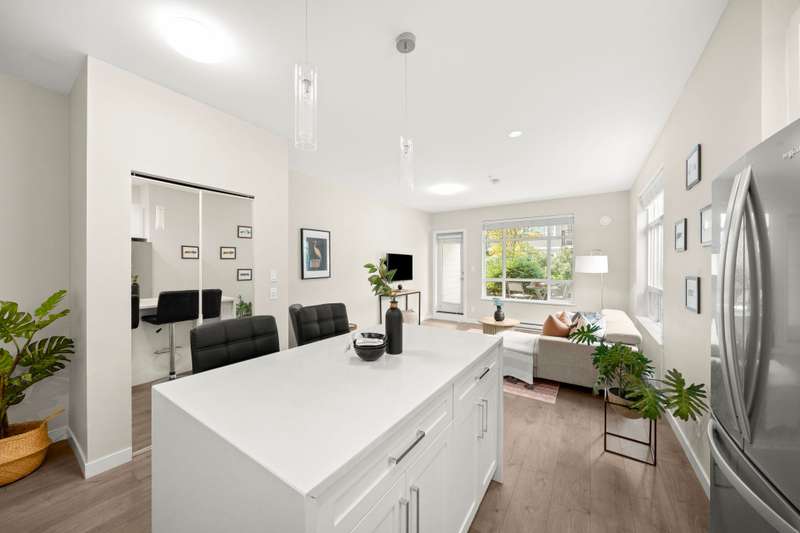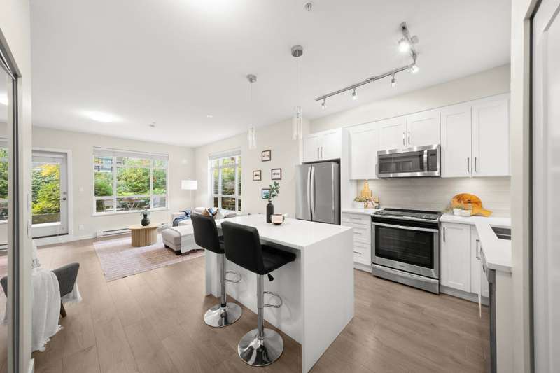 This ground-floor corner unit at Elements offers a rare combination of privacy and convenience. Contemporary finishes flow throughout, and the oversized covered patio is perfect for morning coffee or year-round entertaining. The home includes two parking stalls and provides access to exceptional amenities, including a gym, lounge, party room, billiards, media room, and children’s play area. Ideally situated within walking distance to shops and dining, with easy access to major commuter routes.