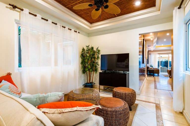 The open-concept great room features high ceilings and connects seamlessly to a large, covered balcony—perfect for entertaining, dining al fresco, or simply relaxing in the warm tropical breeze. The modern kitchen is outfitted with granite countertops and stainless steel appliances, while the living area offers a dedicated TV space with a sofa bed for guests. Each bedroom includes a private en-suite bathroom and walk-in closet, offering privacy and comfort.