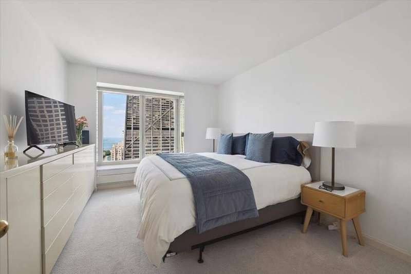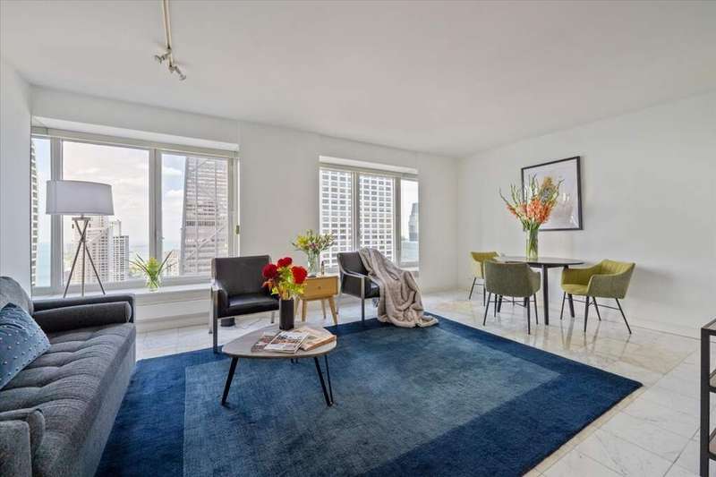 One of Chicago's most sought-after addresses, 161 E Chicago Ave offers this premier and rarely-available G Tier, one-bedroom residence with unmatched views. Inside, oversized, north-facing windows capture a stunning panorama of the John Hancock Building, Oak Street Beach, Water Tower Place, and Lake Michigan. The open living and dining area is designed around these skyline vistas, with marble tile flooring adding elegance throughout. The kitchen is thoughtfully refined, equipped with stainless steel appliances, dishwasher, garbage disposal, and an in-unit washer/dryer for everyday ease. The spacious primary suite serves as a serene retreat with a custom walk-in closet and a beautifully integrated built-in system providing abundant storage. The well-appointed bath features a generous vanity, marble finishes, and a jetted soaking tub/shower combination with a handheld sprayer. Abundant storage is found in the hall featuring coat and linen closets which ensure the home is as functional as it is stylish. Beyond the residence, the building itself delivers an unparalleled lifestyle. Rising 63 stories with only 291 homes, 161 E Chicago offers a level of exclusivity rarely found in the city. Five-star amenities include 24-hour concierge and door staff, two fitness centers, an indoor pool and spa, a rooftop deck, and an expansive lounge for entertaining. On-site parking is available for lease, and the building is pet-friendly, welcoming both cats and dogs. Located just off the Magnificent Mile, this home is positioned at the very center of Chicago's best: steps from luxury shopping, fine dining, and the lakefront path.