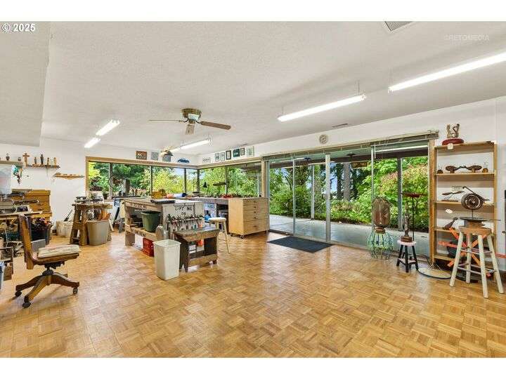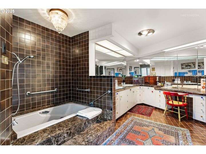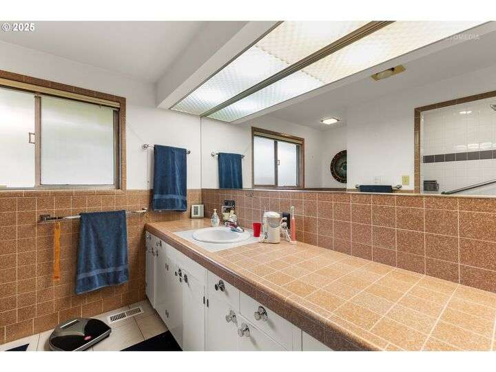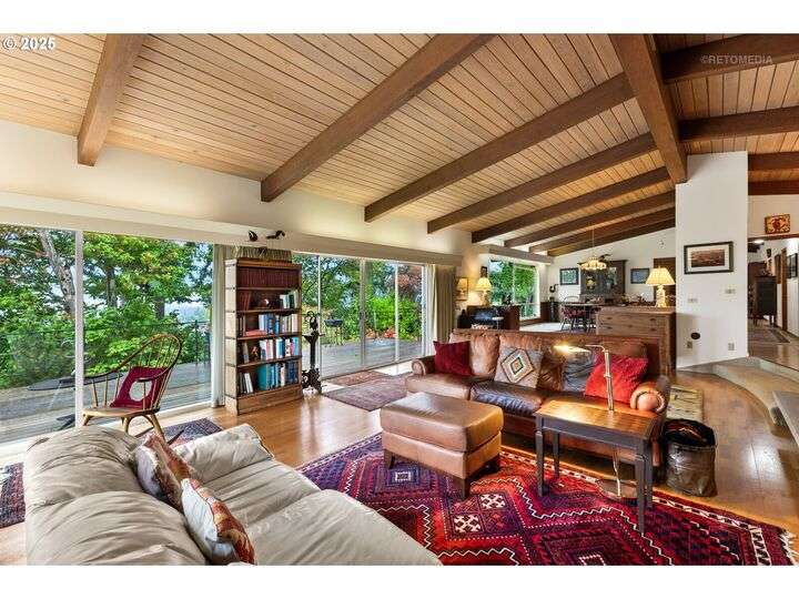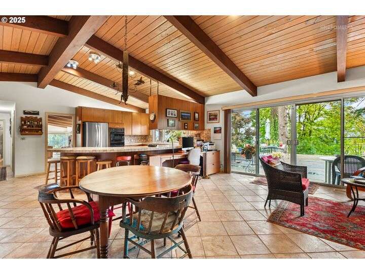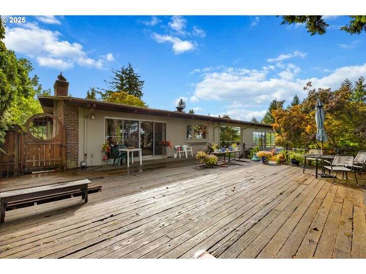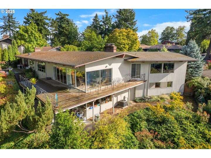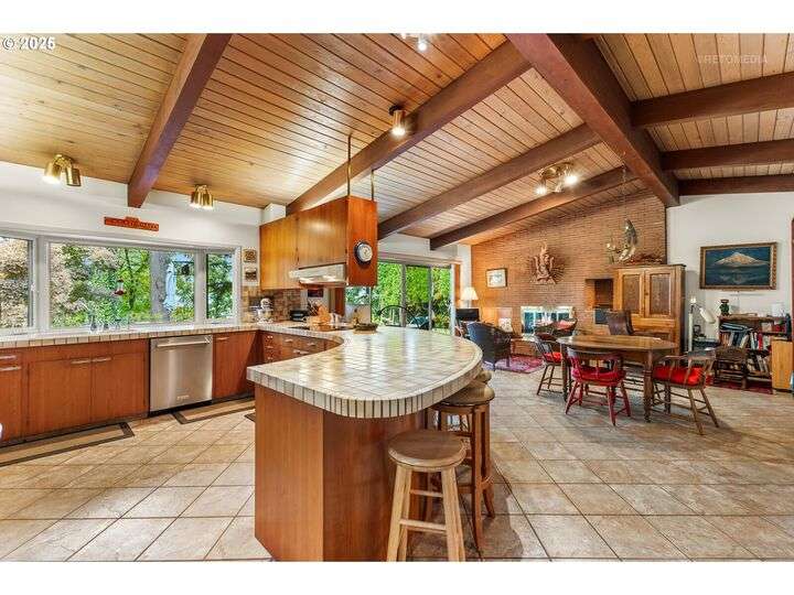 An opportunity to restore and celebrate true-mid-century design. This nearly all-original 1960 custom-built Atomic Ranch is mid-century magic, perched in a prime Mt. Tabor location with views that stretch from the Columbia and Willamette Rivers to the city’s bridges, airport, and twinkling skyline. Designed with timeless detail, the main floor offers true single-level living—garage to oversized primary suite. Think signature “Eichler” vibes with transom windows, post-and-beam ceilings, tongue-and-groove decking, and two full baths tucked inside the suite.Three fireplaces (one in Arizona marble), two wet bars, and walls of glass bring warmth and wow factor. The sunken living room flows seamlessly into the mahogany-paneled dining space—both framed by floor-to-ceiling windows. The kitchen + family room combo is pure retro-modern: a fireplace, indoor BBQ, wet bar, eat-in dining, and direct access to expansive outdoor spaces, including the home’s original circular concrete patio and garden below the deck space, just waiting to be rediscovered. The daylight basement is its own scene with two large bedrooms, full bath, storage galore, and a sprawling entertainment zone featuring another fireplace, wet bar, and separate kitchen space. Big windows and patio doors flood the space with light and connect to the landscaped grounds. Just blocks from the park, you’re steps from forested trails, open meadows, and sweeping views atop Portland’s iconic volcanic cinder cone. When it’s time to head out, you’re minutes from Coquine (yes, those chocolate chip cookies), Coquine Market, The Observatory, Academy Theater, and a curated mix of cafés, boutiques, and neighborhood favorites.