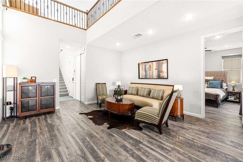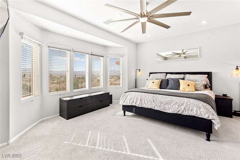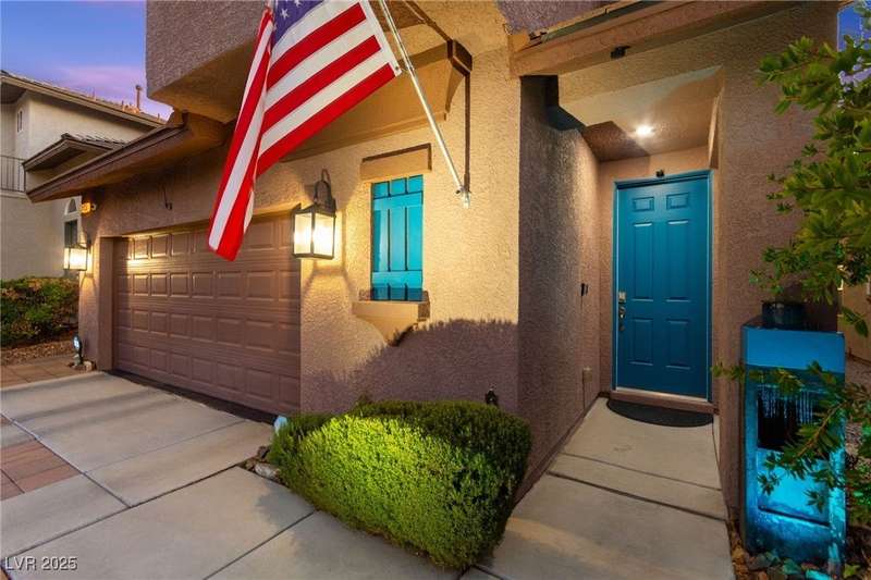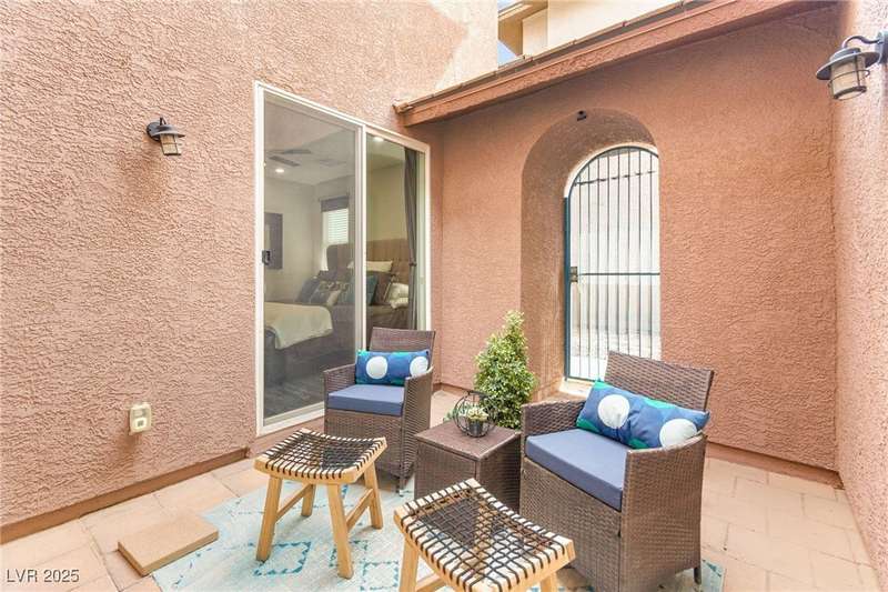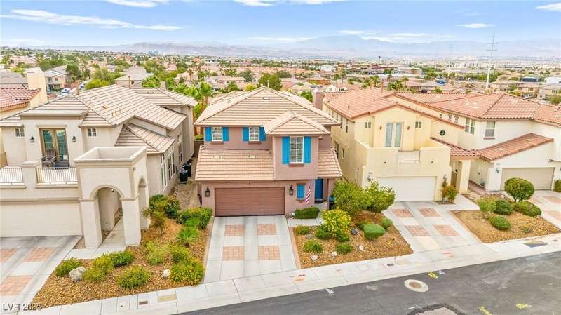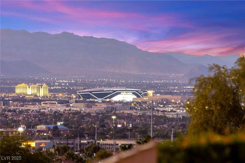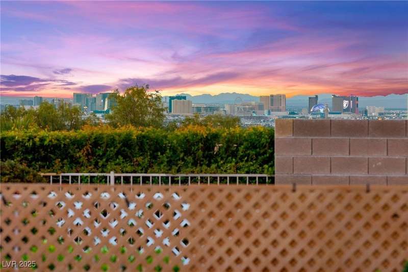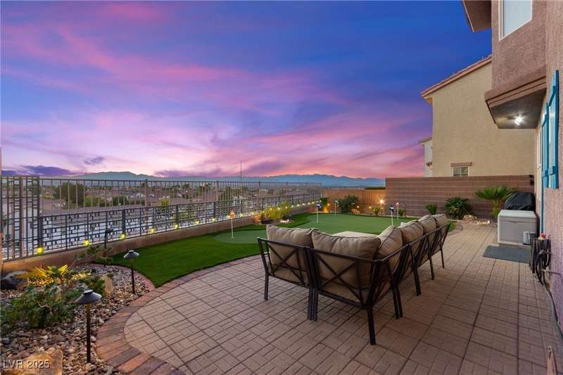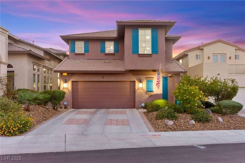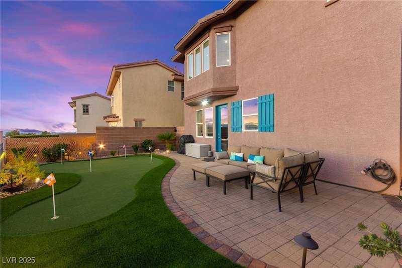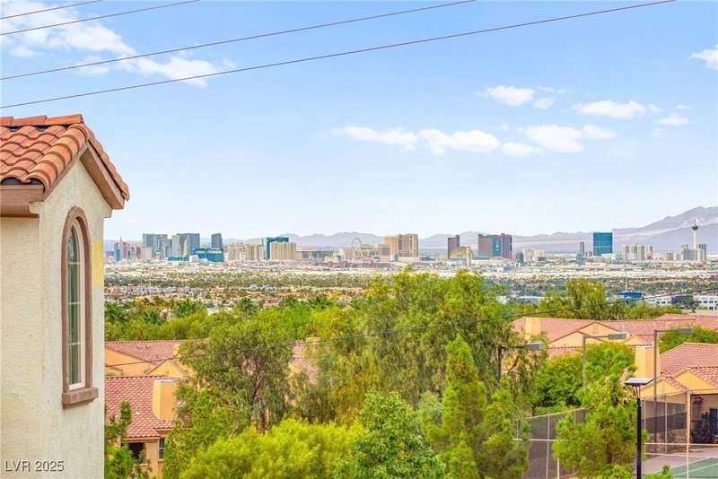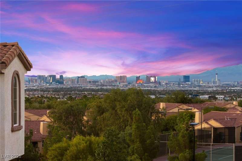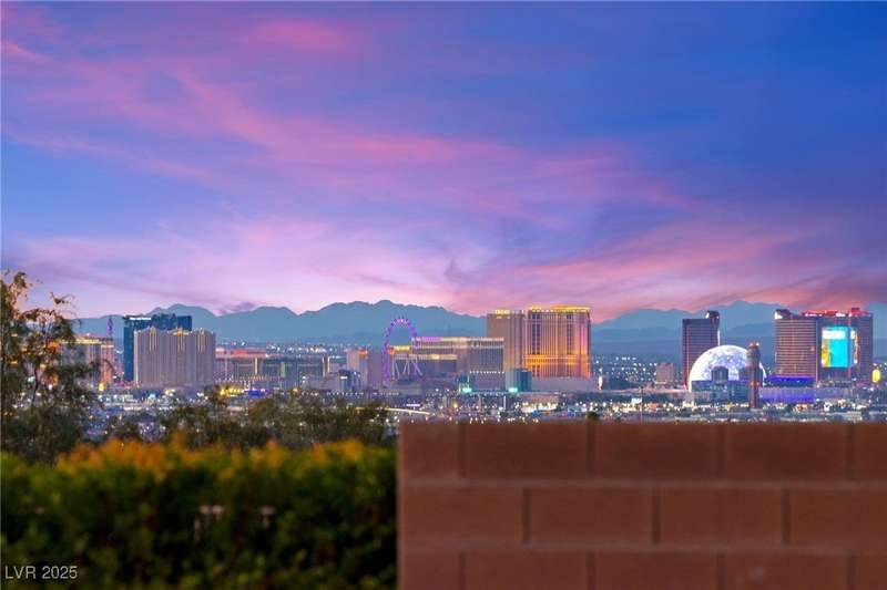 Step into this gorgeous home showcasing spectacular Strip, city, and mountain views from inside and out. Located in a quiet gated community with no rear neighbors, this updated residence blends luxury, comfort, and functionality. Enjoy primary suites on both the main and upper levels, with every bedroom featuring its own private en-suite bath—ideal for guests or multigenerational living. The open entryway leads to a two-story living room, spacious great room with fireplace, and a gourmet kitchen with granite countertops, stainless steel appliances, and toffee maple cabinets. Updates include new flooring, carpet, and fresh interior and exterior paint. High 9-foot ceilings add to the airy feel. The low-maintenance backyard offers a putting green, 12V landscape lighting, and unobstructed sunset views toward Red Rock and Mount Charleston. A private courtyard, epoxy-coated garage floor, and HOA-maintained front yard complete this exceptional home.