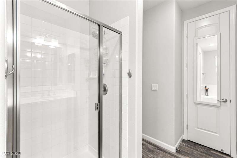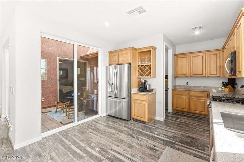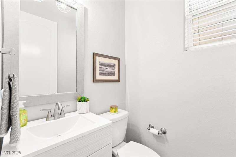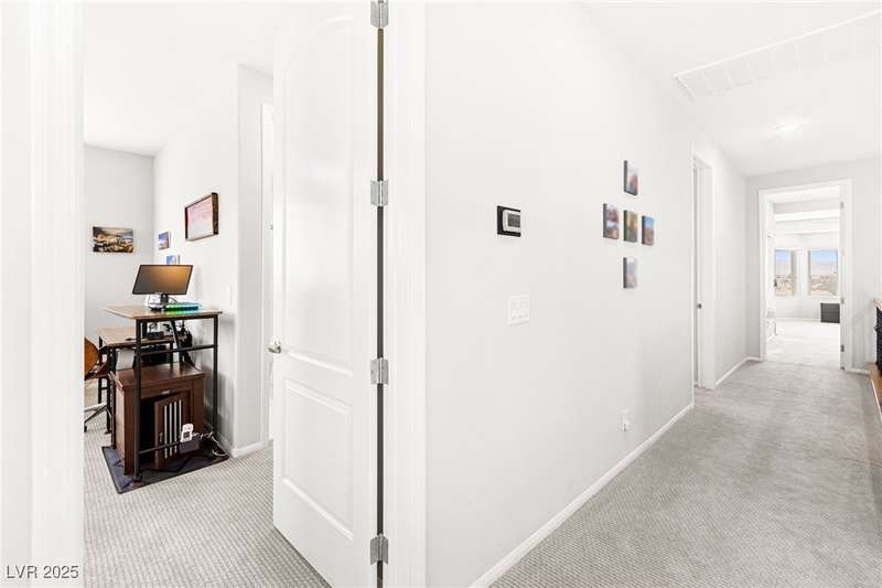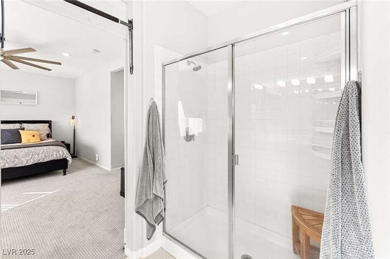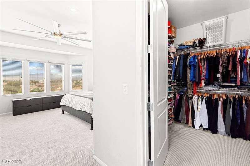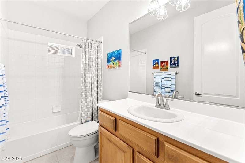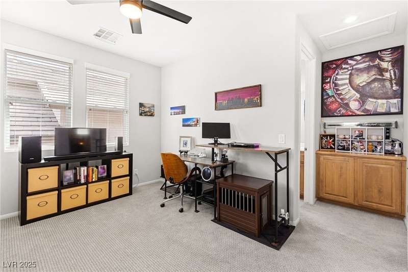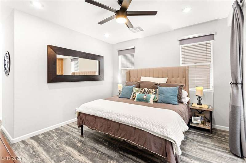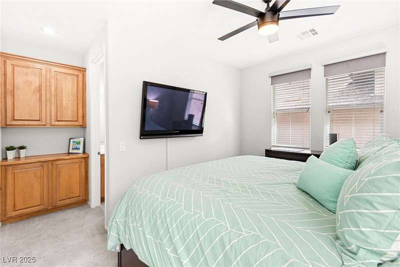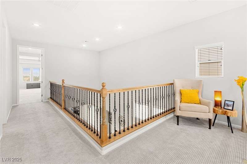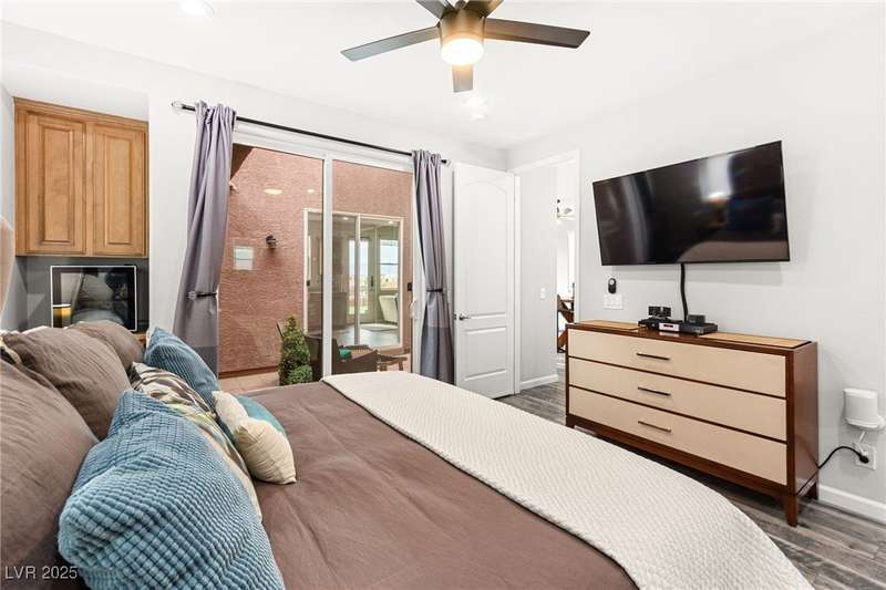 Step into this gorgeous home showcasing spectacular Strip, city, and mountain views from inside and out. Located in a quiet gated community with no rear neighbors, this updated residence blends luxury, comfort, and functionality. Enjoy primary suites on both the main and upper levels, with every bedroom featuring its own private en-suite bath—ideal for guests or multigenerational living. The open entryway leads to a two-story living room, spacious great room with fireplace, and a gourmet kitchen with granite countertops, stainless steel appliances, and toffee maple cabinets. Updates include new flooring, carpet, and fresh interior and exterior paint. High 9-foot ceilings add to the airy feel. The low-maintenance backyard offers a putting green, 12V landscape lighting, and unobstructed sunset views toward Red Rock and Mount Charleston. A private courtyard, epoxy-coated garage floor, and HOA-maintained front yard complete this exceptional home.