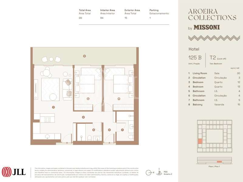 Apartamento T2 com 84 m2 de área bruta privativa, com piscina no Aroeira Collections by Missoni, um projecto único situado na exclusiva paisagem da Herdade da Aroeira, a 30 minutos de Lisboa e a poucos minutos das praias da Costa da Caparica. O empreendimento inclui uma infraestrutura de lazer completa: um hotel, clubhouse, healthcenter com ginásio, spa, sauna e salas de massagens, cinco campos de ténis e de padel, dois campos de golfe PGA, restaurante, uma mercearia e piscina comum. Além disso, vemos as falésias e dunas arenosas que protegem as praias locais e se abrem para o vasto horizonte atlântico. O Aroeira Collections by Missoni está situado a apenas 4 minutos de carro até ao supermercado, 10 minutos de bicicleta até à praia, e a Aroeira está a 30 minutos de todos os restaurantes, todos os teatros, todas as escolas que a cidade tem para oferecer. Categoria Energética: A #ref:89185
