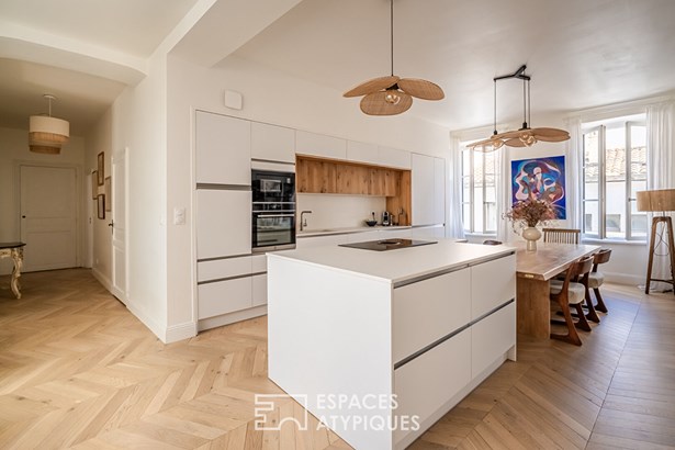 From the moment you enter, the 3-meter-high ceilings set the tone: every space feels open and airy. The bright and spacious living room flows seamlessly into a private courtyard-terrace, sheltered from view ? a true extension of the living area and kitchen, designed as a living space in its own right. The bespoke kitchen, centered around a ceramic island, is both visually striking and highly functional ? perfect for entertaining.