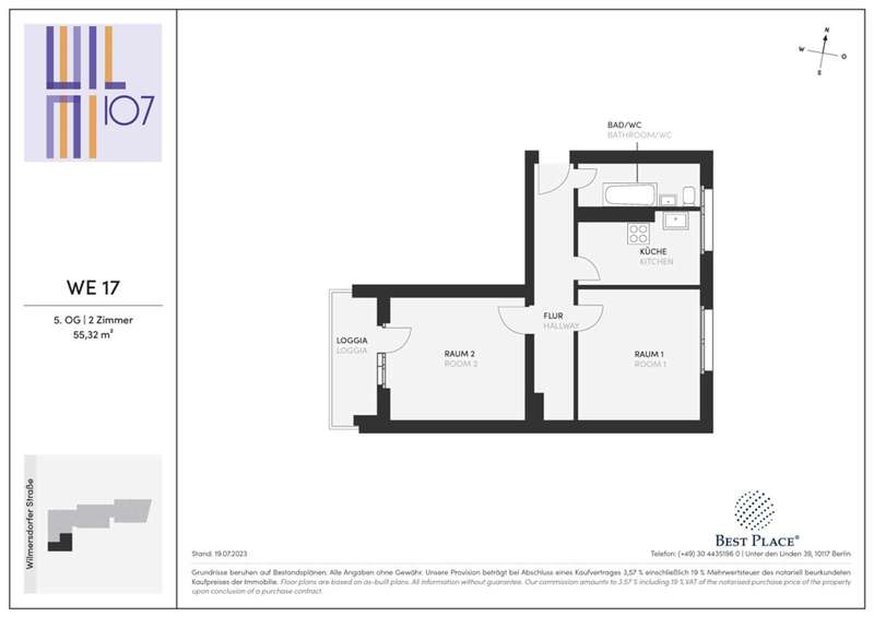 The modern building ensemble Wilmi 107 is located in the sought-after City West between Ku'damm and Kantstrasse. The 2- to 3-room apartments and commercial units are solidly rented and most have balconies or loggias and bathrooms with access to natural ventilation and light. Efficient floor plans, practical apartment sizes and elevator access make them lucrative investments. The offered apartment WE17 is located on the 5th floor. With two rooms and approx. 55.32 m², it has a particularly sought-after apartment size. A loggia guarantees relaxing hours in the fresh air and a bathroom with natural light and bathtub provides comfort in everyday life. The apartment is ideal for singles and couples of all ages and will also rent very well in the future.