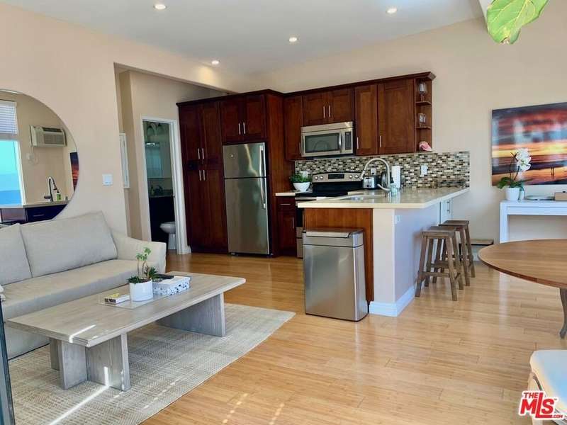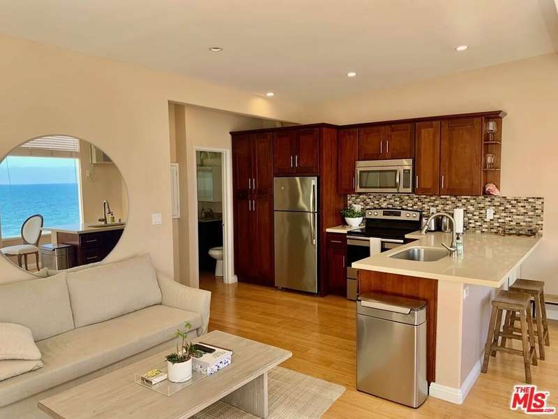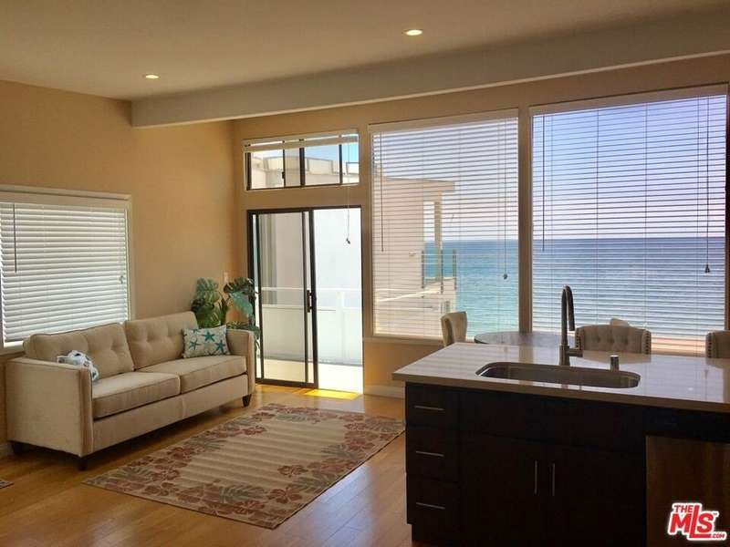 On Malibu Road Beach Side. Large One Bedroom / One bath, upstairs unit with White Water Ocean Views. Ocean views from deck, living room and kitchen. Recently updated kitchen and bathroom, Hardwood floors, large closet, covered garage parking for 1 car, plus one parking space behind garage. Laundry in unit. "Minimum one year lease". Ask about Pets. Bright and open unit with beautiful Malibu Beach views. Direct beach stair access. Available now. Call for Showing.