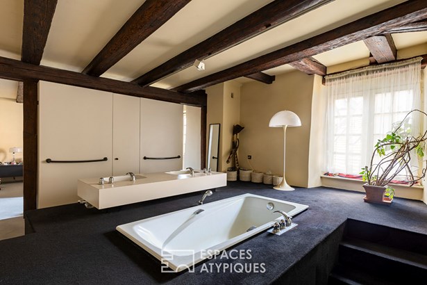 On the upper floor, a master suite of approximately 45 m2 with a bathroom shares space with two other bedrooms. An attic on the same level can be converted into an additional room as needed, while the loft remains usable for even more space. From the entrance of the main building, another door leads to an office of over 80 m2 tastefully renovated by the owner.
