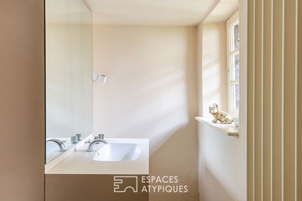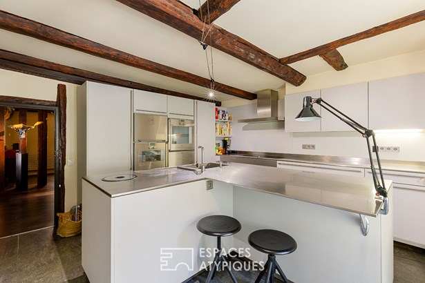 The entrance is through an imposing wooden door opening onto a first garden. The ground floor houses a large hallway that could be used as a workshop, a cellar, and a large room that probably hosted women's prayers in the 13th century. The first floor reveals generously proportioned living spaces. An office area and a shower room precede a double living room imbued with authenticity, punctuated by exposed beams and solid wood flooring. The custom-made kitchen, crafted by a local carpenter, is equipped with high-end appliances from Gaggenau.