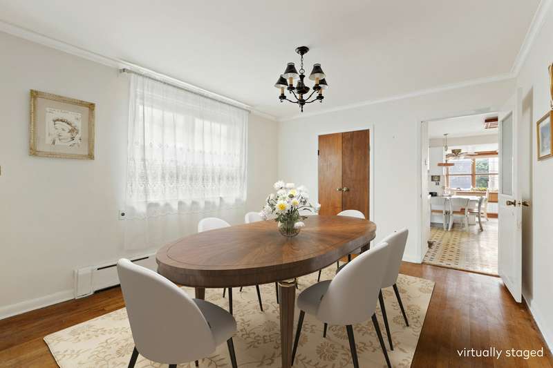 The owner's duplex begins with a sun-drenched formal living room at the front of the home, featuring oversized windows that flood the space with natural light. From there, flow seamlessly into the formal dining room - perfect for holiday gatherings and dinners with guests - before entering the large, eat-in kitchen, which stretches toward the back of the home and boasts a stunning bay window overlooking the patio and garden. Upstairs, you'll find four generously sized bedrooms and two full bathrooms, offering ample space for rest, work, and play. Throughout the home, you'll find exceptional storage, including 10 walk-in closets, a pantry off the kitchen, multiple linen closets, and an entry closet in the garden-level apartment.