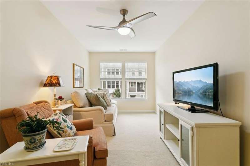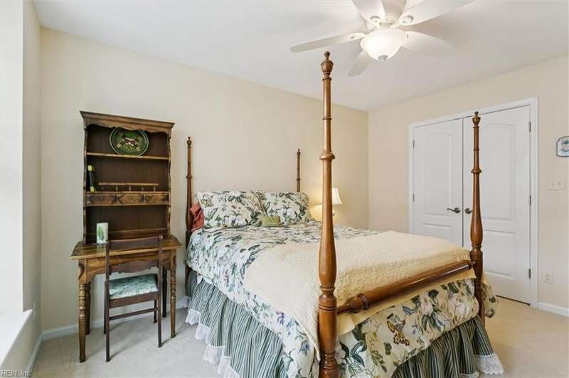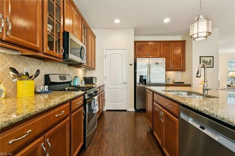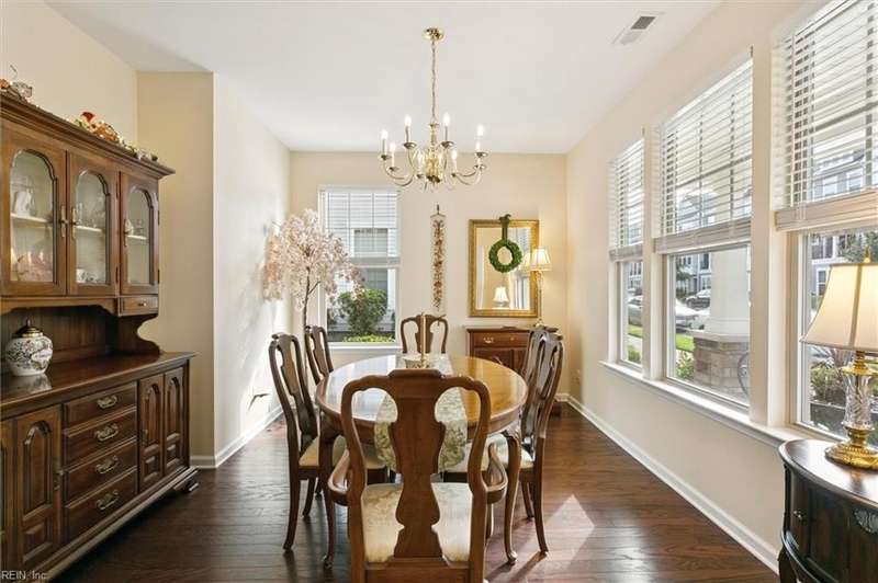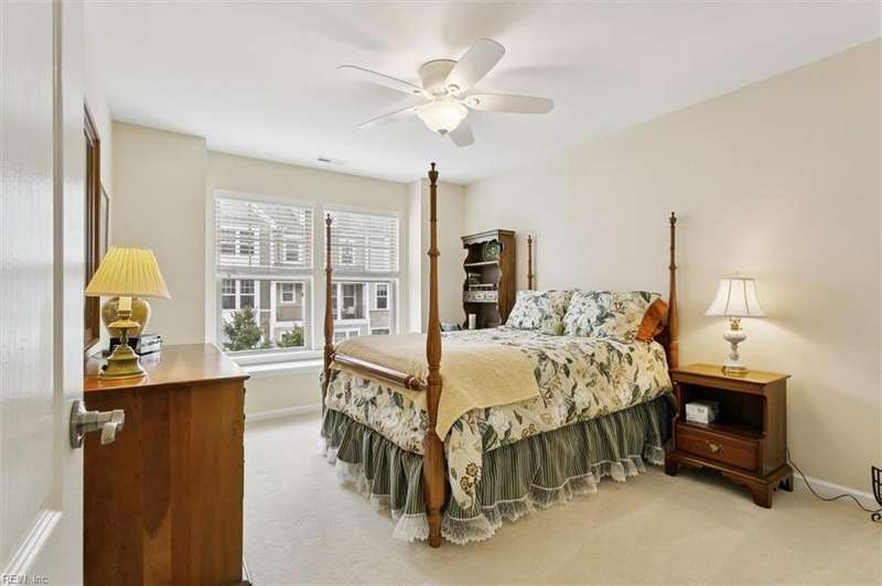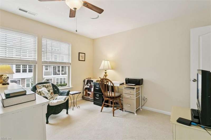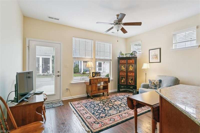 Light & bright, two story end unit townhouse located in the Village Green North section of Quarterpath within the City of Williamsburg. Low taxes & easy living with all exterior & yard maintenance included as well as, trash & snow removal. Featuring an open floor plan with wood floors which flow between the living, kitchen & dining spaces. The kitchen has a large island, granite countertops, gas cooking & large pantry. The breakfast area overlooks the rear patio. The front room is being used as a formal dining room. There are glass doors which would allow flexible use of the space. The large primary bedroom is on the second floor & has beautiful windows & an ensuite bathroom. The bathroom has separate sinks, a tub & shower, linen closet, separate water closet & WIC. The second & third bedrooms have hall access to a full bathroom with dual sinks & a linen closet. The two car garage has built in cabinets & hanging rack system, great for storage. The home has been freshly painted & the ow