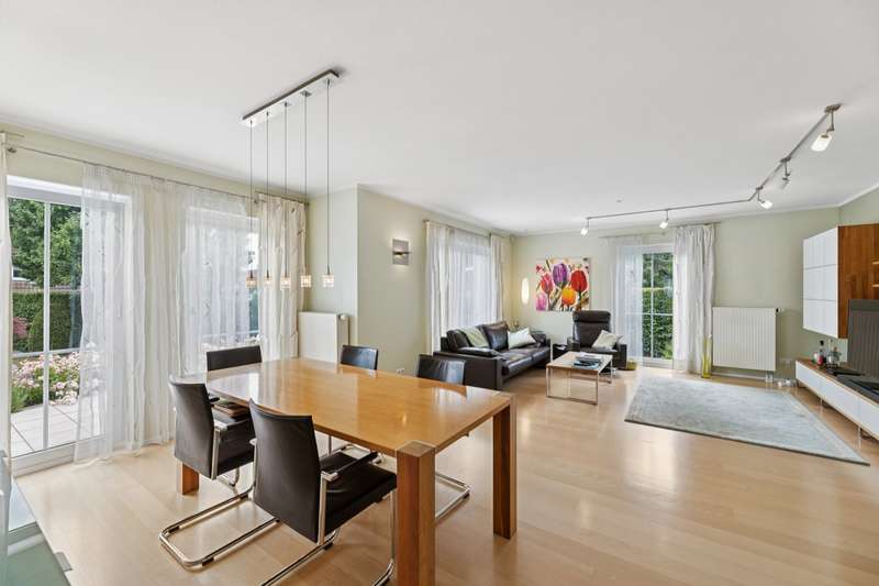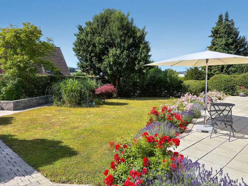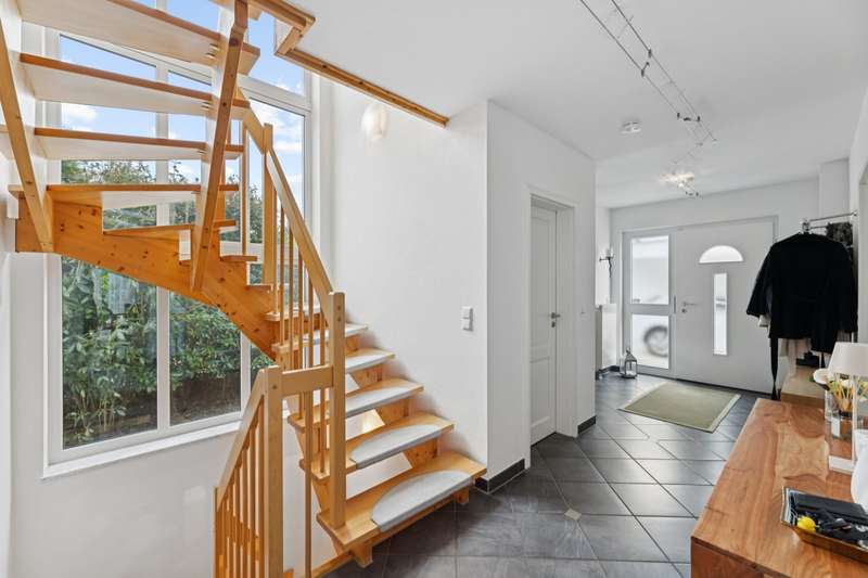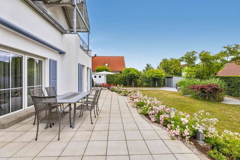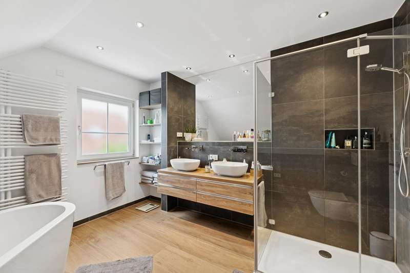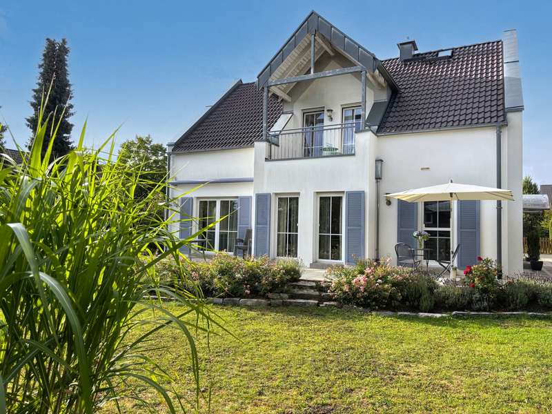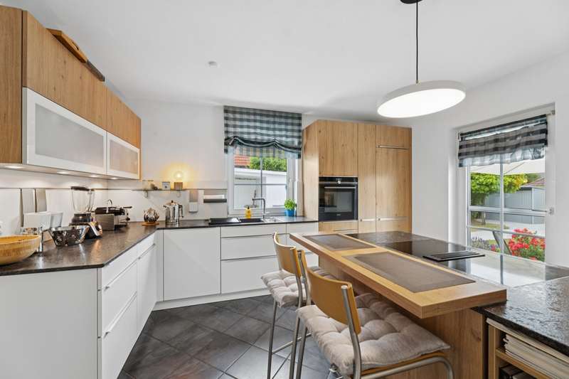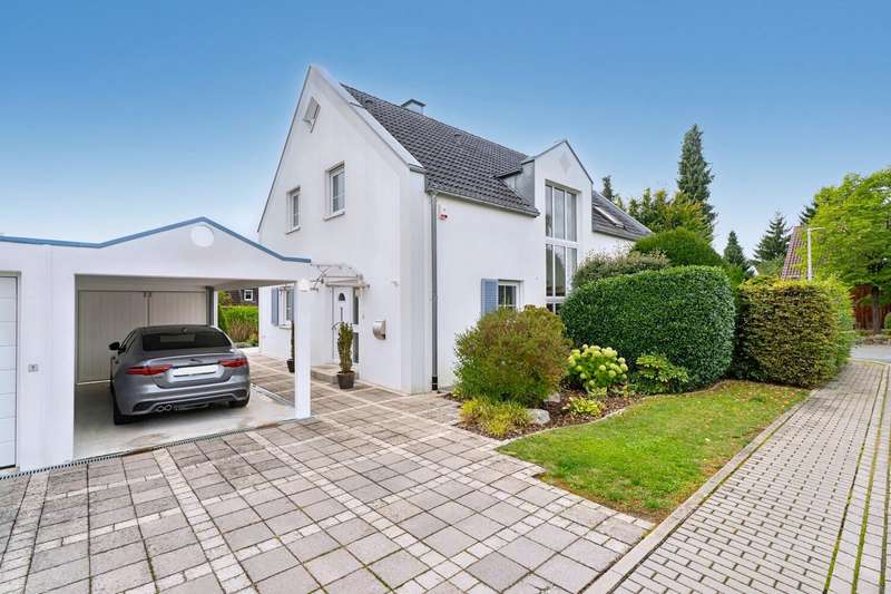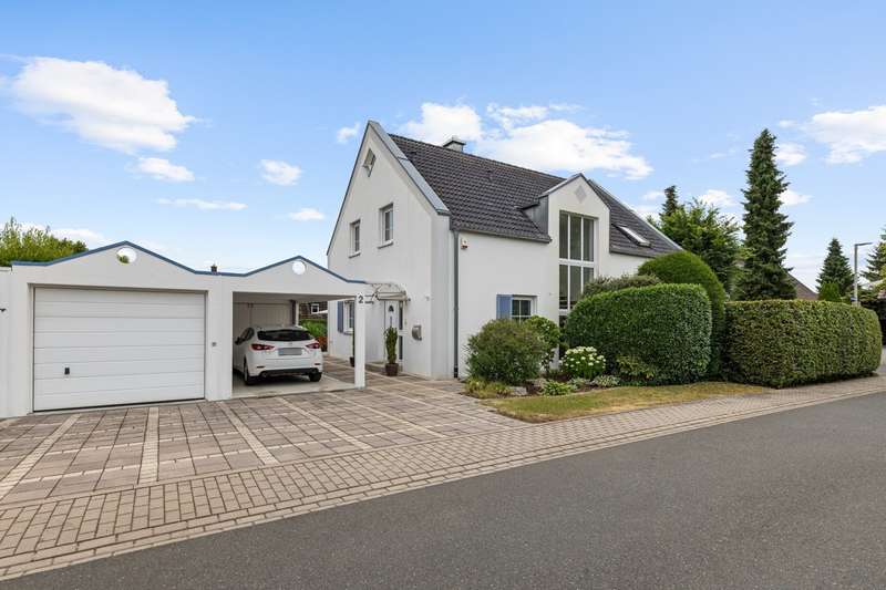This well-kept detached house combines contemporary living comfort with an inviting ambience and offers plenty of space for individual lifestyles on around 160 m² of living space and a plot of approx. 765 m². Thanks to ongoing modernization work, the property is in excellent condition. On the first floor, you are welcomed by a bright, spacious living and dining room, which creates a particularly warm atmosphere with a cozy fireplace and large windows. From here, you have direct access to the terrace, which offers a wonderful view of the lovingly landscaped garden - a place for relaxing hours outdoors with family or friends. The high-quality fitted kitchen, completely renovated in 2018, leaves nothing to be desired and offers both functional equipment and timeless design - a dream for amateur chefs. The floor is complemented by a flexibly usable study, a guest WC and a separate storage room. The upper floor has a bedroom and two children's rooms, also ideal for use as a hobby or dressing room. The loggia, which is accessible from both the bedroom and one of the children's rooms, is particularly noteworthy - perfect for a quiet start to the day or relaxing evening hours. The bathroom on the upper floor was completely renovated in 2022 and boasts a high-quality, modern design. In addition to a large shower and an elegant double washbasin, the free-standing bathtub takes center stage, transforming the room into a small private wellness oasis. In the basement, you will find another bathroom with a shower and WC as well as a spacious guest room. Alternatively, you can also convert this into a wellness area. The garden not only offers space for relaxation, but also for creative design options. It is the ideal retreat for families, couples or garden lovers looking for a perfect balance between nature and a modern lifestyle. Two additional garden sheds provide functional storage options, e.g. for bicycles or garden accessories. The offer is rounded off by a garage and a carport as well as additional parking spaces in front of the house - practical and convenient at the same time. An alarm system also provides reliable protection when you are away.