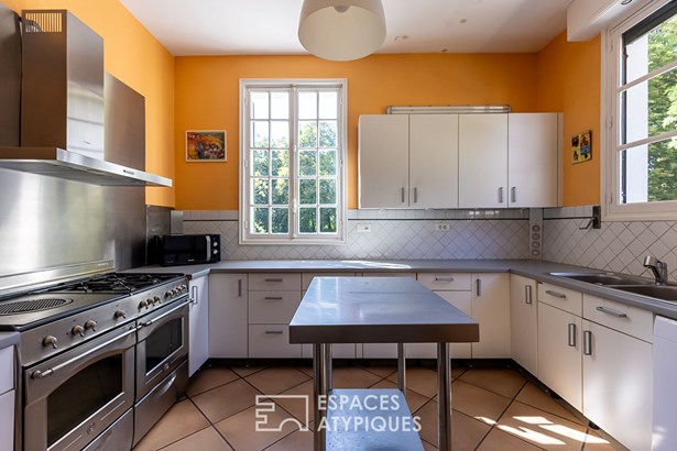In continuity, the kitchen space consists of a pantry, a semi-professional kitchen and a back kitchen adapted to laundry. The circulation is easy and the volumes attractive.