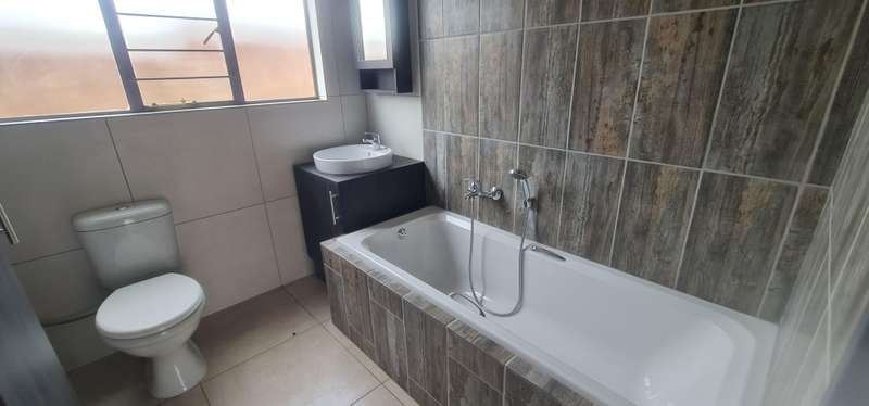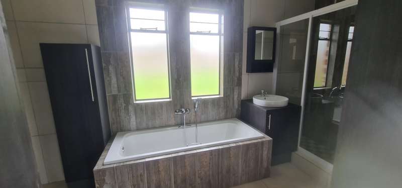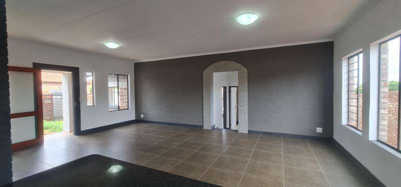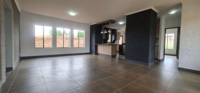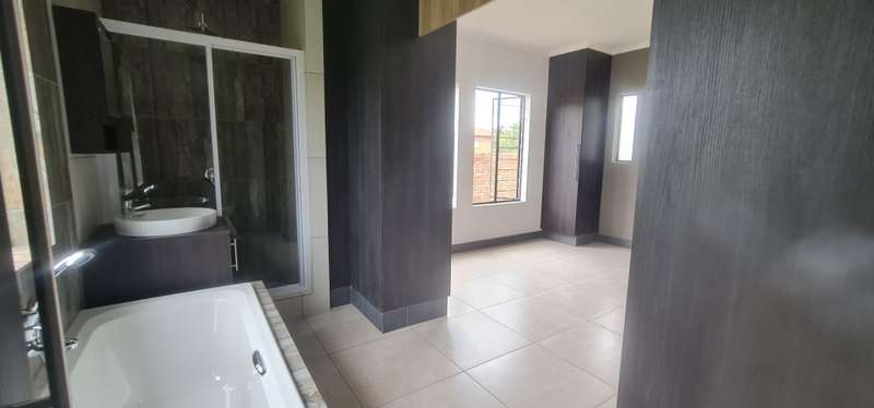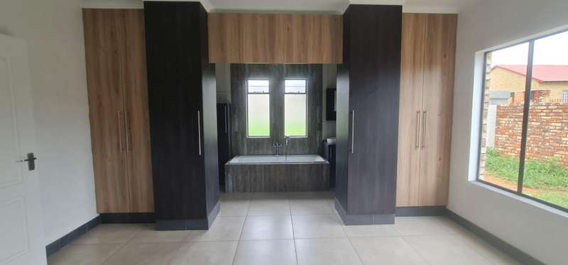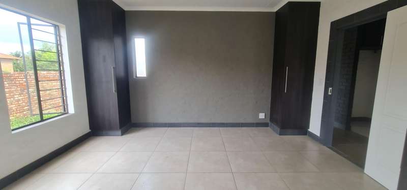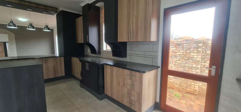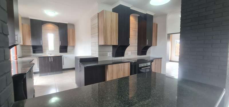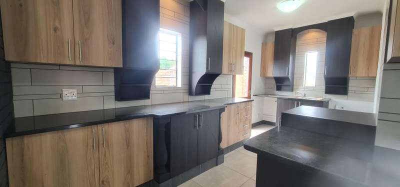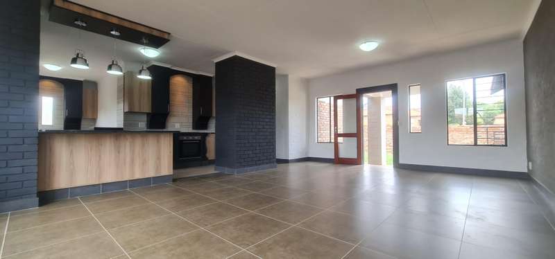 Modern 3 Bedroom Townhouse, NEWLY BUILT! Open plan living space, which flows into the kitchen. Wall to wall wooden cabinets, built in oven with hob and dishwasher connections. Spacious bedrooms and two full bathrooms. En-suite is semi open plan with the main bedroom, adding to the unique and modern feel of the unit. Tile flooring runs throughout the entire home, even into the double garage which is attached to the unit with interconnecting doorway. Garage door is automated, tiled flooring with ceilings. Each unit is full title, with privately enclosed garden. Six-foot walls run all around with motorized gate.