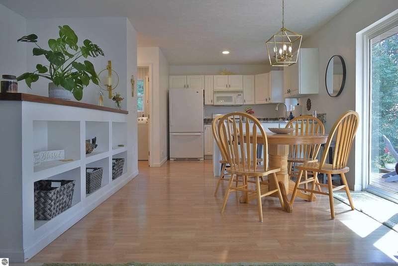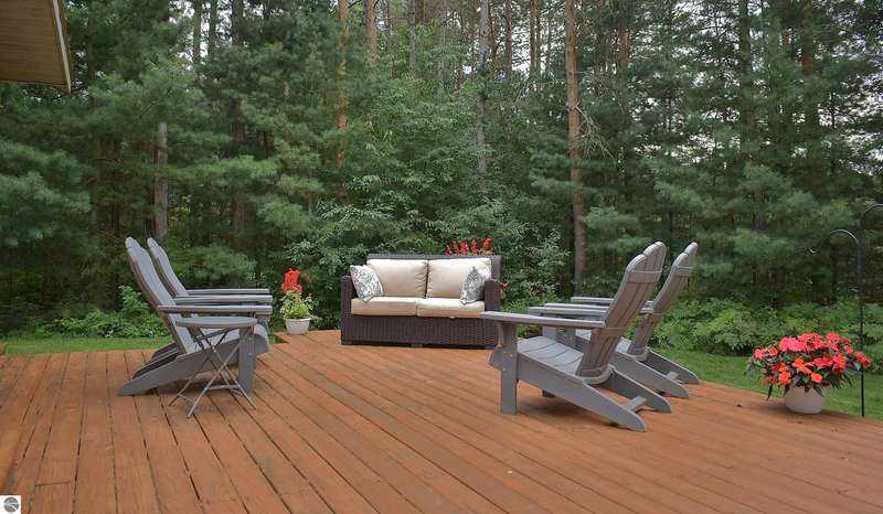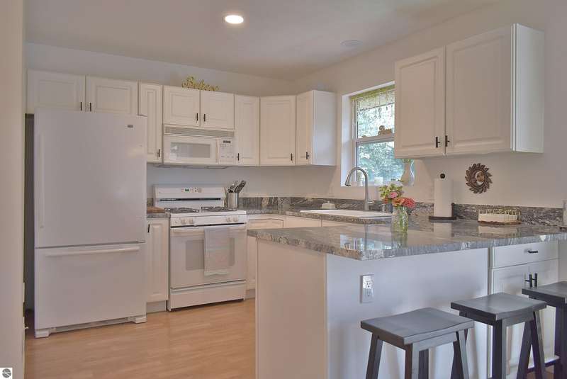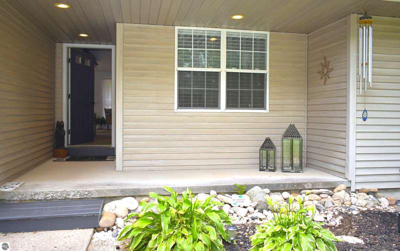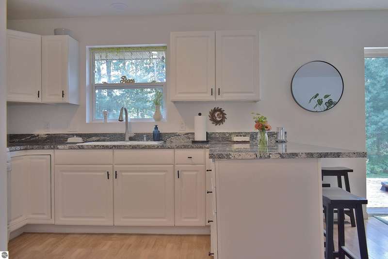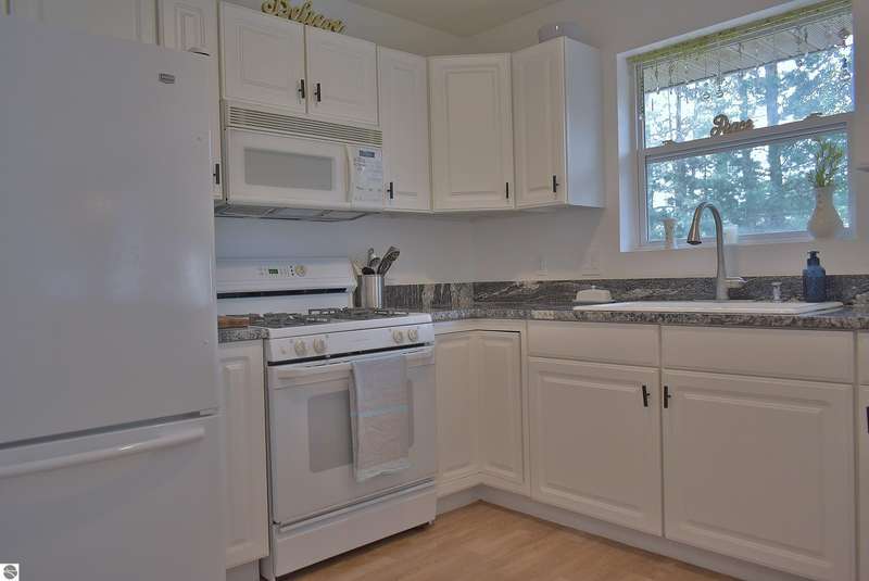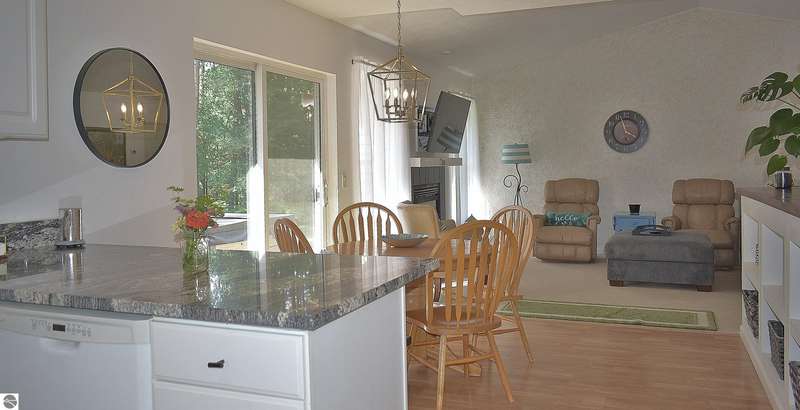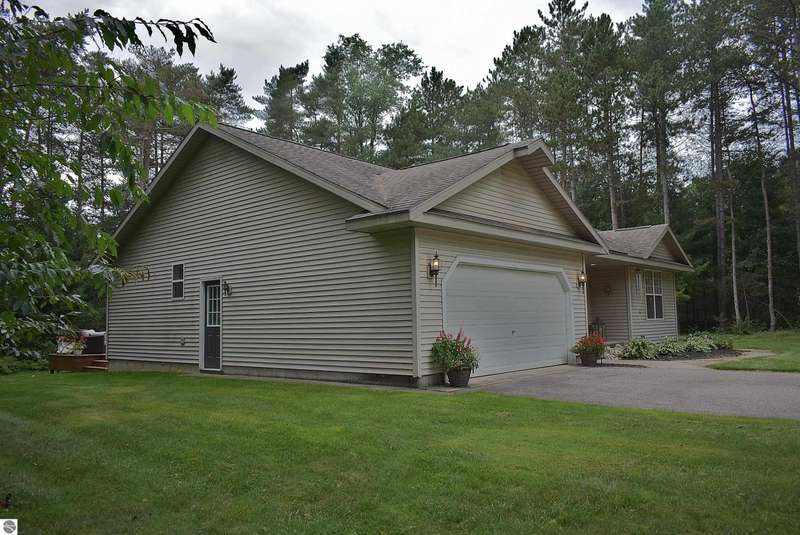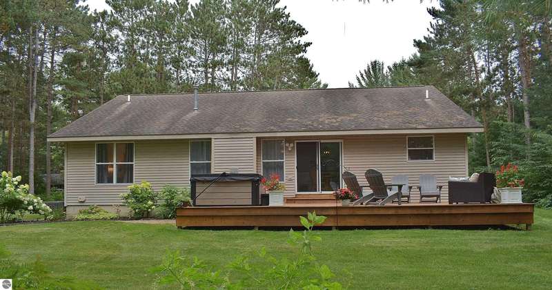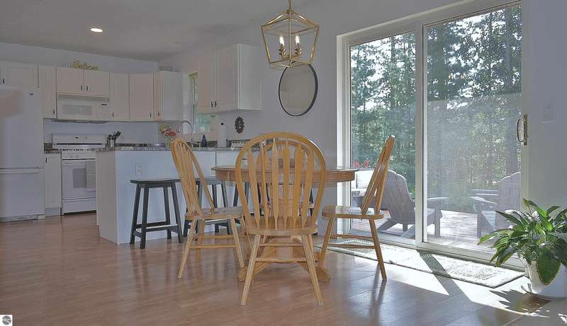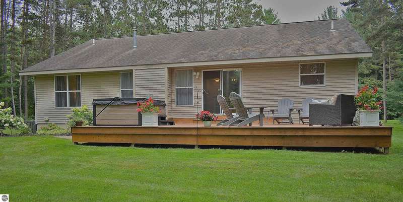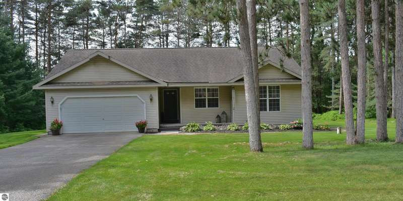 Light and Bright Ranch style home with main level living on a level lot lined by evergreen and hardwoods located a short scenic drive West of Traverse City in TCAPS school district, Benzie County. At the North end of the development is Shorter Lake; a peaceful no wake, fishing spot. A sign marks the access to a wooded path that leads to the shore. A short walk or golf cart ride from this thoughtfully designed home with a large concrete porch with covered entry welcomes you - Hello. Come on in to cathedral ceiling in living room with gas fireplace open to dining area with open bookcases and a slider to an expansive deck area, a lush lawn with u/g irrigation. The kitchen w/granite counter top, bright white cabinets and a peninsula with bar seating makes gatherings comfortable. A large pantry, across from a main level laundry has direct access to the 2-car garage with a service entrance. The oversized bedrooms include the primary suite and two additional bedrooms and full bath. All have bright natural light, ceiling fans and ample closet space. The full unfinished basement, to be finished at your leisure, offers room for equity and growth. Shorter Lake Woods development has lake access to Shorter Lake - a great fishing lake - the Pere Marquette State Forest with access to trails. The location Borders Grand Traverse and Leelanau Counties. You will love the close proximity to all the Up North activities, Traverse City, Lake Ann, Maple City, Cedar, Empire, Glen Arbor and Sleeping Bear National Lake Shore, Platte River, many other lakes and streams, hiking, biking, hunting, fishing, farm markets, brew pubs, restaurants, small town shopping and more... Don't overlook this home offering move-in ready, easy living!