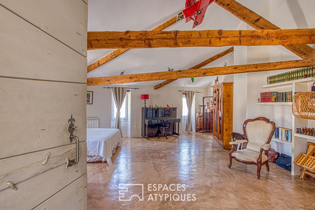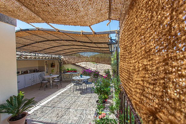 On the top level, the flowered terrace under a wrought iron pergola of 35m2 is equipped with a summer kitchen, it benefits from a pretty view (southwest) on the village and its neighboring hills. On the same floor a large bright room treated as a bedroom with its bathroom is just waiting for your imagination to transform into a space at your convenience:workshop, guest room: