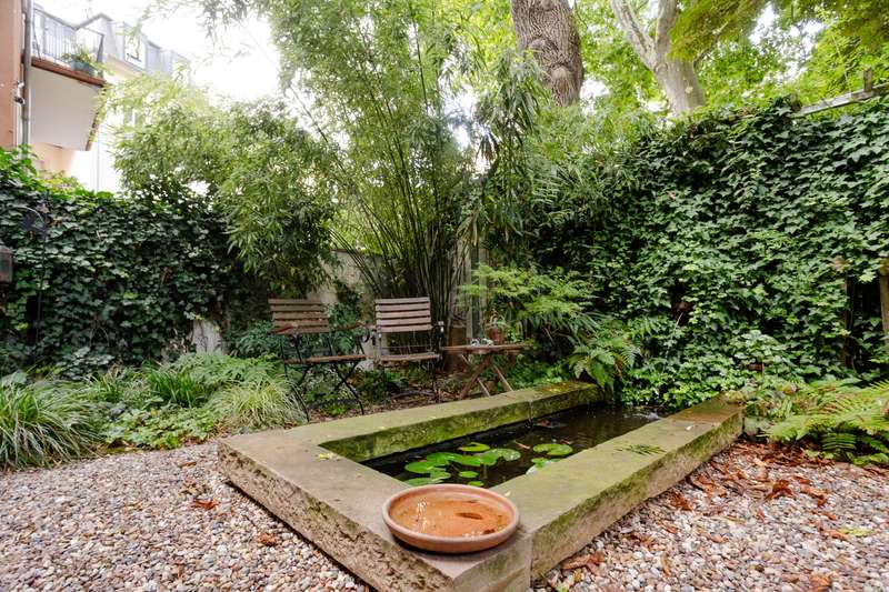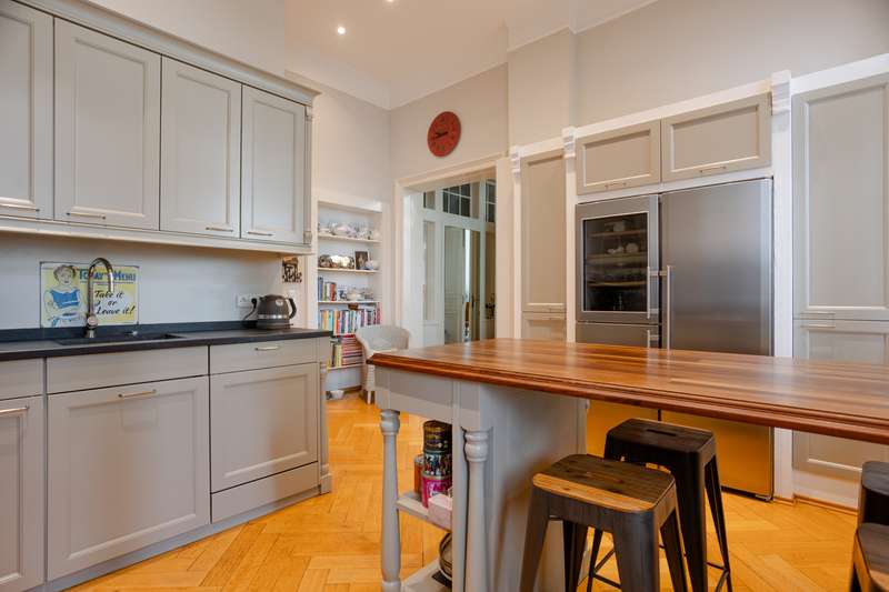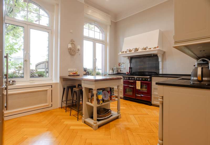 This unique period apartment with an idyllic garden is located on the mezzanine floor of a prestigious 4-family house built in 1900. The stately apartment impresses with approximately 4 meter high ceilings and original style elements typical of the construction period around 1900, such as majestic double doors and a sliding door, artfully decorated door frames, herringbone parquet flooring and high window elements in the style of the original year of construction. The stylish domicile is accessible via a private entrance and, with its two floors and garden, conveys the feeling of living in a townhouse. The spacious entrance hall on the mezzanine floor, with its elegant historical character, is suitable as a prestigious reception room with flair. As was customary in the Wilhelminian style, the three stately rooms are connected by double doors or the imposing sliding door. The dining area is housed in the fully glazed, very decorative conservatory, which is also around 4 meters high and faces directly onto the garden. The impressive, very stylish rooms are flooded with light from morning to night and offer beautiful views. The dining room leads onto the terrace and down a few steps into the idyllic garden with its English character. The large eat-in kitchen is equipped with a custom-made luxury kitchen in a historically authentic style and, in addition to modern appliances, offers a free-standing Falcon De Luxe range stove with multifunction oven and much more to match the flair of the kitchen. The bathroom on the mezzanine floor is also furnished in the Wilhelminian style. All bathrooms have underfloor heating. On the lower level of the maisonette-style apartment is a spacious, bright bedroom with high ceilings and a modern daylight bathroom. This area has a separate entrance via the general staircase. This exceptionally beautiful apartment delights with its incomparable charm and harmoniously designed, luxurious interior. The romantic garden complements the historic ambience. Part of the garden can be cut back to make use of the two parking spaces.