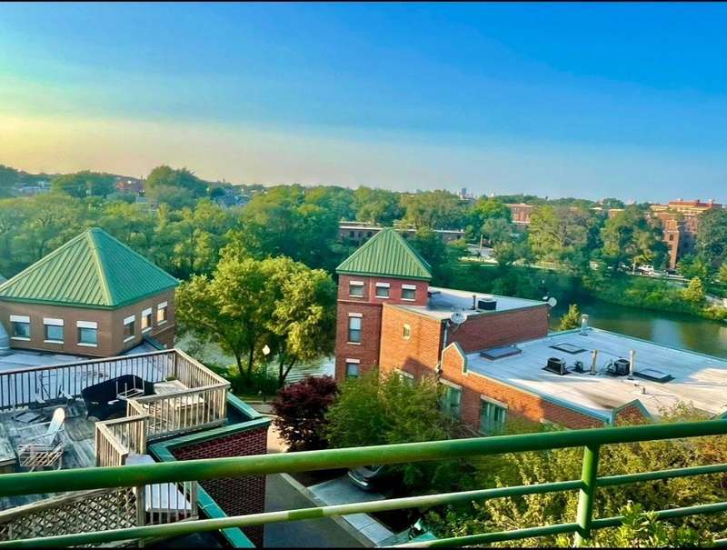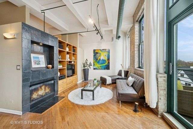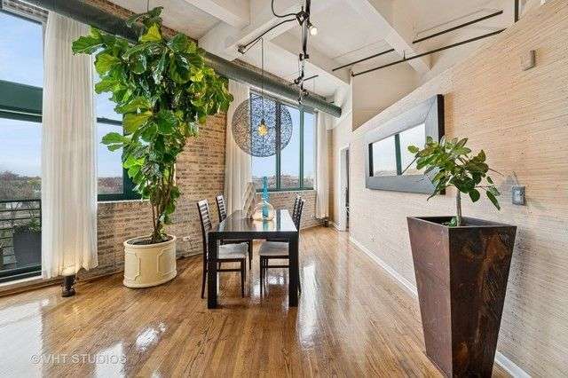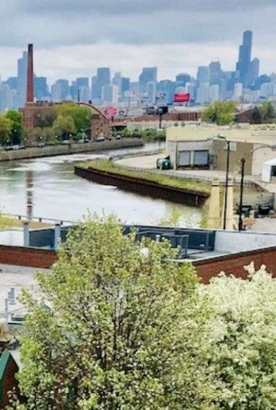 SEE MATTERPORT 3D TOUR & VIRTUAL TOUR. Largest unit in the building - 2 separate units were combined by the developer to make a spacious 1800 square foot 3 bed 2 bath penthouse unit that overlooks the Chicago River. This lofted unit has a great split open floor plan, updated kitchen, high ceilings, exposed brick, hardwood floor and huge windows throughout. There is a private deck off the living room and a 2nd deck off the primary bedroom, along with a huge common roof deck for the residents' enjoyment. This is an elevator building and comes with one heated garage parking space (#32). This gated community has launch access for kayaks into the river. Perfectly located between Logan Square, Roscoe Village and West Lakeview, this home has easy access to the highway. The Diversey bus will quickly take you to either the Blue Line West or the Brown Line east Pet friendly and much more!