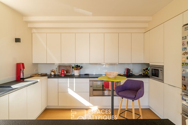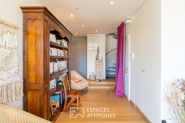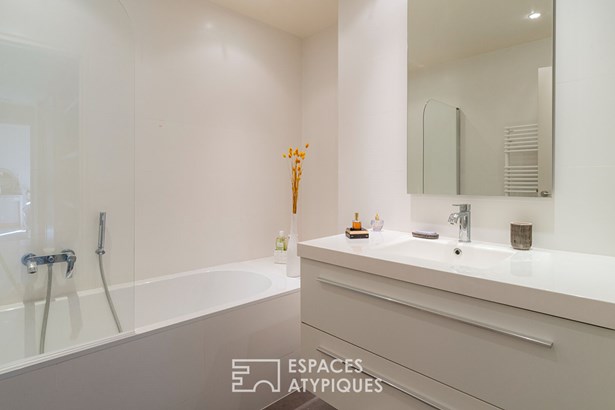 Renovated in a contemporary style, it harmoniously combines old-world charm with modern amenities. Its dual east-west exposure, generous ceiling height, and flowing volumes give the whole building a bright and refined atmosphere.