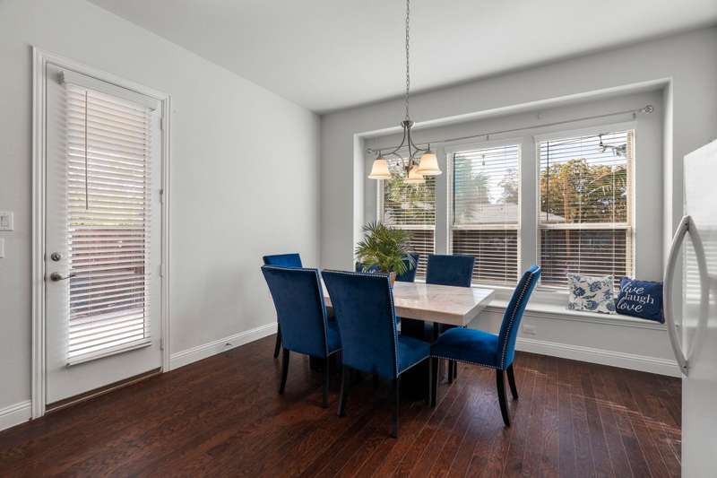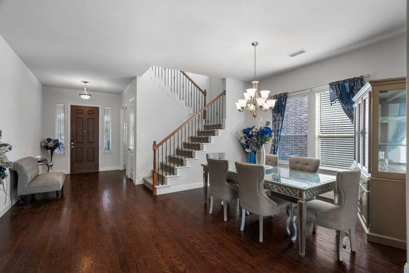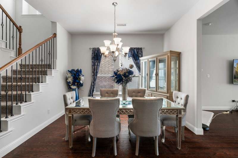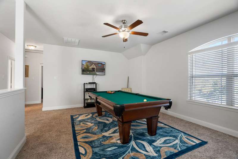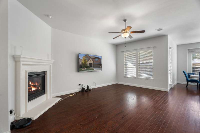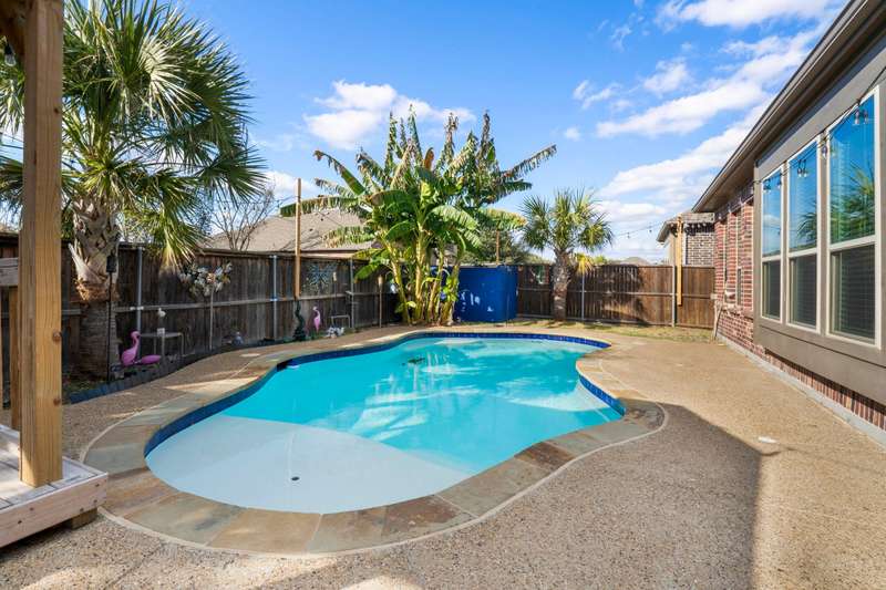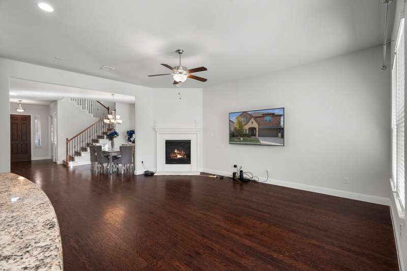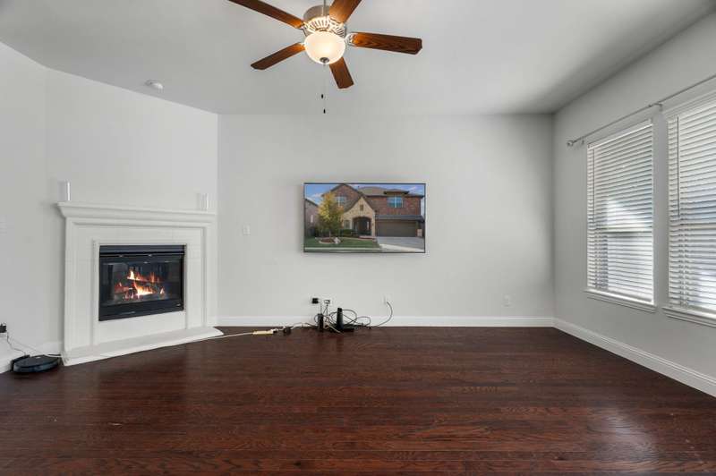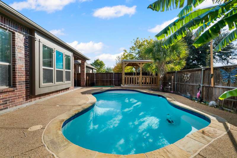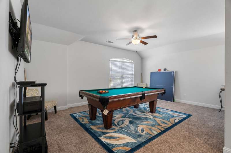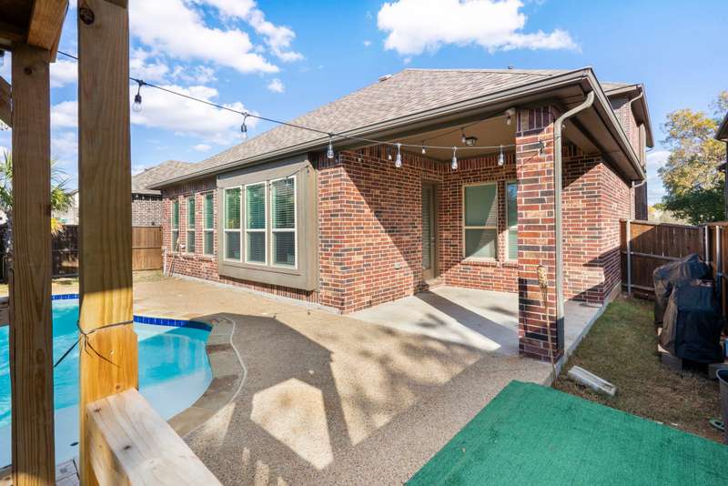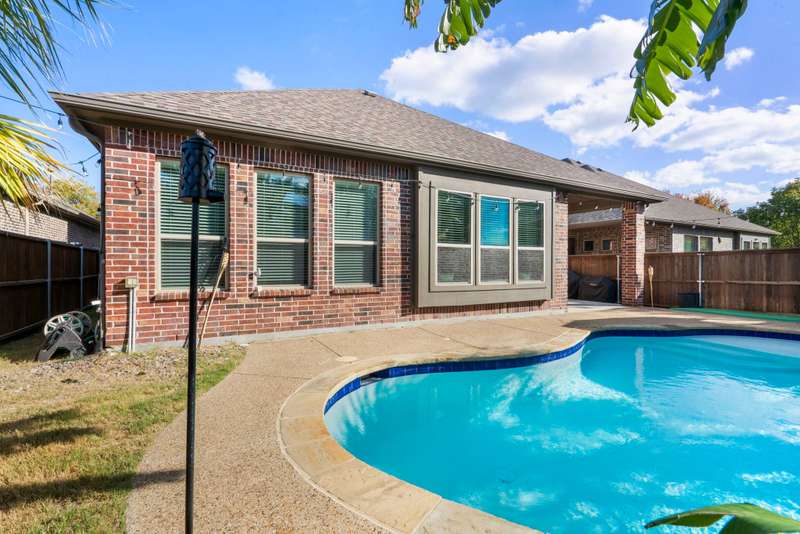 Beautiful Windsor two-story home in The Manors on Miller offering an exceptional floor plan, with the primary suite and private study on the first level and three secondary bedrooms, a spacious game room, and a cozy media room upstairs. Wood floors flow through most of the first level, leading into the inviting great room featuring a generous living area with a gas fireplace, an open kitchen, and a bright breakfast nook with seamless access to the formal dining room. A wall of windows fills the space with natural light and provides serene views of the backyard and pool, while a nearby door opens directly to the covered patio for easy indoor-outdoor living. The kitchen is ideal for entertaining with bar seating, granite countertops, a gas cooktop, double ovens, built-in microwave, and a walk-in pantry. The private primary suite is tucked at the back of the home, offering ample room for king-sized furnishings and a sitting area overlooking the sparkling pool. The primary bath includes dual sinks, a walk-in shower, a large soaking tub, and a generous walk-in closet. Upstairs, the game room comfortably fits a pool table, TV area, and seating, while the dark, theater-style media room is perfect for movie nights and game-day gatherings. The backyard is a true retreat with a play pool, covered gazebo-bar area, and plenty of decking for lounging. This home faces the neighborhood greenbelt and park and offers a highly convenient location near Hwy 66, George Bush, I-30, and Lake Ray Hubbard.