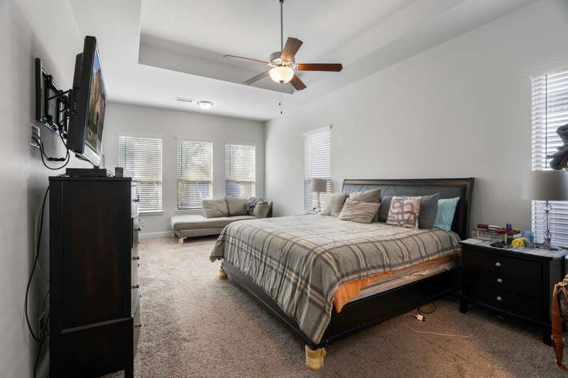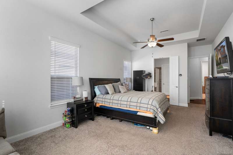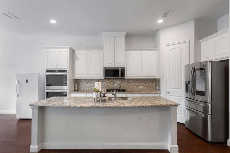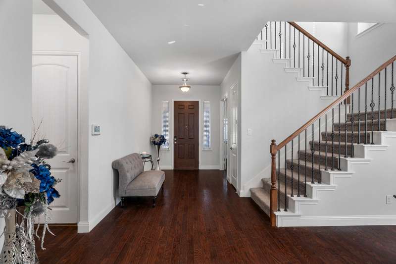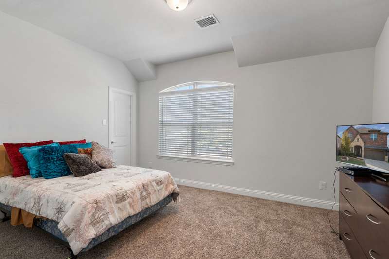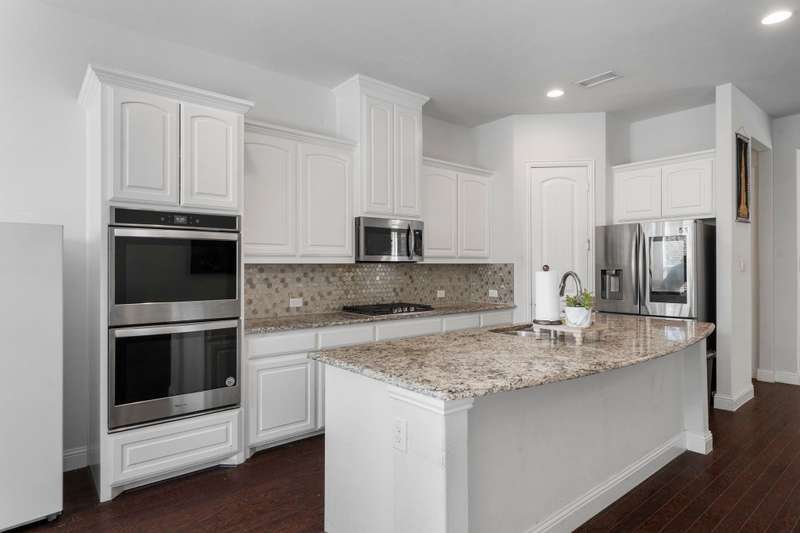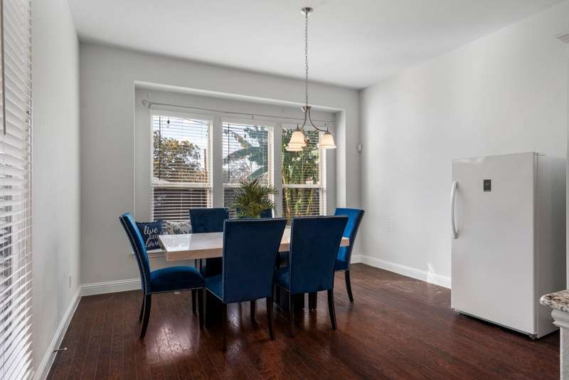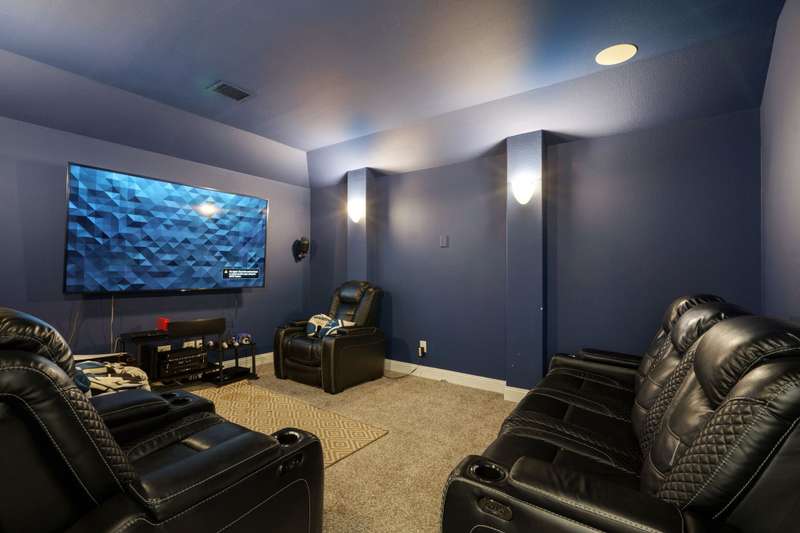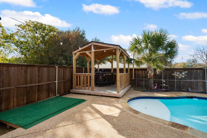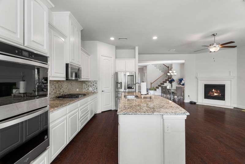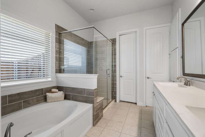 Beautiful Windsor two-story home in The Manors on Miller offering an exceptional floor plan, with the primary suite and private study on the first level and three secondary bedrooms, a spacious game room, and a cozy media room upstairs. Wood floors flow through most of the first level, leading into the inviting great room featuring a generous living area with a gas fireplace, an open kitchen, and a bright breakfast nook with seamless access to the formal dining room. A wall of windows fills the space with natural light and provides serene views of the backyard and pool, while a nearby door opens directly to the covered patio for easy indoor-outdoor living. The kitchen is ideal for entertaining with bar seating, granite countertops, a gas cooktop, double ovens, built-in microwave, and a walk-in pantry. The private primary suite is tucked at the back of the home, offering ample room for king-sized furnishings and a sitting area overlooking the sparkling pool. The primary bath includes dual sinks, a walk-in shower, a large soaking tub, and a generous walk-in closet. Upstairs, the game room comfortably fits a pool table, TV area, and seating, while the dark, theater-style media room is perfect for movie nights and game-day gatherings. The backyard is a true retreat with a play pool, covered gazebo-bar area, and plenty of decking for lounging. This home faces the neighborhood greenbelt and park and offers a highly convenient location near Hwy 66, George Bush, I-30, and Lake Ray Hubbard.