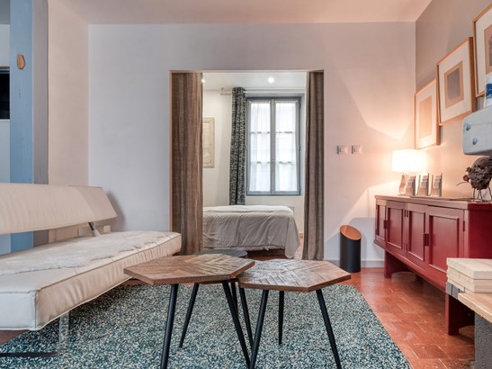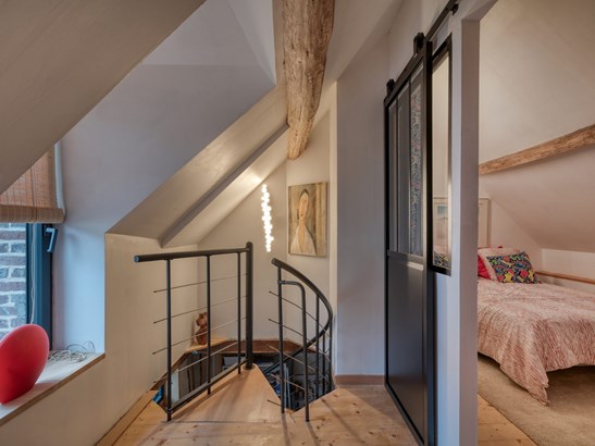 The heart of the house is located on the upper floor, conceived as a vast, open-plan living area. Clean lines meet a warm and inviting layout, visually defining each zone. The space unfolds around a kitchen and dining area, a cozy central living room, and a bedroom with its own shower room. Exposed beams, brick walls, and wooden floors lend the ensemble a distinctive character that blends authenticity and contemporary flair.