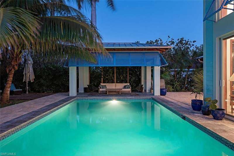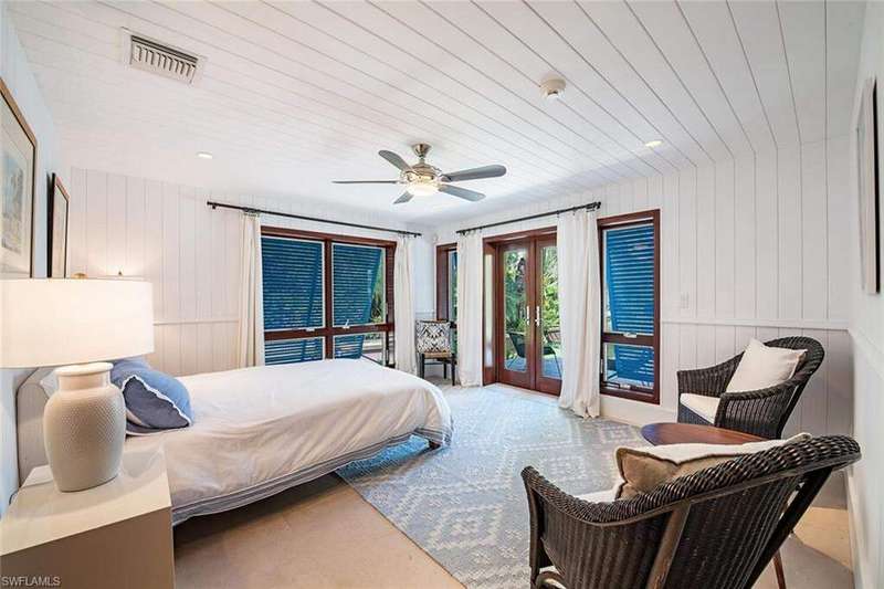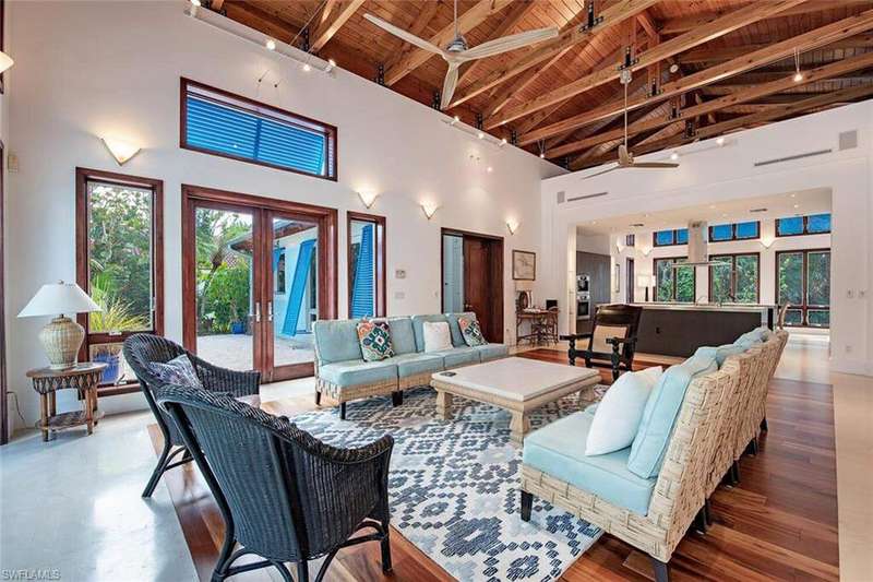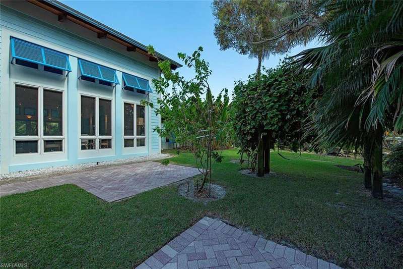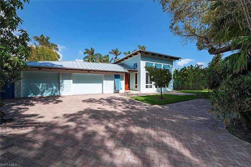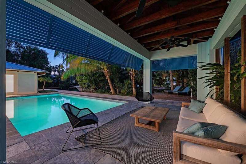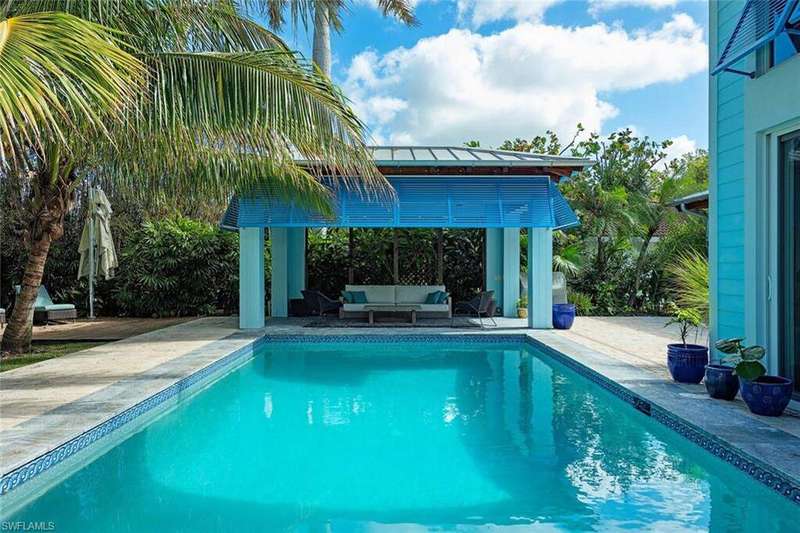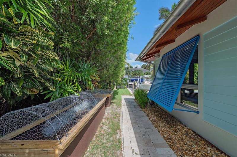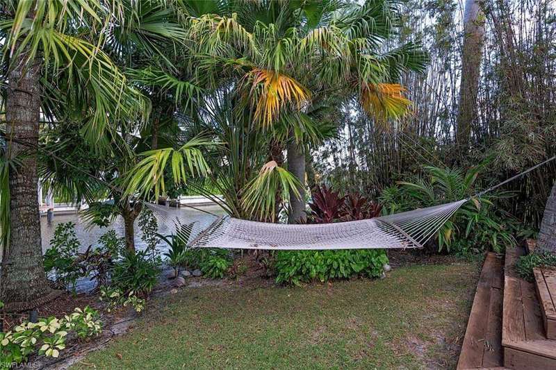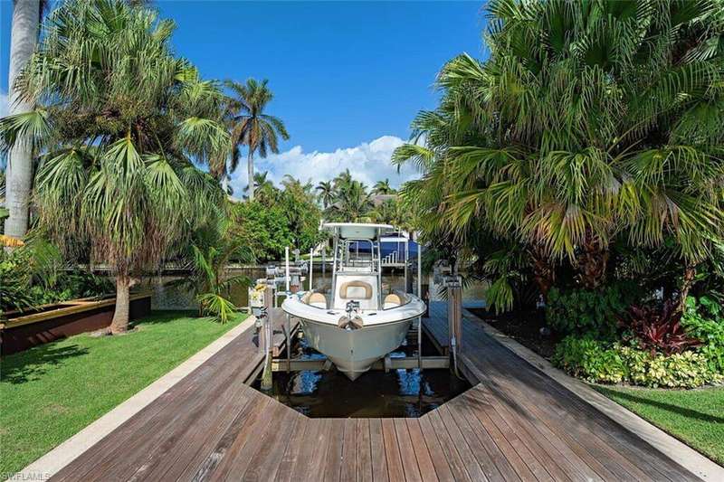 Showcasing a myriad of quality finishes and an eclectic coastal design, this waterfront residence offers backyard Naples Bay access and is walkable to all that Third Street South has to offer, including fine dining, world-class shopping, and cultural events. The main living spaces are defined by vaulted, exposed and stained beam ceilings, cherry wood inlays, and copious windows. Each space, from the formal dining room, to the kitchen, living room, and family room, are all interconnected, creating an ideal space for entertaining guests or enjoying intimate family dinners. Without argue, the gourmet chef's kitchen is the heart of the home and is equipped with top-of-the-line Miele appliances, multiple islands, as well as frosted glass and custom walnut cabinetry. Large sliders and French doors seamlessly connect the interior and exterior living environs which offer a true tropical setting that is unmatched with its varied vegetation including bamboo and fruit trees, sunbathing deck, a secluded hammock framed by palms, outdoor shower, a loggia with tongue and groove ceiling, and a boat dock with cutout, lift, as well as fish-cleaning station. The master suite, which has private access to all the aforementioned exterior environs, is a retreat in itself, and showcases a continuation of vaulted exposed beam ceilings, shiplap detailing, built-in bookshelves, and a bathroom complete with floating vanities and walk-in shower. Completing the all one level residence are two guest suites, one of which also has private exterior access, that are enveloped in nautical-inspired shiplap wall details, a den / flex space, as well as a half bathroom. Additional notable enhancements include a generator, 1,000 lb propane tank, multiple above-ground and irrigation-equipped metal garden beds, standing-seam metal roof, a wine cooler, Halo whole-house water filtration system, and so much more.
