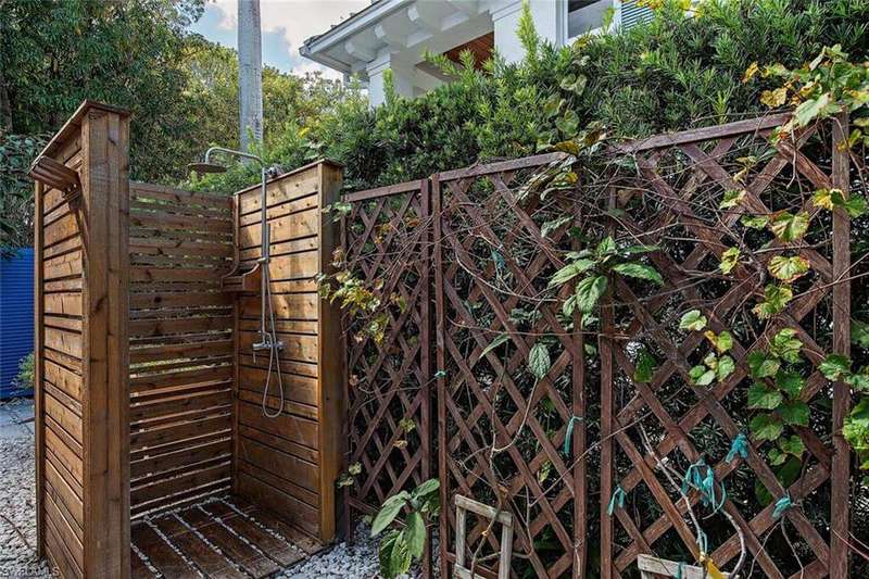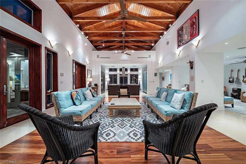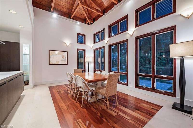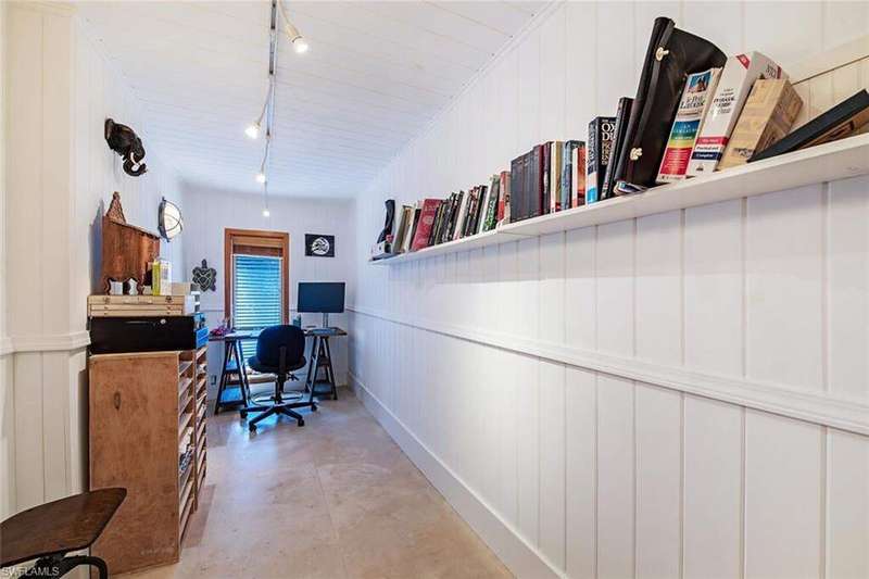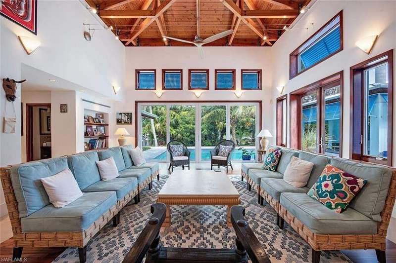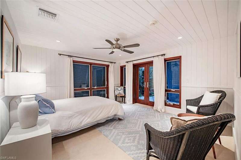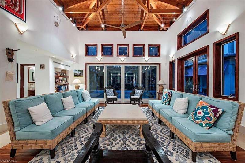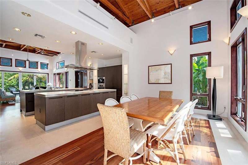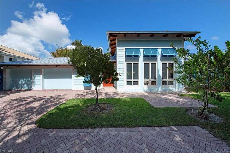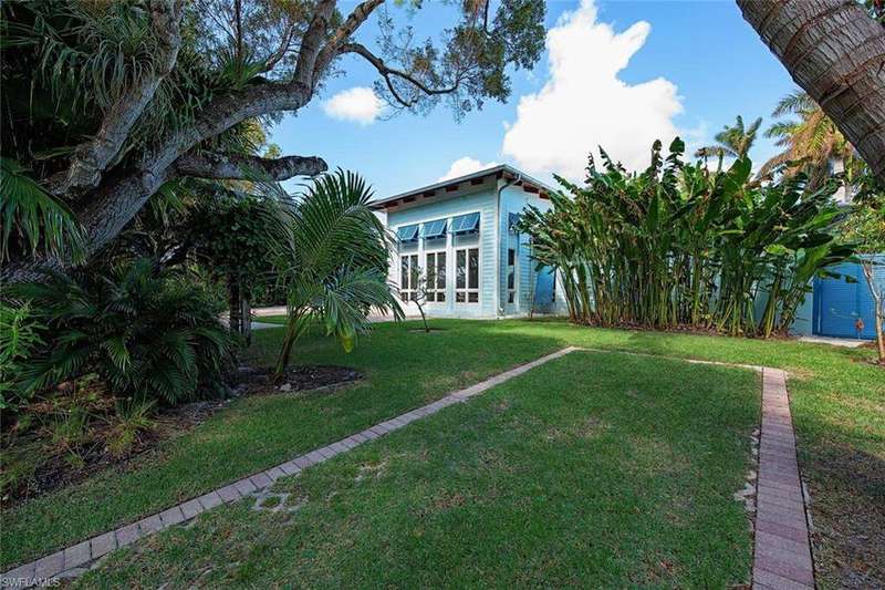 Showcasing a myriad of quality finishes and an eclectic coastal design, this waterfront residence offers backyard Naples Bay access and is walkable to all that Third Street South has to offer, including fine dining, world-class shopping, and cultural events. The main living spaces are defined by vaulted, exposed and stained beam ceilings, cherry wood inlays, and copious windows. Each space, from the formal dining room, to the kitchen, living room, and family room, are all interconnected, creating an ideal space for entertaining guests or enjoying intimate family dinners. Without argue, the gourmet chef's kitchen is the heart of the home and is equipped with top-of-the-line Miele appliances, multiple islands, as well as frosted glass and custom walnut cabinetry. Large sliders and French doors seamlessly connect the interior and exterior living environs which offer a true tropical setting that is unmatched with its varied vegetation including bamboo and fruit trees, sunbathing deck, a secluded hammock framed by palms, outdoor shower, a loggia with tongue and groove ceiling, and a boat dock with cutout, lift, as well as fish-cleaning station. The master suite, which has private access to all the aforementioned exterior environs, is a retreat in itself, and showcases a continuation of vaulted exposed beam ceilings, shiplap detailing, built-in bookshelves, and a bathroom complete with floating vanities and walk-in shower. Completing the all one level residence are two guest suites, one of which also has private exterior access, that are enveloped in nautical-inspired shiplap wall details, a den / flex space, as well as a half bathroom. Additional notable enhancements include a generator, 1,000 lb propane tank, multiple above-ground and irrigation-equipped metal garden beds, standing-seam metal roof, a wine cooler, Halo whole-house water filtration system, and so much more.