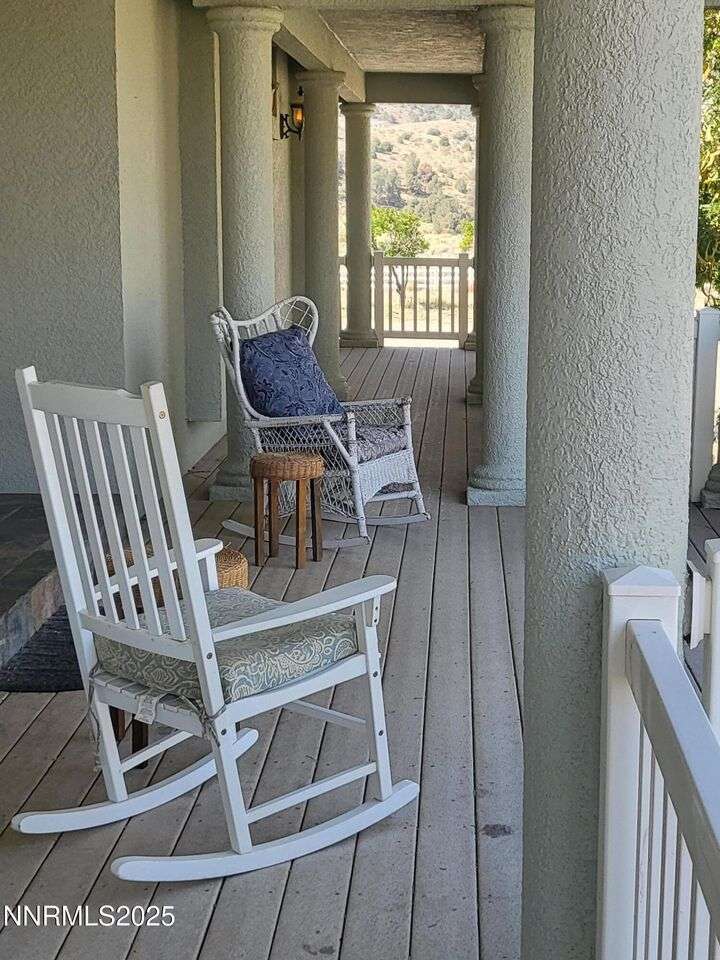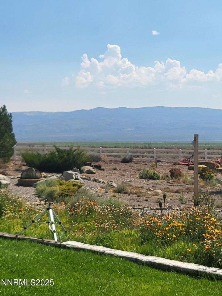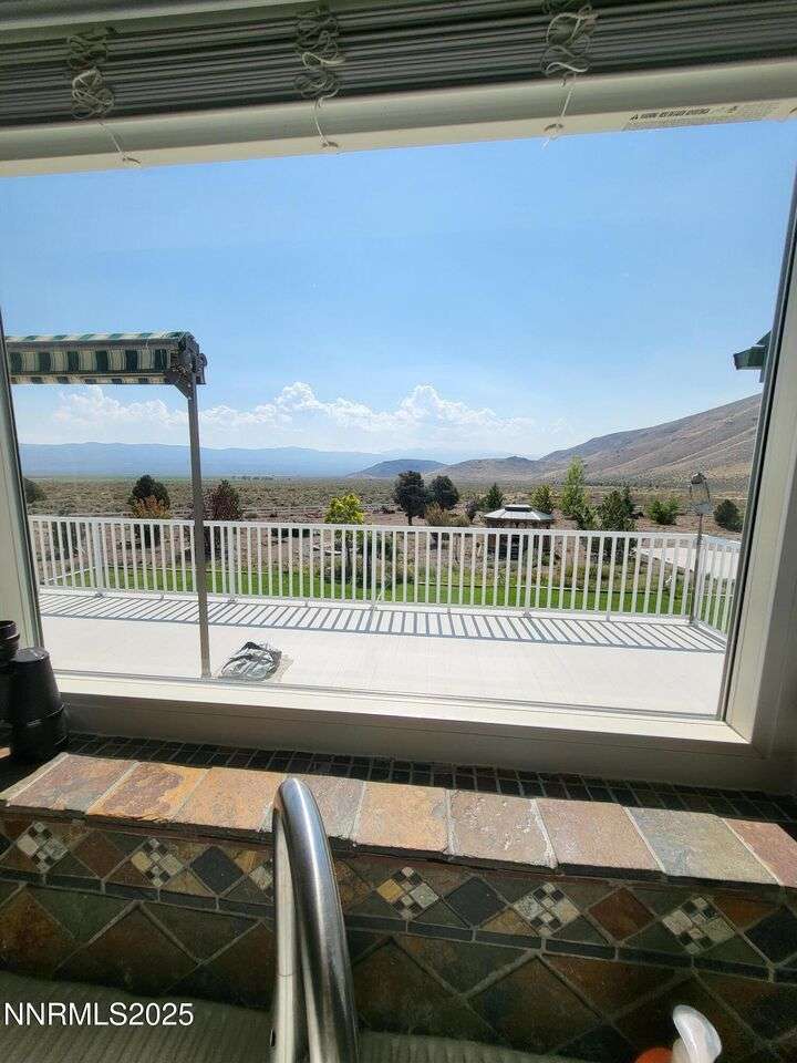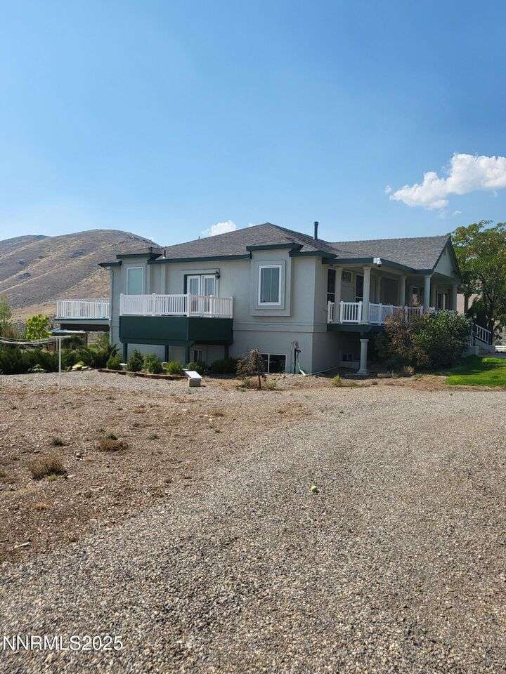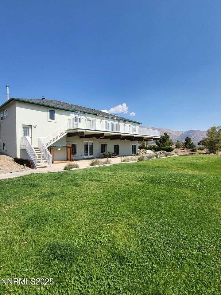 TRULY ONE OF A KIND — a must-see to fully appreciate and believe! Set on 30 private acres with rare 2-acre zoning, this remarkable property offers exceptional versatility, privacy, and value. Built atop a huge walk-out basement, this 5-bedroom home is as sturdy as it is spacious — with thoughtful details and beautiful views in every direction. Inside, you'll find an inviting floor plan featuring a primary suite with its own sitting area, private balcony, and a luxurious spa-style bathroom. The main level also includes an office, guest bedroom, and two generous living spaces — a cozy family room and a formal living room with a gas fireplace for warmth and ambiance. The updated kitchen shines with newer appliances, abundant cabinetry, and a massive walk-in pantry, ideal for the home chef. Fresh exterior paint complements the full stucco finish, giving the home timeless appeal. Outdoor living spaces abound — from the covered composite front deck with views of the orchard and Pinenut Mountains, to the expansive Nexan lockdry rear deck stretching the entire length of the home. The walk-out basement offers incredible flexibility, featuring three additional bedrooms, a craft room with sink, 1.5 baths, a safe room, and ample storage. Step outside to a covered patio and take in the panoramic vistas of the Sweetwater Mountains, green pastures, and endless blue skies. The acreage itself is a dream — immediate 4 acres fenced in vinyl surrounding the home with the balance mostly fenced, plus a shooting range, secondary gated access road, and two Conex storage containers. The property also includes 17 mature fruit trees and 5 cherry trees, offering your own private orchard. Additional highlights include a Generac generator with a dedicated 500-gallon propane tank, and an impressive 2,700 sq. ft. detached garage — featuring a 3-car bay plus a drive-through RV garage for all your vehicles, equipment, and toys. This property is truly one of a kind — offering space, strength, self-sufficiency, and unmatched potential. Don't miss the opportunity to make it yours!
