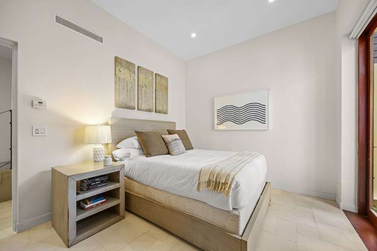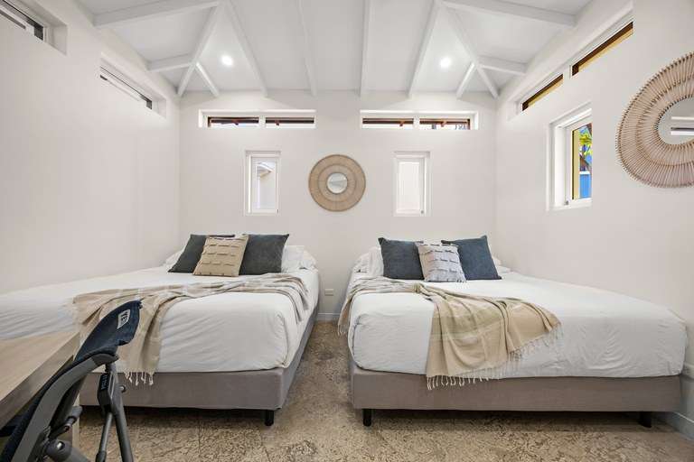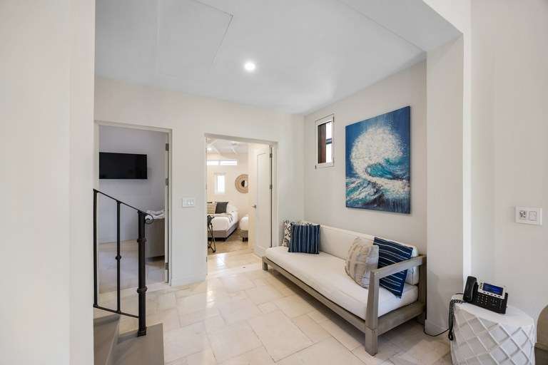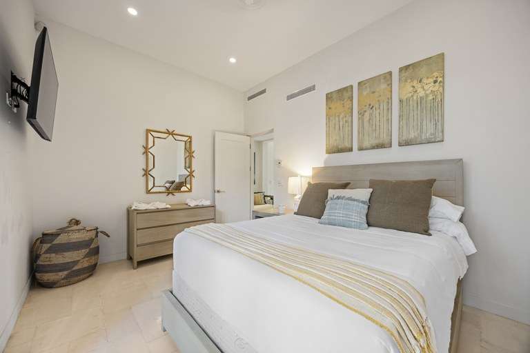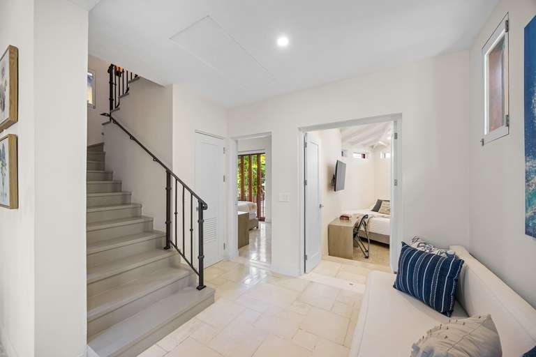 The villa offers four well-appointed bedrooms designed for privacy and flexibility. On the main floor, two spacious guest rooms—one with two king beds and another with a queen—share a full bathroom, ideal for family and guests. Upstairs, a cozy bunk room includes a custom queen and twin layout with its own bathroom, while the luxurious primary suite features a king bed, ensuite bathroom, and tranquil views, offering a restful retreat after sun-soaked beach days.