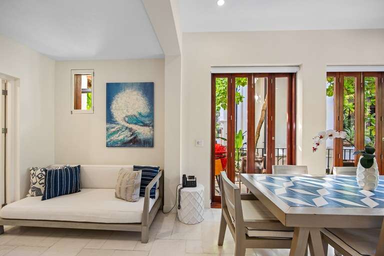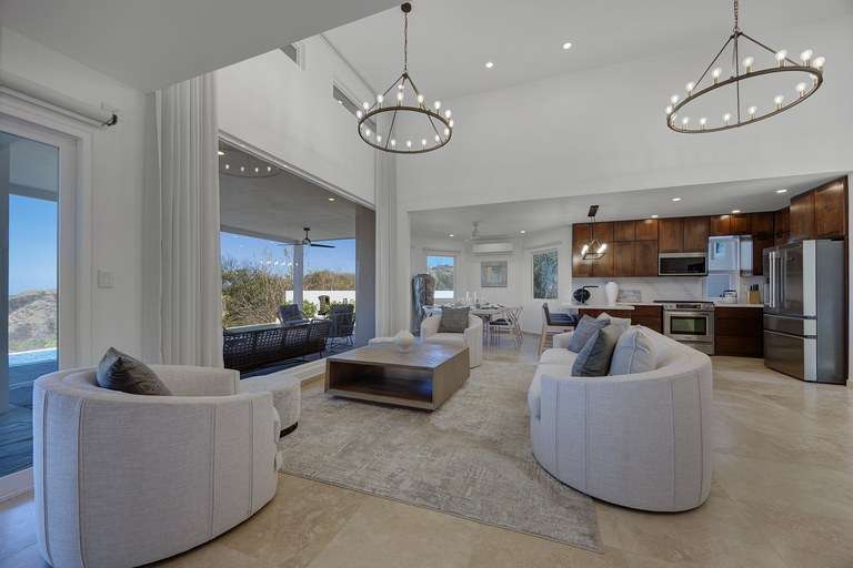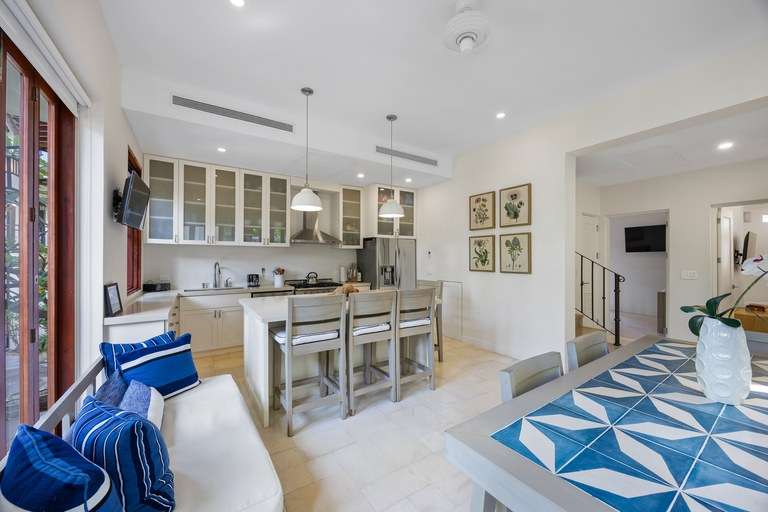 This elegant residence captures the essence of pura vida living. Inside, the open-concept kitchen and dining area offers a warm, welcoming atmosphere with a large island, stainless steel appliances, and custom cabinetry with glass accents. The adjoining dining area is bright and playful, centered around a custom blue-and-white tiled table perfect for lively gatherings and everyday meals.