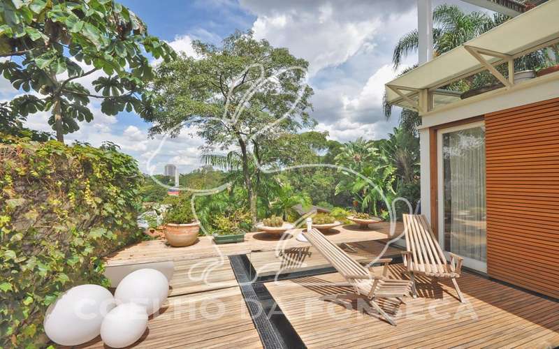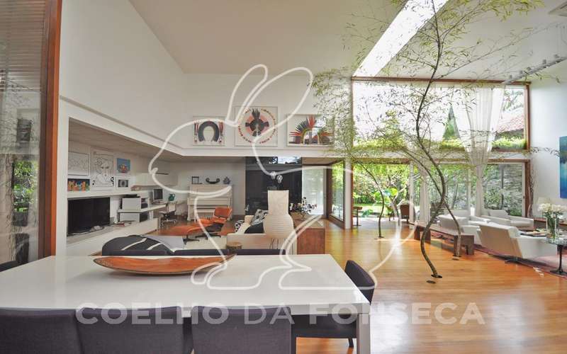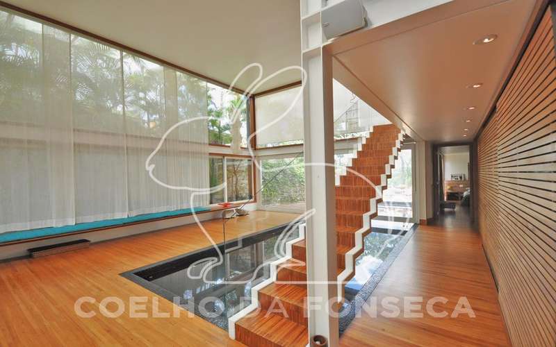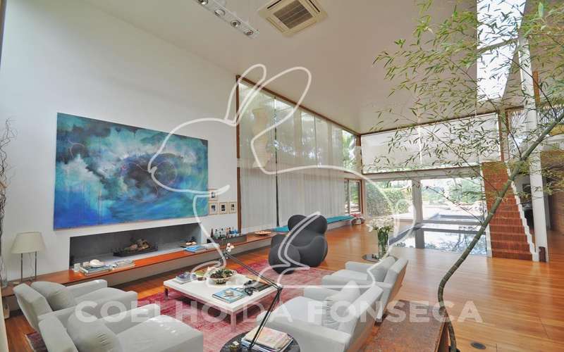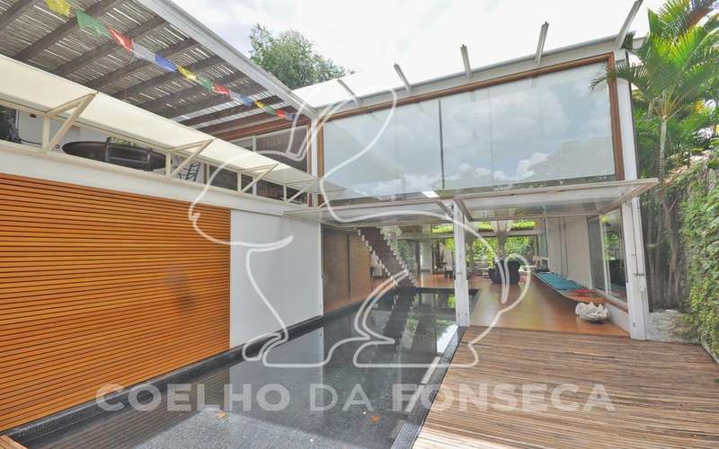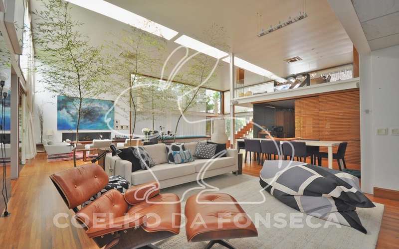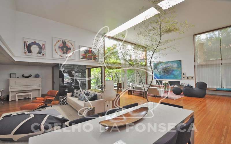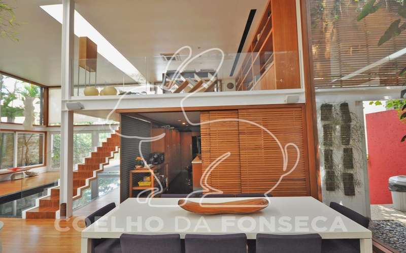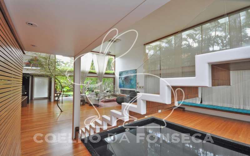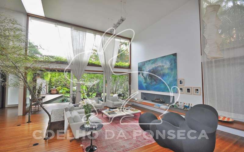 Casa moderna arrojada assinada por Bernardes Jacobsen, que já saiu em várias revistas de arquitetura. Living com pé direito duplo com raia que começa na sala de estar e vai até o jardim com banco de madeira em toda a extensão, cozinha americana em vidrotil com bancadas em corian, equipada, varanda, home theater, suíte master com sala íntima e closet, mezanino com escritório, varanda com deck de madeira e fonte. O subsolo possui duas suítes com closet, sala intima, fitness, dependência de empregada, lavanderia e depósito, lindo jardim. Vale a pena conhecer!