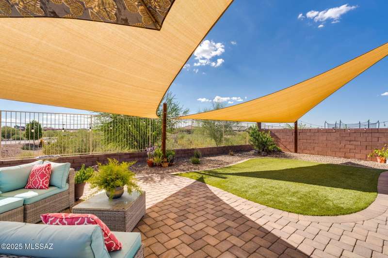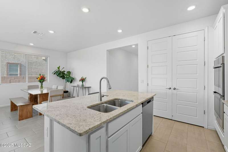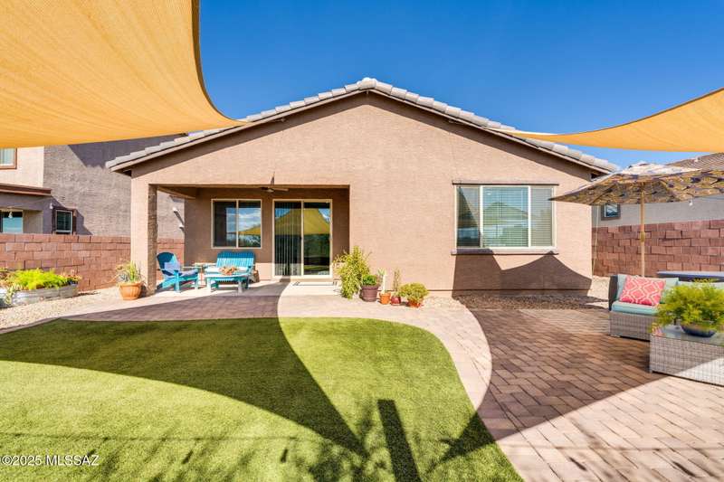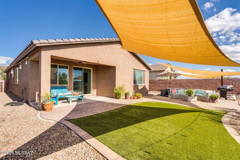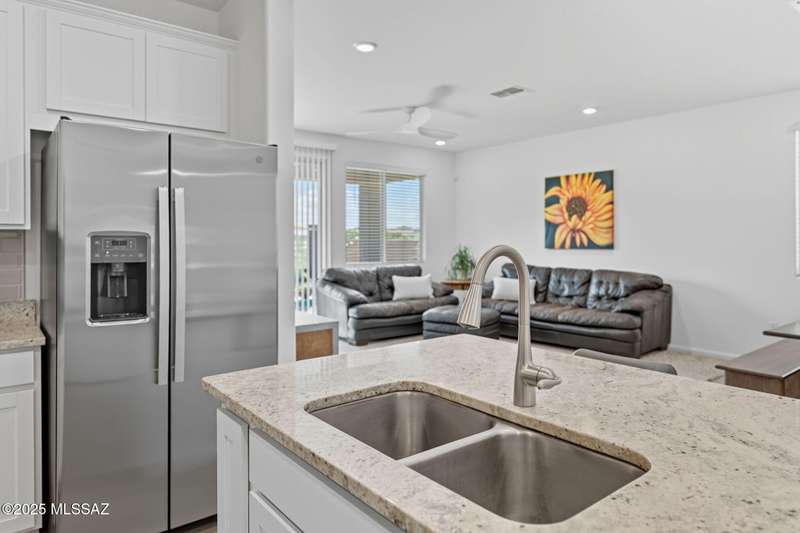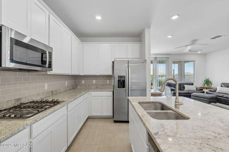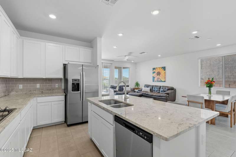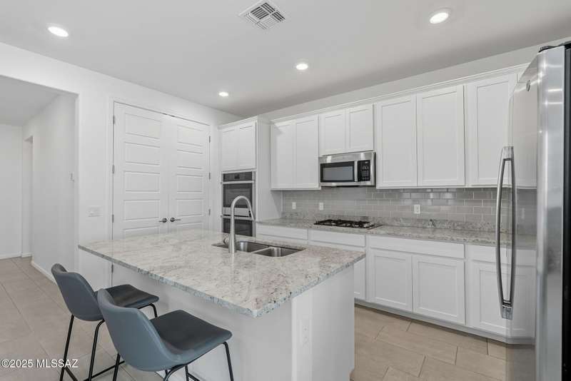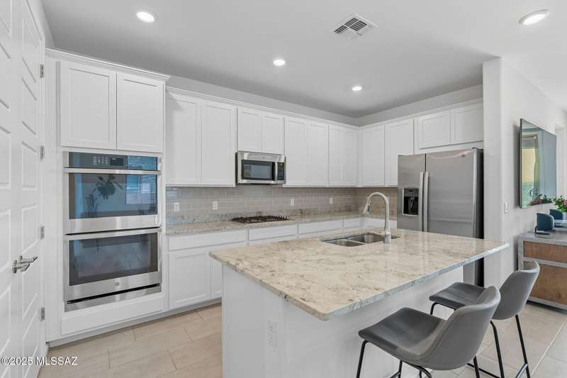 Welcome to this 3 bedroom, 2 bath home with 1,668 sq ft in the gated Rocking K community. Featuring a 3-car tandem garage and a bright open floor plan, this home blends comfort and style. The gourmet kitchen is designed for entertaining with a large island with seating, crisp white cabinetry, granite countertops, tile backsplash, stainless steel appliances, a gas range, double ovens, and a walk-in pantry. The primary suite offers a private retreat with dual vanities, a linen closet, and a walk-in closet. Step outside to your fully landscaped backyard with a covered patio, brick pavers, turf, and vista fencing to take in Arizona's stunning sunsets. Located within walking distance of The Award- Winning Vail School District's newest K-8 school, Saguaro Creek. Lots of community amenities.