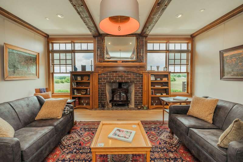 Set on a tranquil 5-acre estate, this 6-bedroom, 6-bath arts-and-crafts style home, built 13 years ago, captivates with European-inspired design. Thoughtful details--wood siding, brick accents, copper gutters, private decks, and a Juliet balcony--frame stunning views from every window, inviting exploration of each uniquely crafted room.Inside, oak hardwood floors, wood beams, and 8 ft custom doors complement soaring ceilings and expansive windows. A floor-to-ceiling brick fireplace anchors the main living area. The main-floor kitchen features handcrafted oak cabinets, granite countertops, a high-end gas range, and stainless steel appliances. The second-floor primary suite boasts Alder wood floors, vaulted ceilings, and a luxurious bath with a walk-in shower and soaking tub, all with breathtaking views.The lower level offers herringbone black brick flooring, a second full kitchen with granite countertops and stainless steel appliances, and an open living area with a fireplace framed by windows. A covered patio off the lower level overlooks fields with stunning sunsets.A landscaped paver patio creates an inviting outdoor space for gatherings. With a private bathroom for each bedroom, two spacious living areas, two full kitchens, and ample parking, this estate is perfect as a refined family home or a potential bed and breakfast. Discover elegance and serenity in this exceptional retreat.
