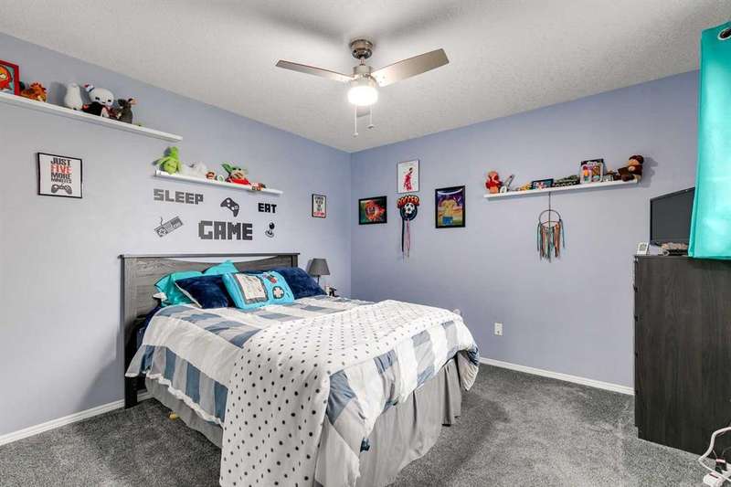 This thoughtfully cared-for home combines comfort with a touch of refined living. The main floor offers a separate front living room anchored by a beautiful stone-faced fireplace, an inviting feature that sets a warm and elegant tone. The kitchen blends practicality and style with oak cabinetry, a centre island, corner pantry, a window over the sink overlooking the backyard, and flows seamlessly into the spacious dining area. A 2-piece bath, laundry, and mudroom complete this level. Upstairs, the primary suite feels like a private retreat with its walk-in closet and 4-piece ensuite, while two additional bedrooms share a full bathroom. A custom built-in desk in the upper hallway provides a dedicated space for work or study. Outside, the fenced backyard includes raised garden beds and a side garden, offering a wonderful ready made space to start your own garden. The oversized driveway and double attached garage provide ample parking. Ideally located in the family-friendly community of Crossfield, this home is just one block from a local park and within minutes of schools, shops, and recreational amenities—while only a short drive to Airdrie or Calgary.