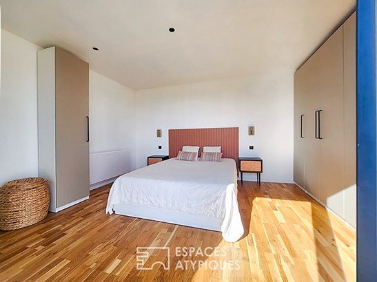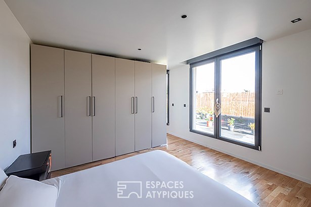 The custom-designed metal staircase leads to the second floor. This level, recently added to the building, features an office space and an 18 m2 (190 sq ft) master bedroom that opens directly onto the terrace. A true haven of tranquility, this recently landscaped outdoor space has become a living space in its own right, suspended above the city and conducive to moments of sharing as well as more intimate moments.
