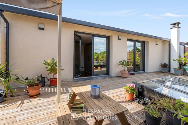 Located in Bondy Sud, just 400 meters from the RER E and the future metro line 15, this 131.55 m2 (Carrez law) townhouse stands out with its unique character and a 58 m2 (58 sq ft) rooftop terrace, a truly private, secluded haven.