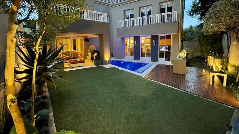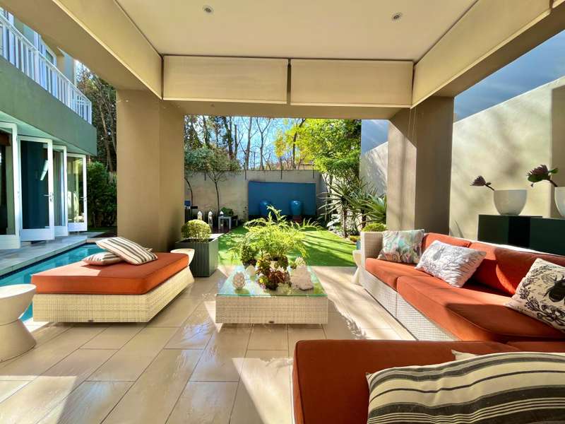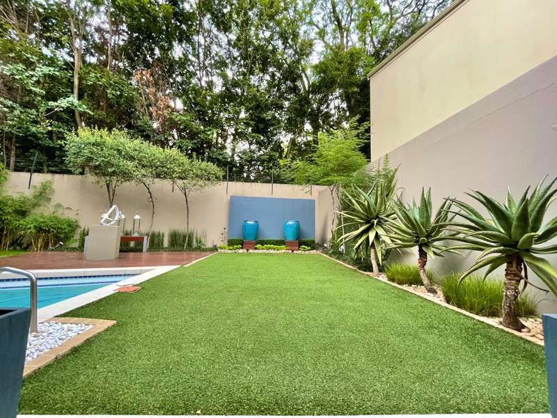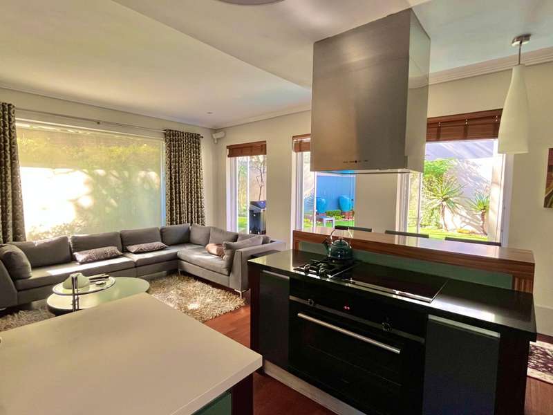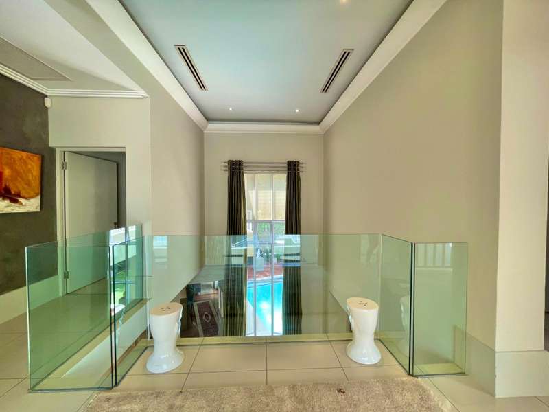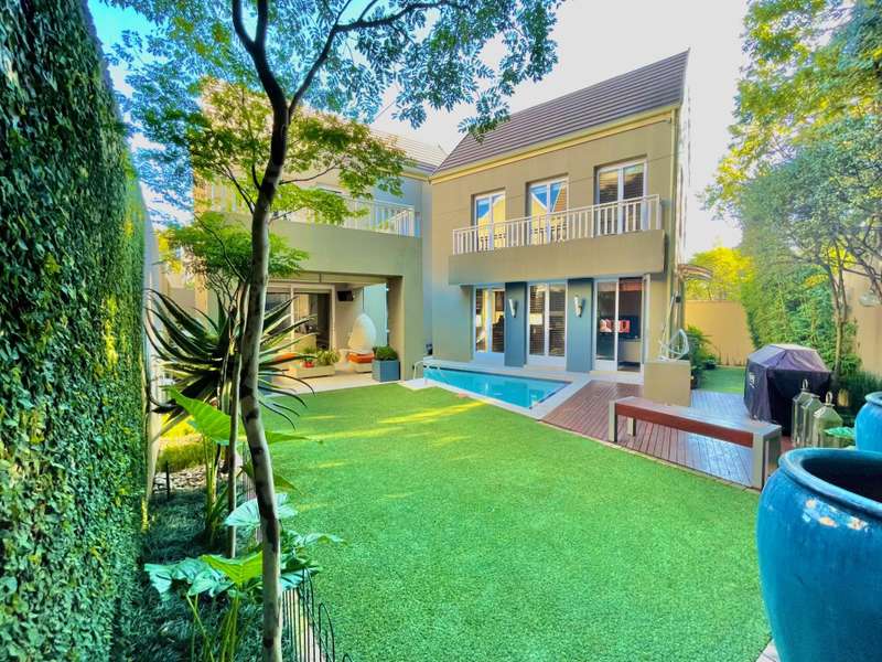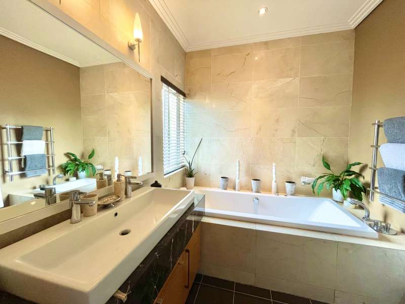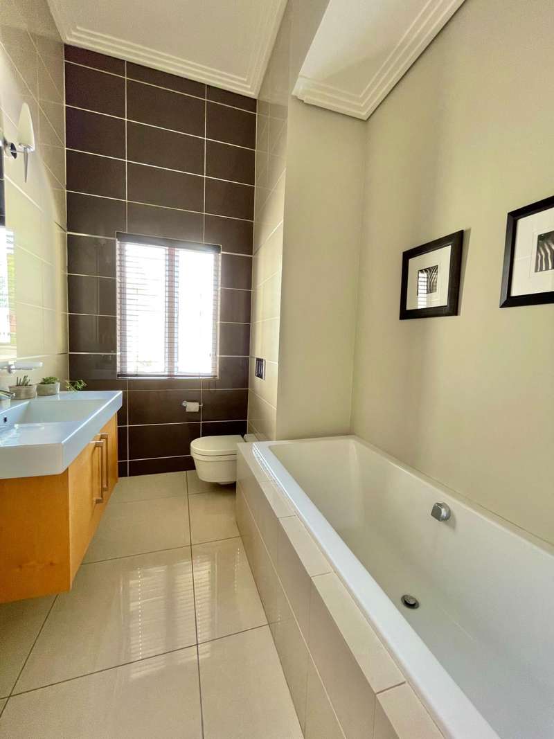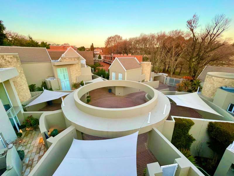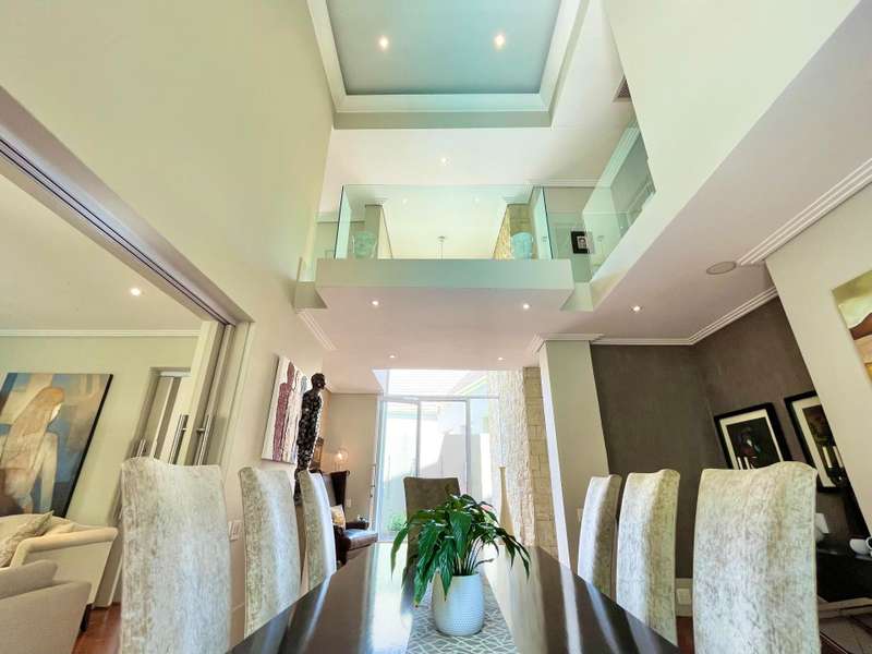 Introducing an architectural marvel envisioned by Krynauw Nel, this 4-bedroom en-suite townhouse epitomizes opulence and refinement. Impeccable craftsmanship is evident in every corner, with lavish details enhancing its allure. Upon entering the grand double-volume foyer, the residence bathes in natural light through expansive windows, infusing warmth into its elegant ambiance. A masterpiece in its own right, the grand circular staircase commands attention, leading to a three-car garage below or a walkway bridge connecting to the bedrooms above. Each bedroom is a sanctuary of tranquility, ensuring utmost privacy for its occupants. The master suite boasts a spacious layout, complemented by a modern, sophisticated bathroom and an integrated dressing room. At the heart of this abode lies a bespoke kitchen, equipped with premium appliances, seamlessly merging with an open-plan living area. A separate scullery and laundry add practicality to the space. The dining room and formal living room extend to a covered veranda, overlooking a serene garden and a glistening swimming pool, offering a perfect setting for gatherings or relaxation. Security is paramount, with top-tier measures ensuring peace of mind and a "lock-up-and-go" lifestyle. Furthermore, a full backup solar system ensures uninterrupted power while championing sustainability. This townhouse transcends mere living; it's a testament to prestige and modern living. For those who appreciate life's finer nuances, this property is unparalleled. Don't miss the chance to own this extraordinary piece of real estate, where luxury, comfort, and eco-consciousness converge seamlessly. Situated on a tree lined road, with easy access to the park with it's newly built walking path, it is also close to the cosmopolitan Dunked West Centre and its bakery, cafes and other shops. Contact us today to arrange a viewing and discover the pinnacle of contemporary living, complete with amenities such as a separate scullery/laundry, air cooling system, central vacuum system, and dedicated security guard.