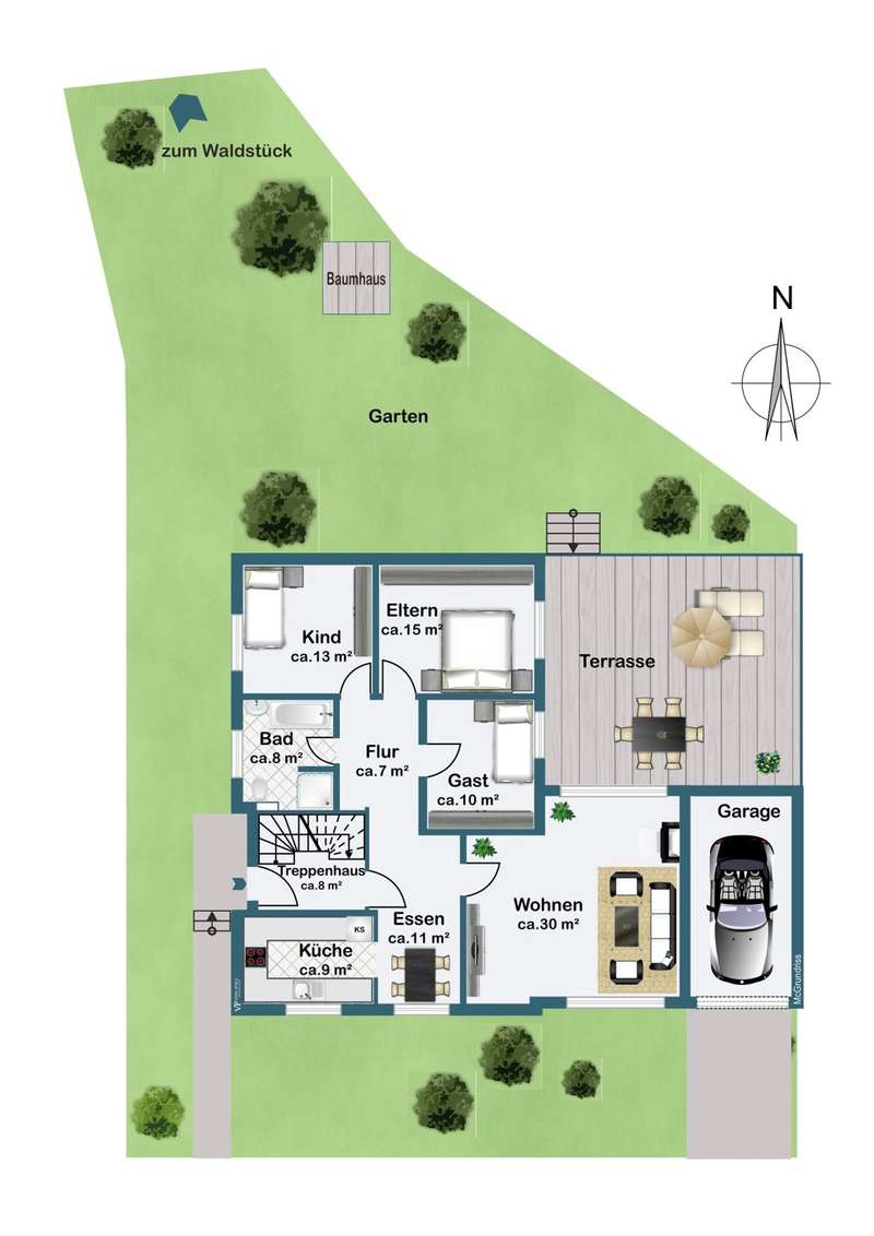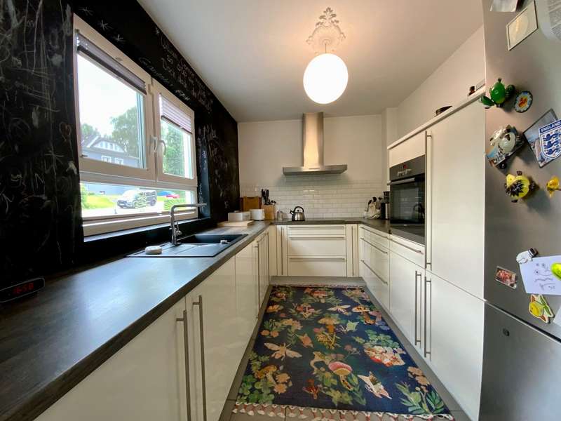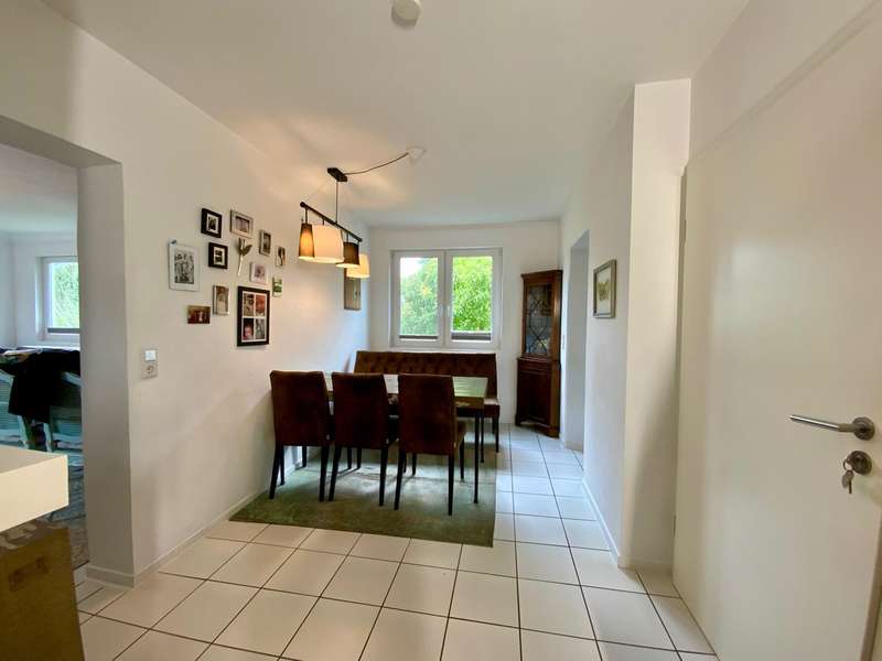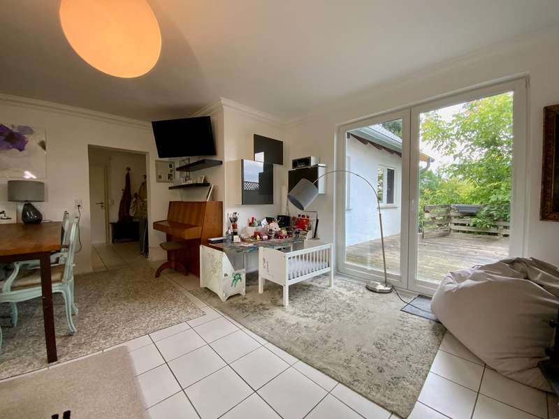 Welcome to a special opportunity for those looking for a modern home close to nature. The apartment is located on the first floor of a completely renovated two-family house. The upper floor is used sporadically by the owner as an office, so you are guaranteed privacy in your everyday life. The garage and the entire garden with adjoining woodland are for your exclusive use - just like in your own home! With a living space of approx. 113 m², an appealing room concept and the large garden, this rental offer is particularly suitable for couples and families with one or two children. Following extensive refurbishment in 2013, the property offers contemporary living comfort and impresses with numerous furnishing details that ensure a pleasant living experience. Upon entering the apartment, you are greeted by the spacious hallway, which also offers enough space for a seating area and from which all rooms lead off. The modern kitchen is equipped with high-quality built-in appliances and offers plenty of storage space. Family-friendliness is emphasized by the three well-designed bedrooms, which can be used flexibly as a master bedroom, children's room, study or guest room. The spacious bathroom with bathtub and walk-in shower has underfloor heating and towel heating for a pleasant indoor climate. The heart of the home is the generously proportioned living room, which is equipped with a wood-burning stove and therefore promises cozy hours. From here you have direct access to the large terrace with plenty of space for seating. A staircase leads from the terrace to the impressive garden plot with a tree house and a small wooded area - a rare opportunity for living close to nature. Allergy sufferers benefit from windows with pollen screens, while high-quality pleated blinds on all windows offer additional sun and privacy protection. Technically, the apartment is ideally equipped with a modern heat pump and a photovoltaic system - a contribution to the conservation of resources and economic efficiency. Internet users will be delighted with the Wi-Fi included in the rent, which will soon be made even more attractive by a stable fiber optic connection. Further convenience is guaranteed by the garage included in the rental price, which offers secure parking for your car and additional storage space. Further parking spaces are available in front of the garage and on the street. The property has a full basement. Around half of the basement area is allocated to the first floor apartment. There is enough space here for a washing machine and dryer. There is also a heated cellar room of around 27 m² for hobbies. If desired, various furnishings, such as the piano, can remain in the apartment for use free of charge. We look forward to hearing from you to arrange an individual viewing appointment.