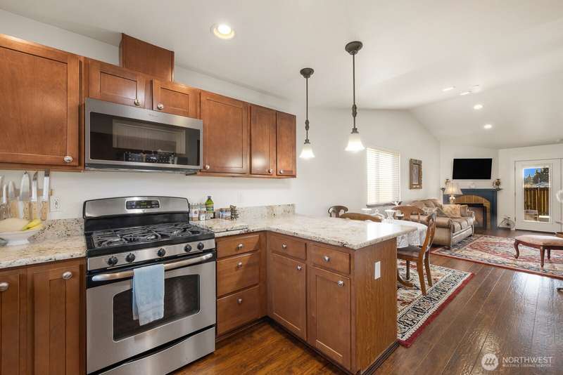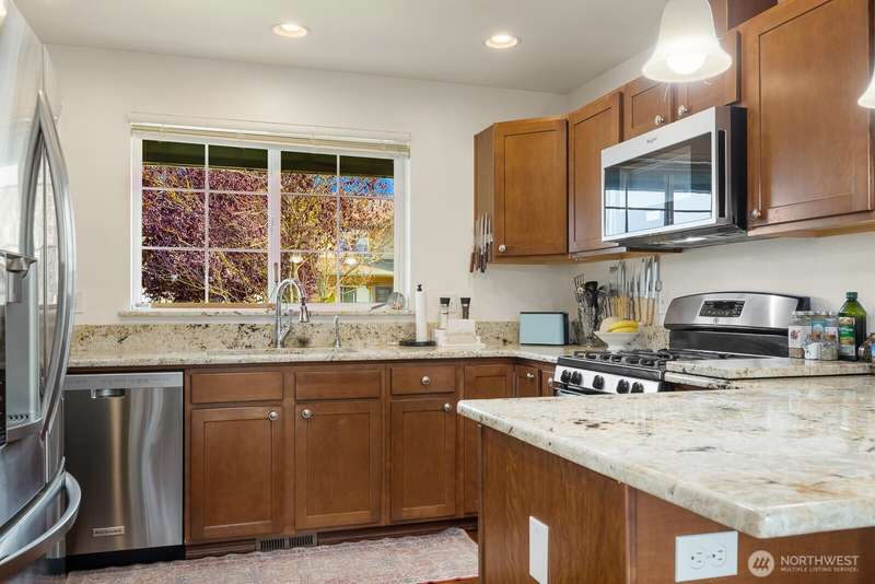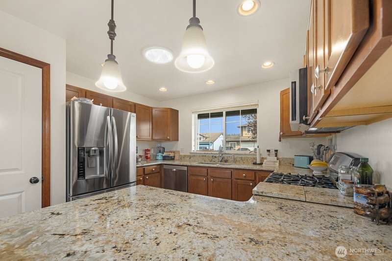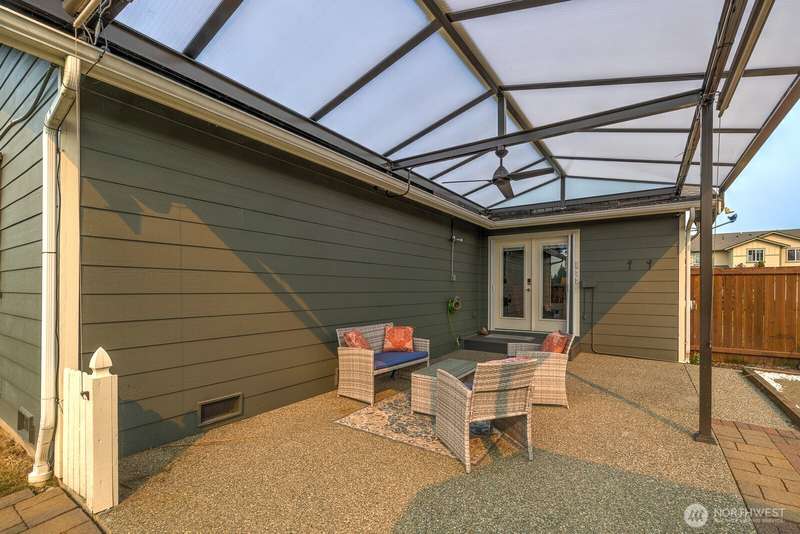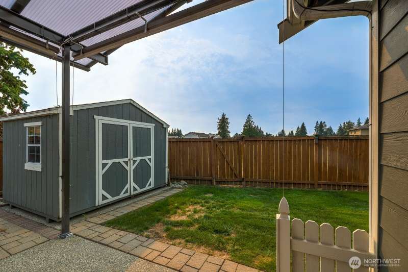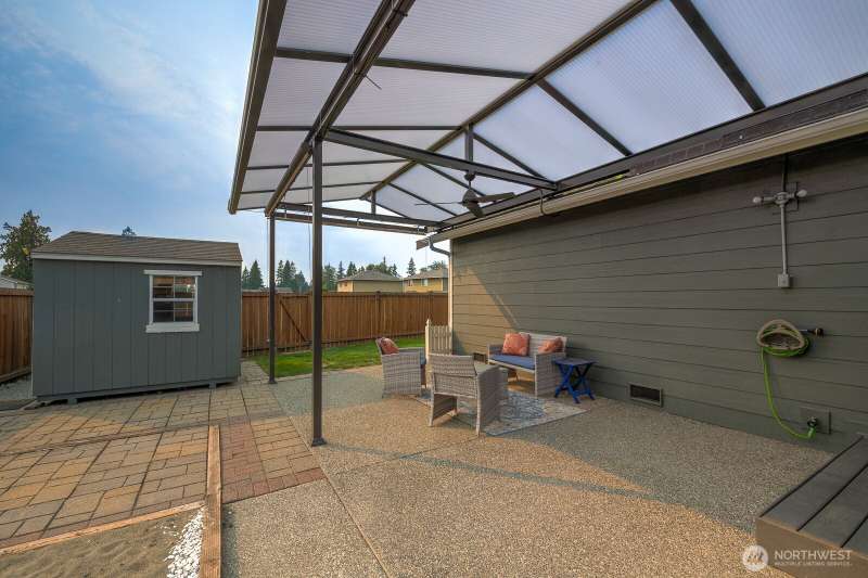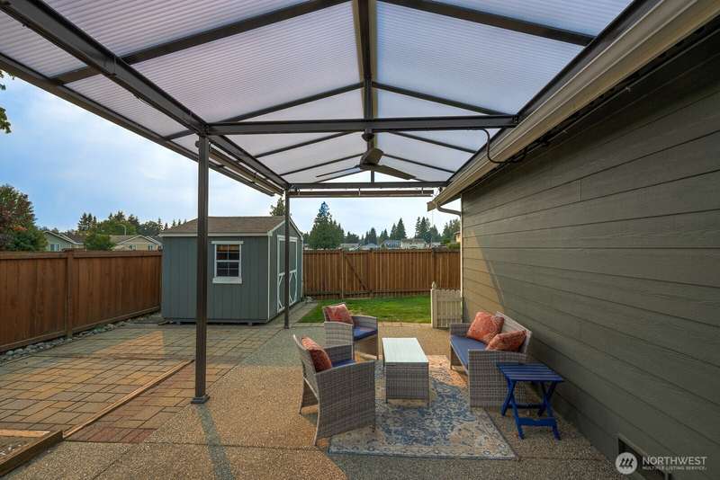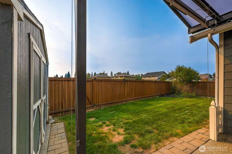 Delightful 3 bedroom rambler with all the bells & whistles. Better than new! Situated on an amazing lot with direct access to the field & park + a covered patio, shed & fenced yard. Inside a beautiful kitchen with stainless & granite, and an open floor plan w/vaulted ceilings, 4 skylights & fireplace. The primary is spacious with walk-in-closet + 5 piece bath. Smart home & security features, high-end ceiling fans & blinds—including powered blinds in bedrooms, outdoor powered screens on back bedrooms, powered awnings on patio, motion detectors. All appliances stay. AIR CONDITIONING + wired for generator. Walkable neighborhood, less than a mile to the high school + all the amenities nearby. A well-cared for & charming place to call home.